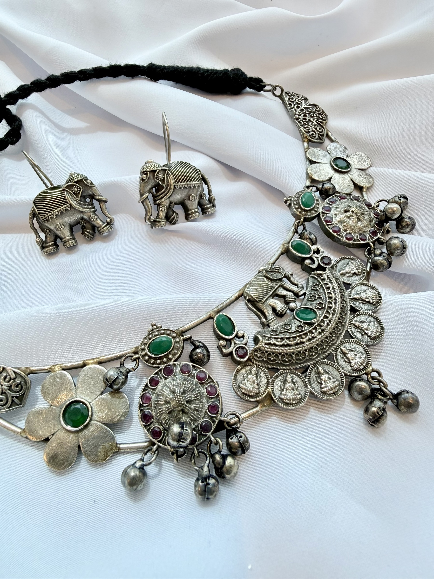 Oxidized silver statement choker set with adjustable thread thread and comes with matching pair earrings.
