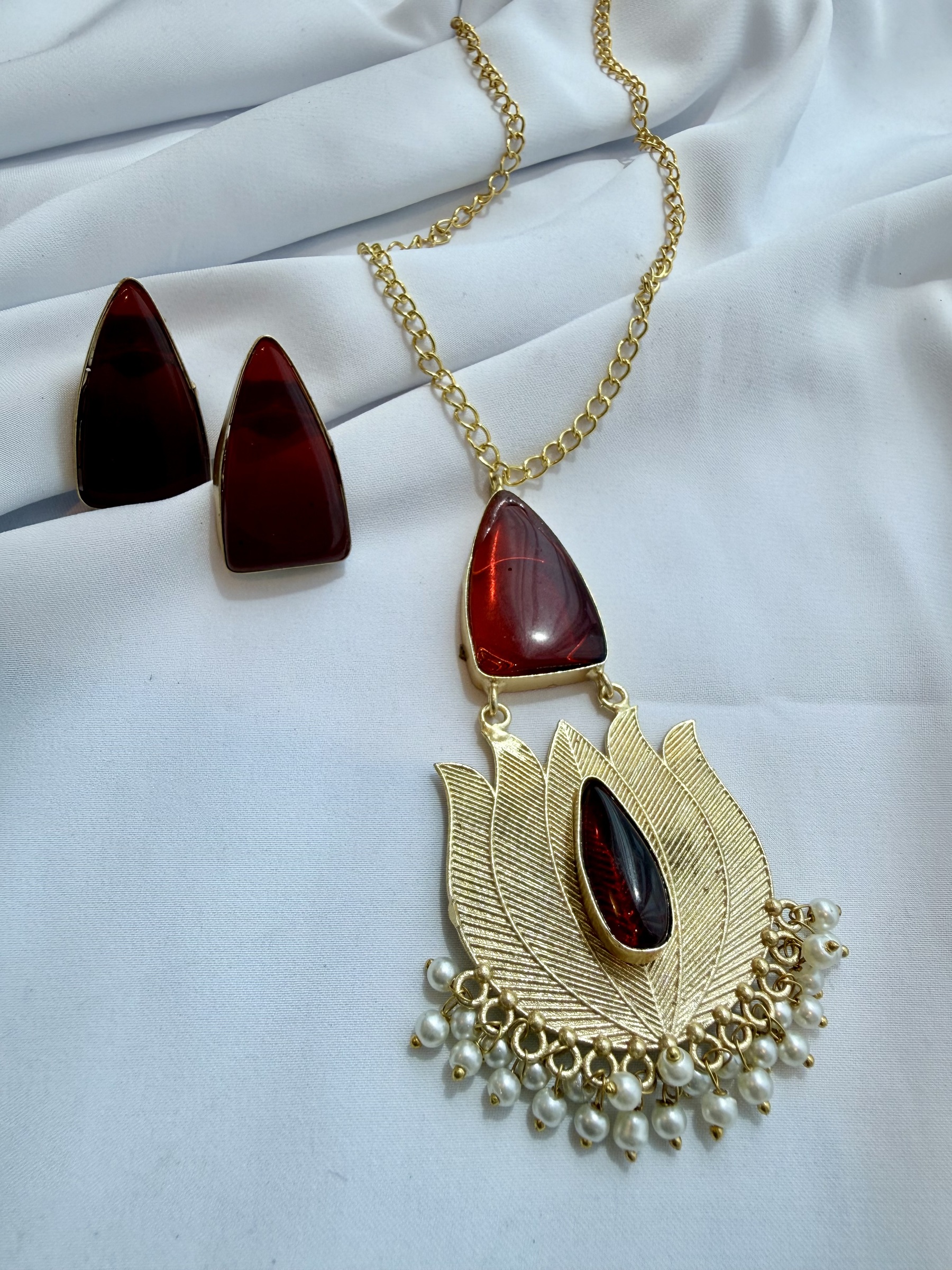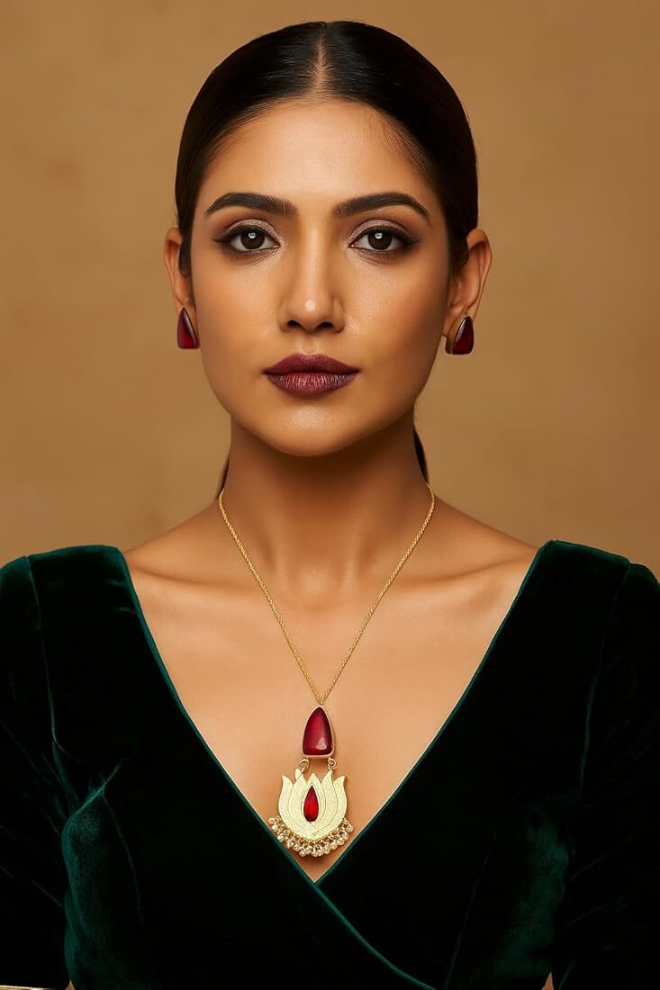 Gold tone chain necklace with statement lotus motif pendant and comes with matching earrings.