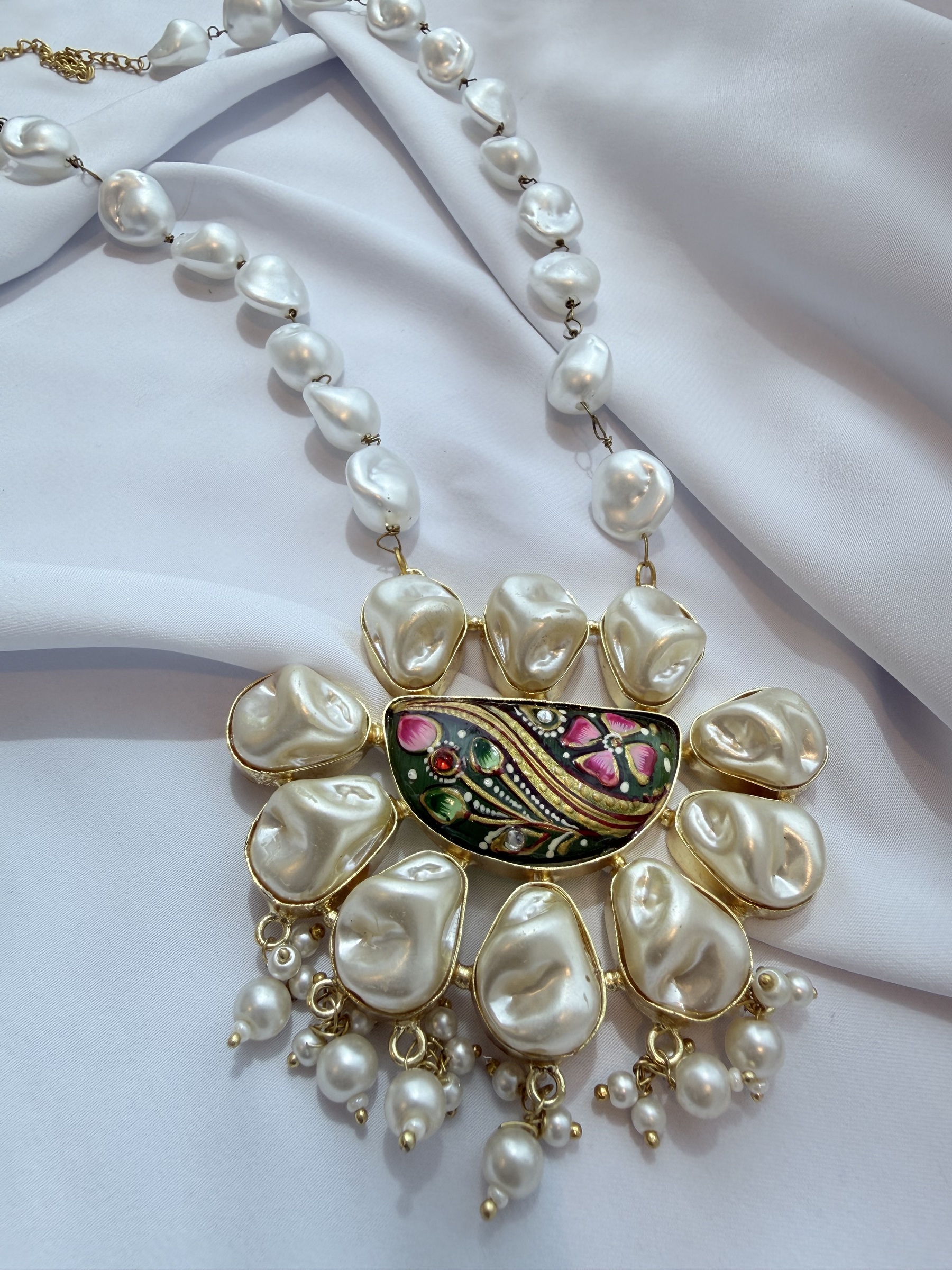 Baroque style artificial pearl long necklace.