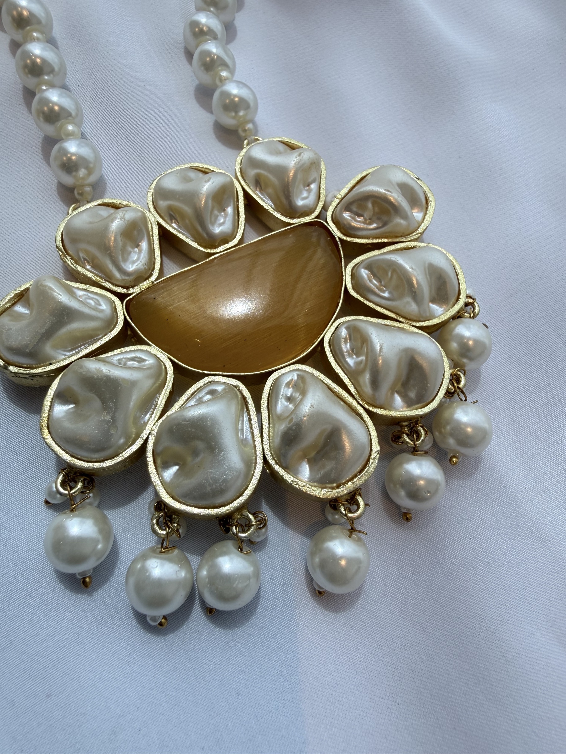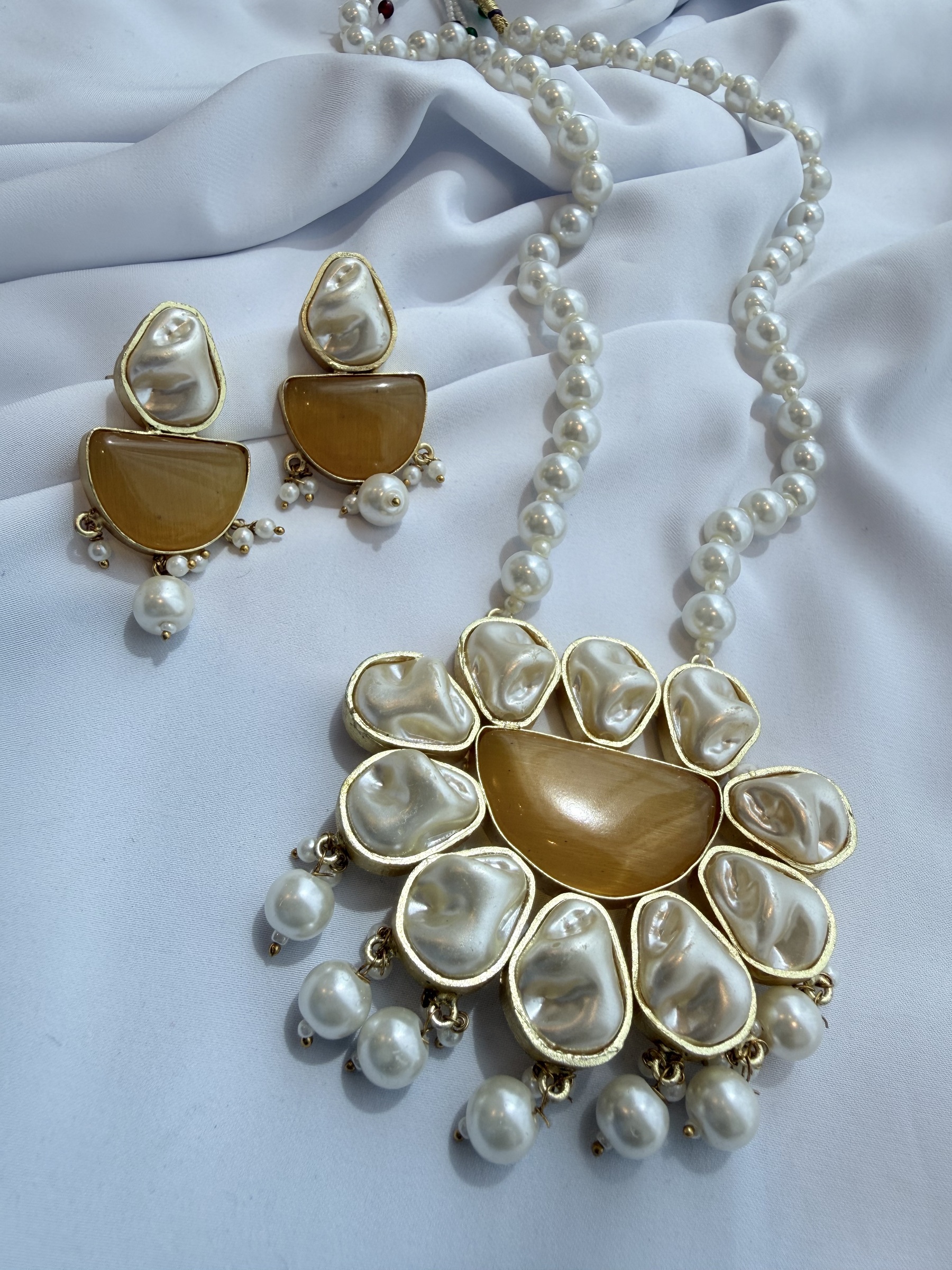 Baroque style artificial pearl long necklace with matching earrings.