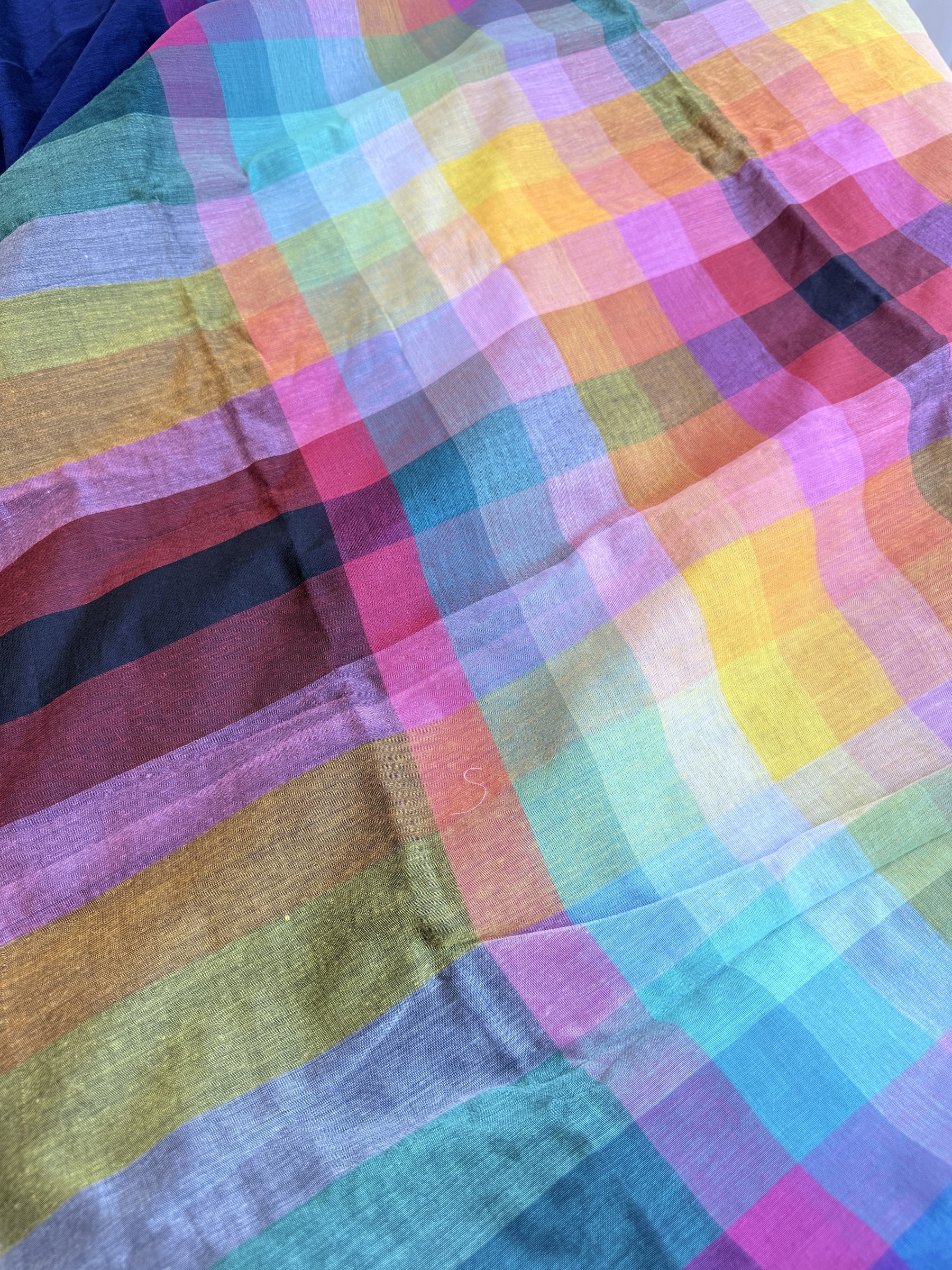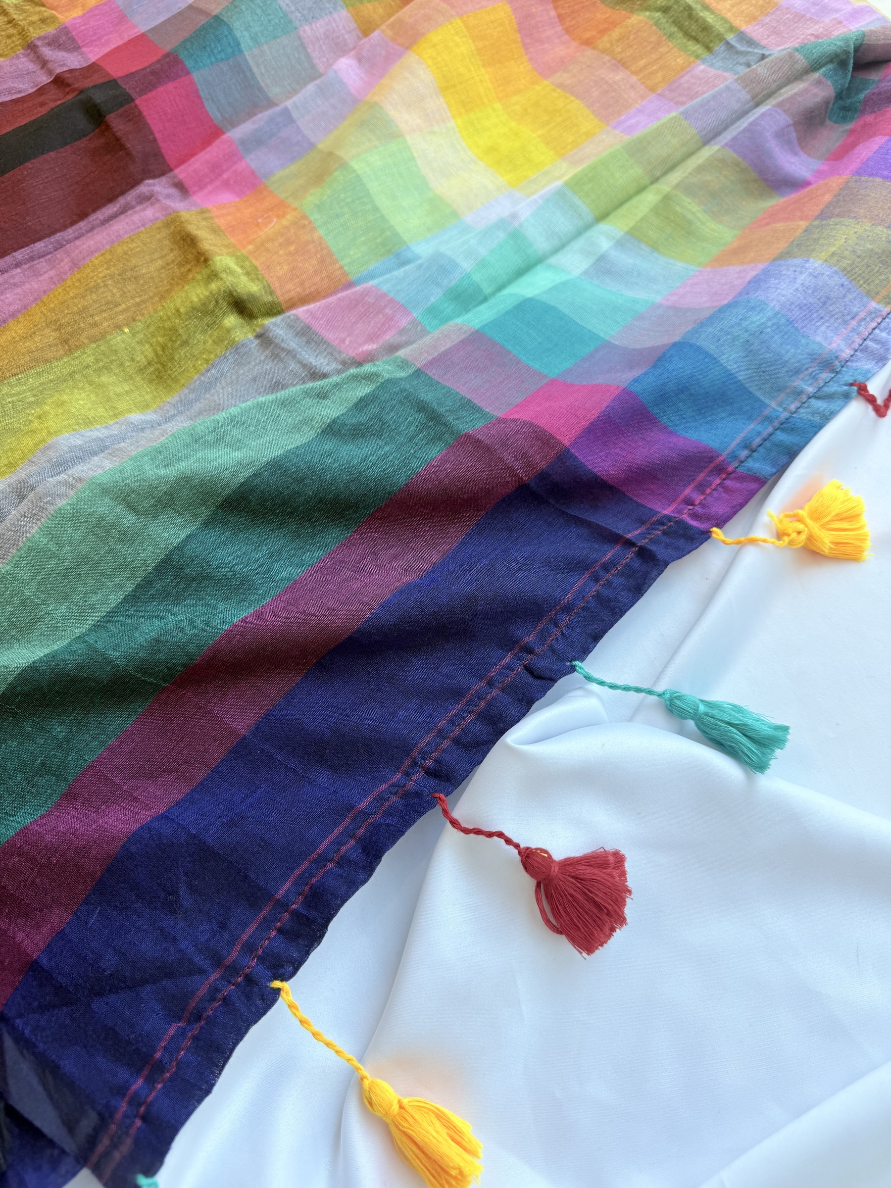 Soft and lightweight pure Mulmul cotton saree with multicolour horizontal stripes design on body and checks design on pallu and comes with colourful pompoms on pallu.