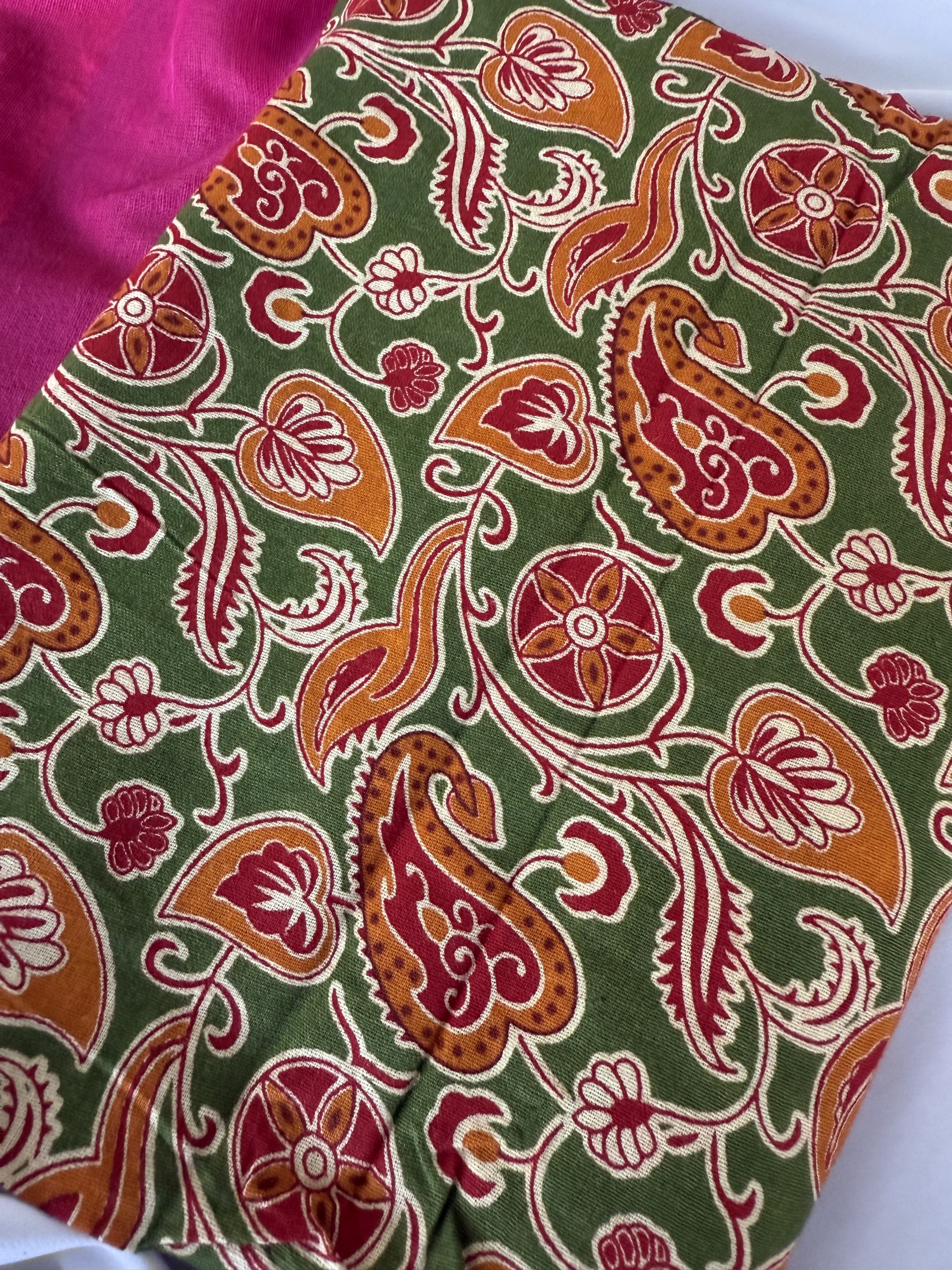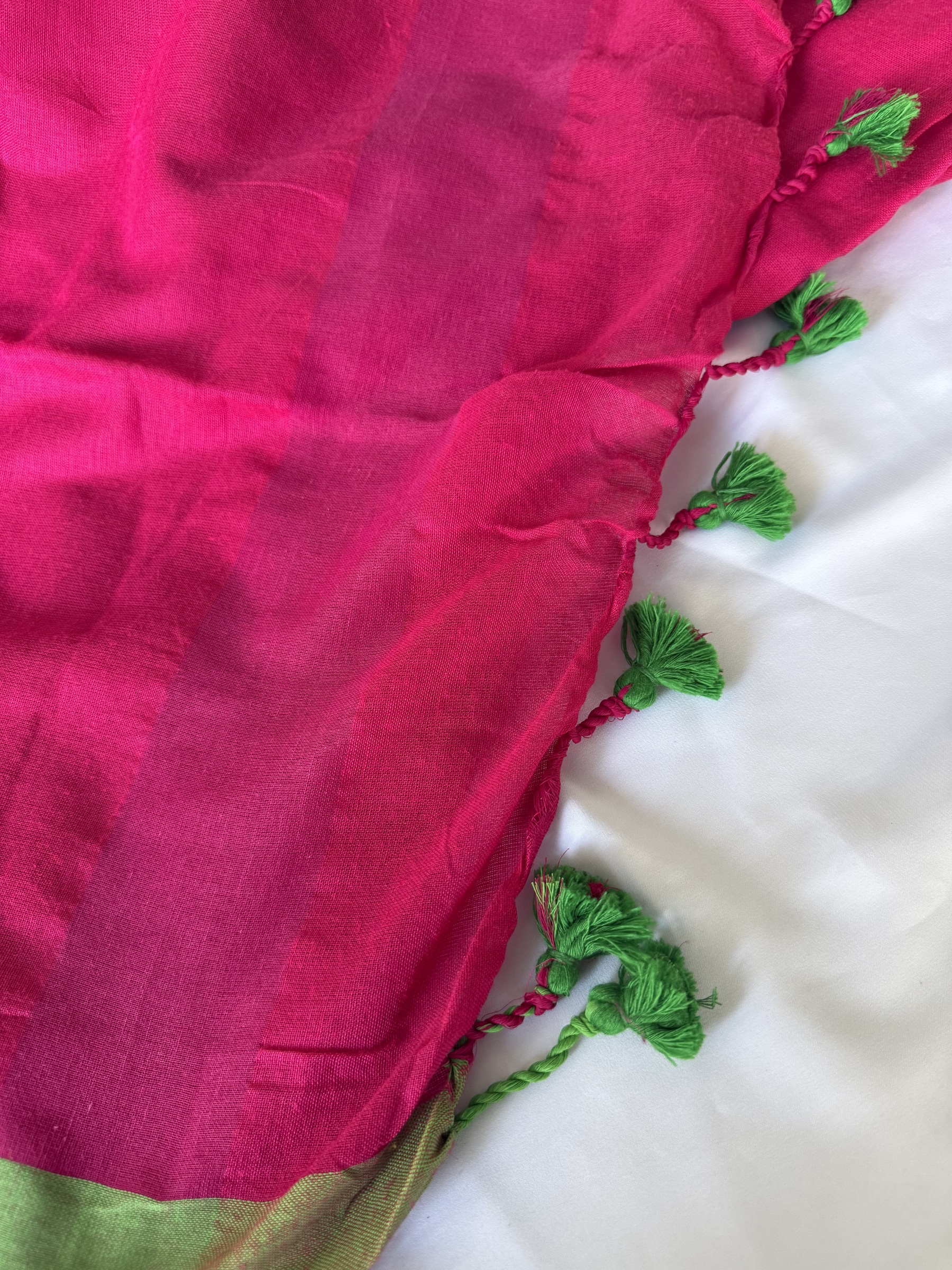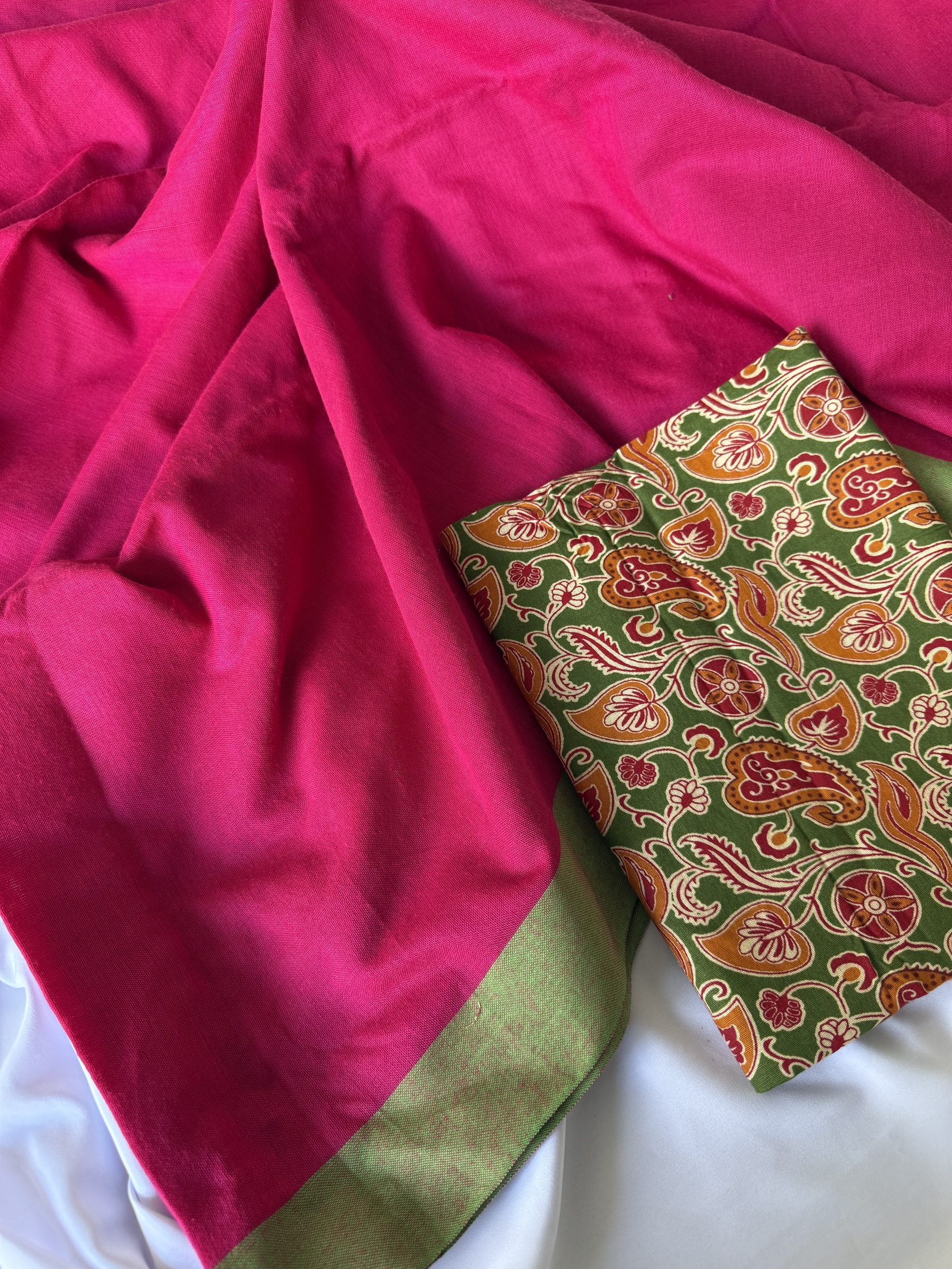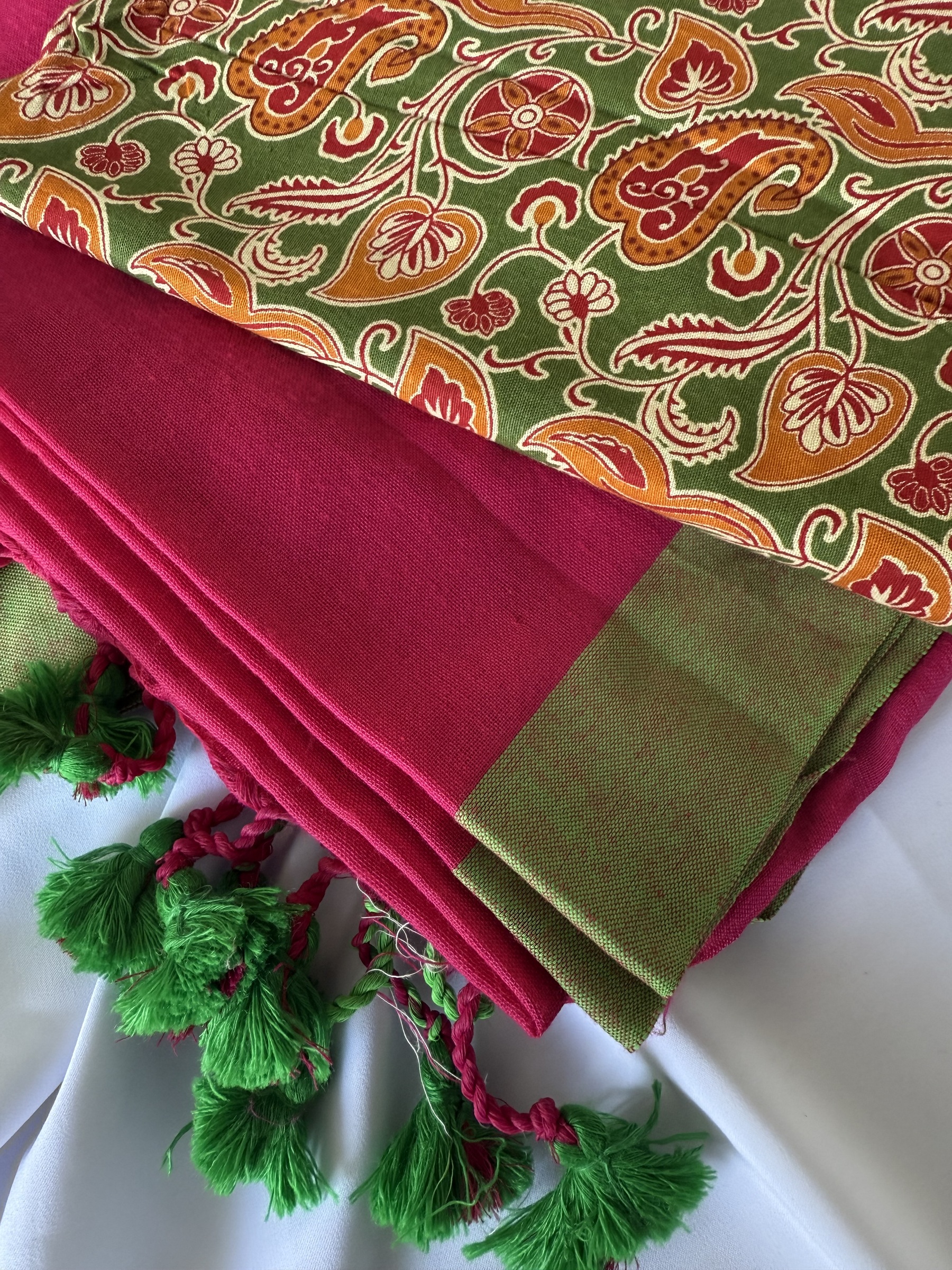 Mulmul cotton saree with contrast colour pallu with running colour blouse material & additional printed cotton design blouse material.