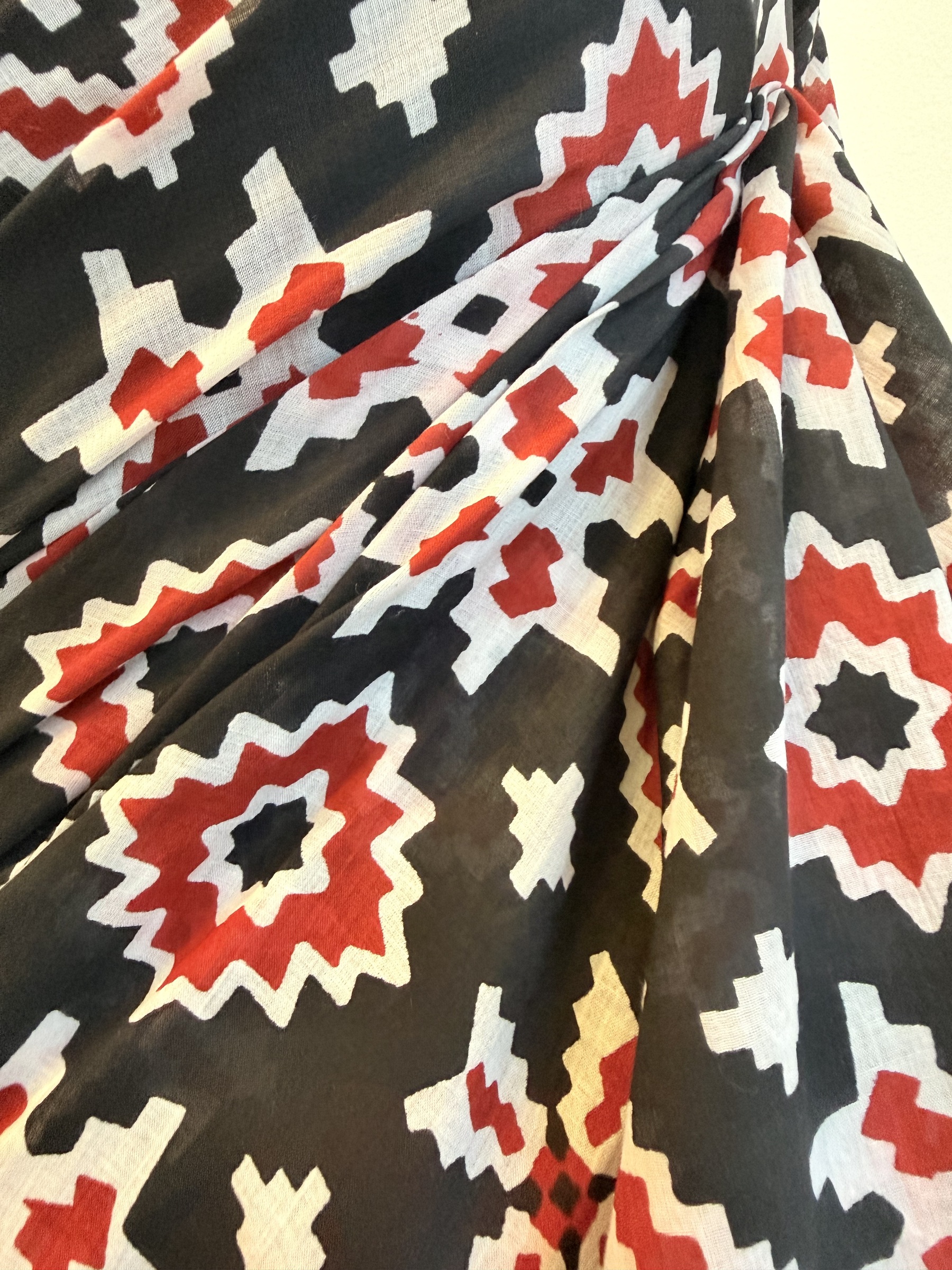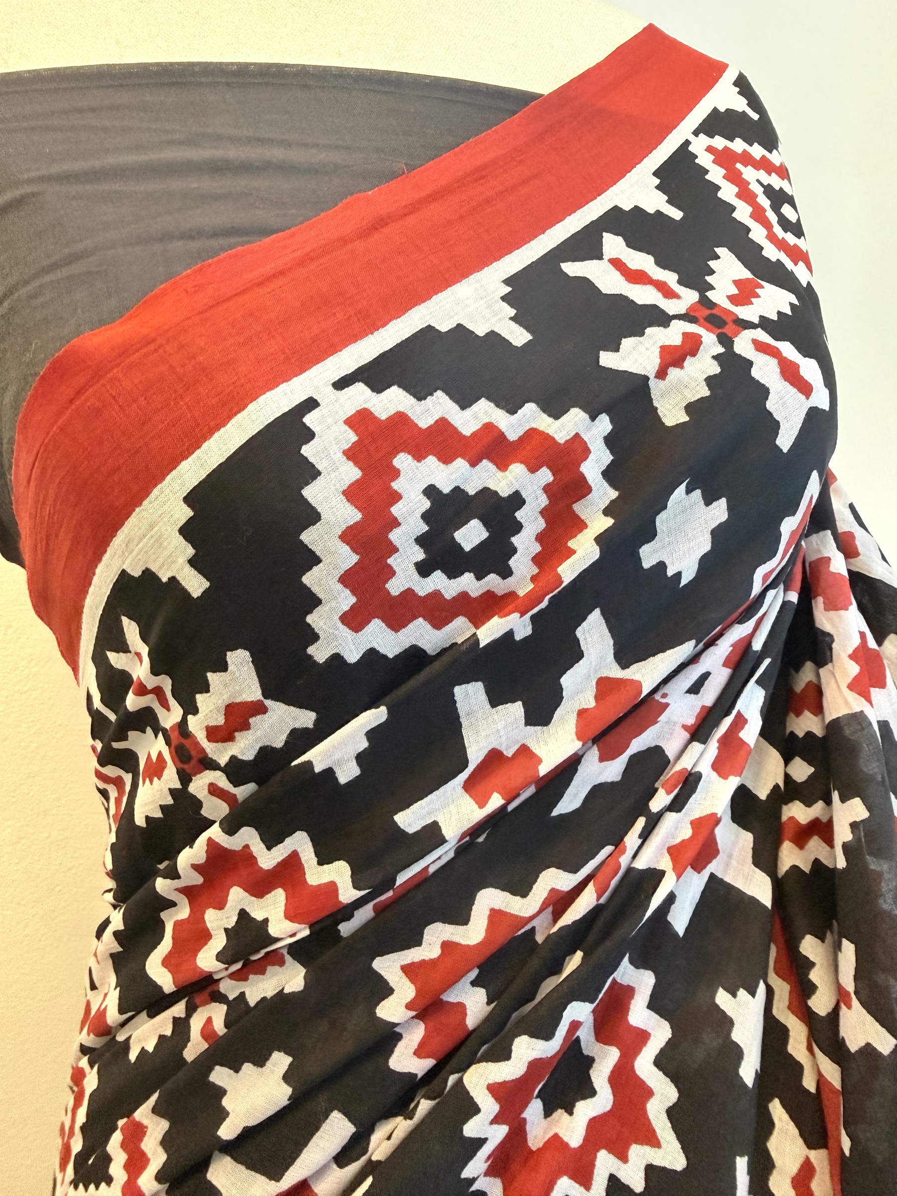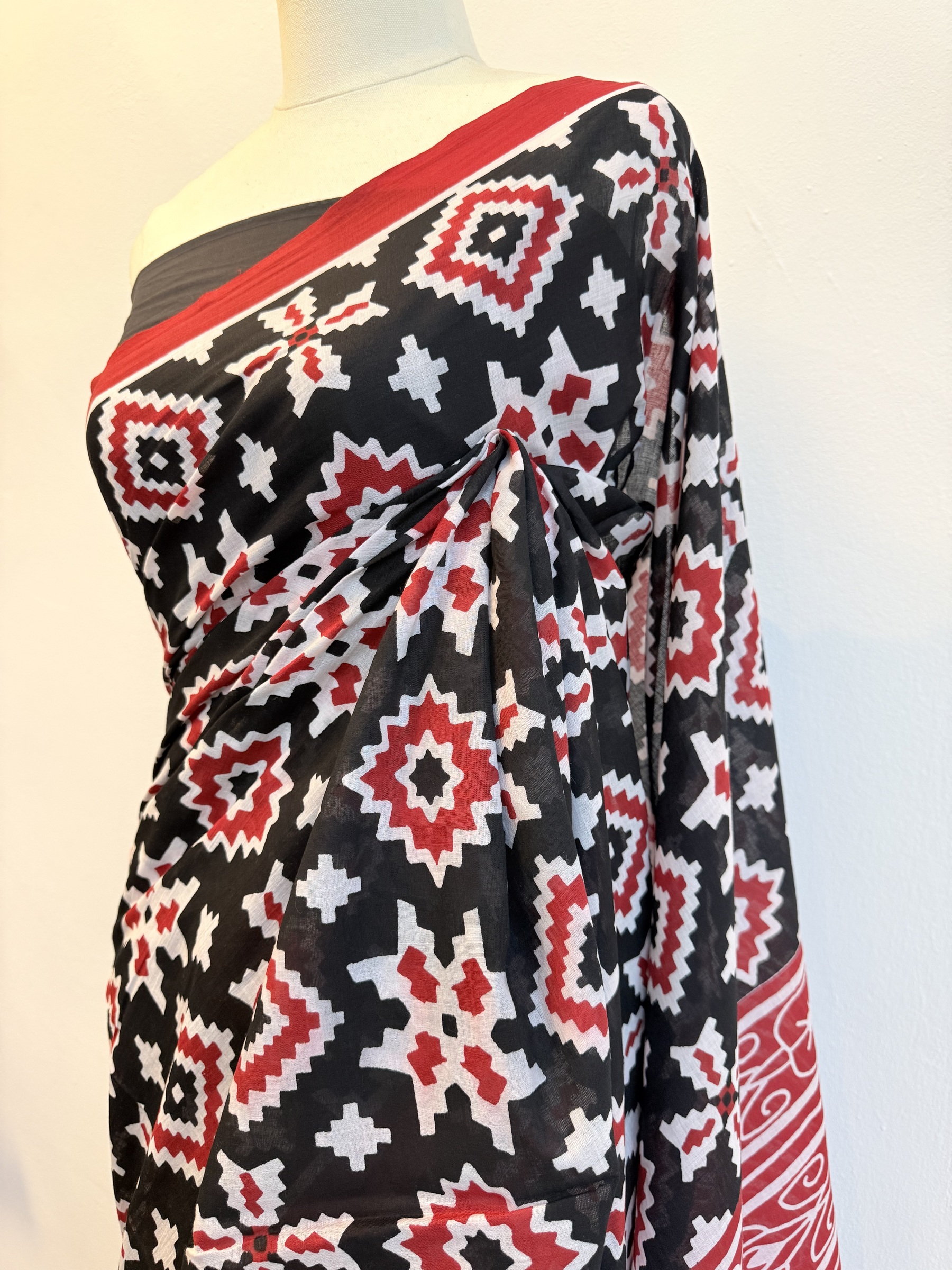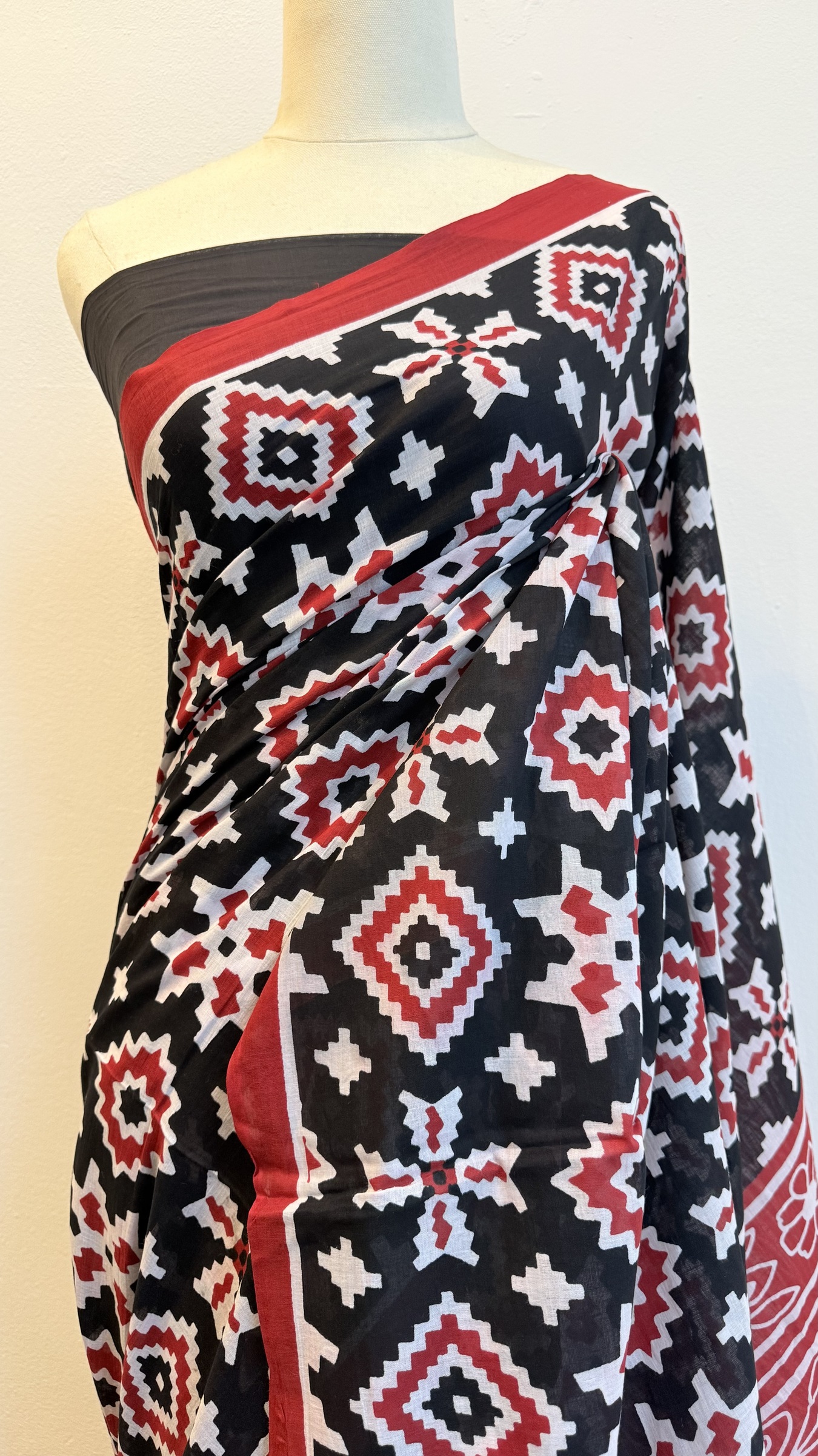 Ethnic design printed soft cotton saree with plain black blouse material.
