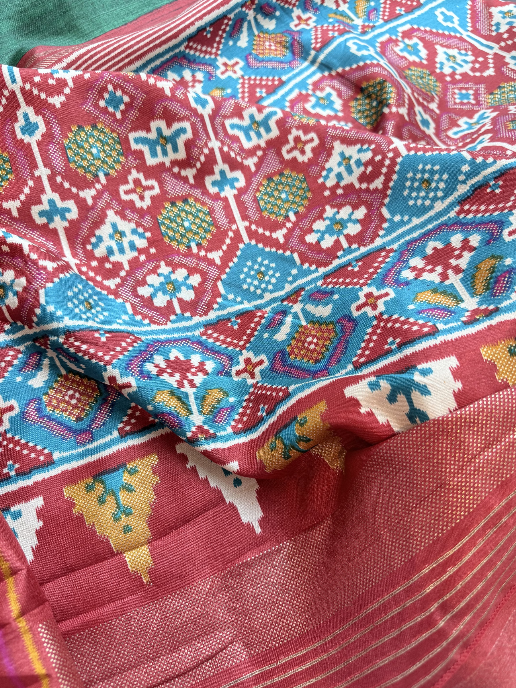 Soft and easy to drape mixed crepe silk saree with Patola design inspired design on body, contrast border & contrast design pallu and comes with attached contrast design blouse material (refer to the second last picture for blouse material picture).