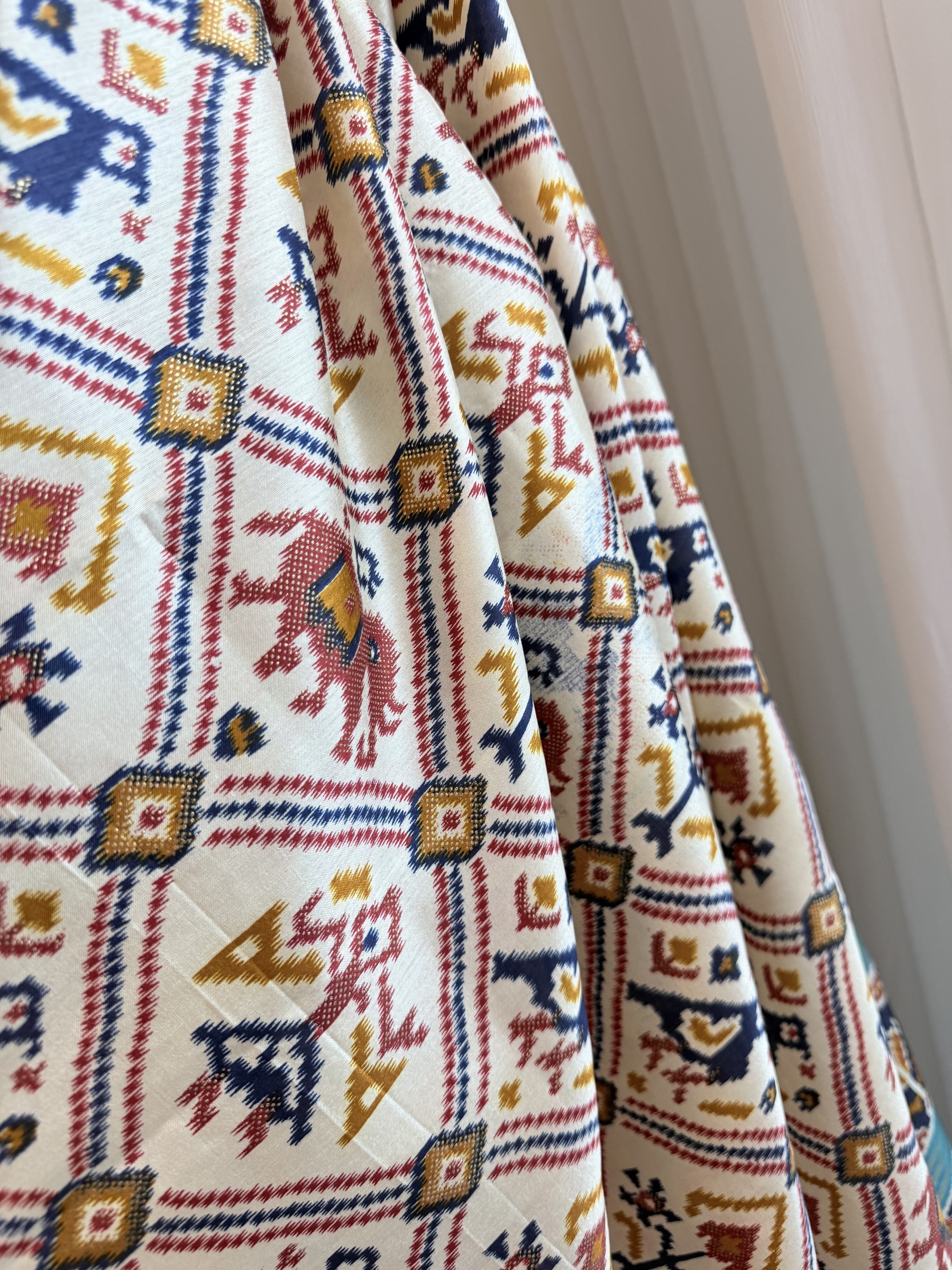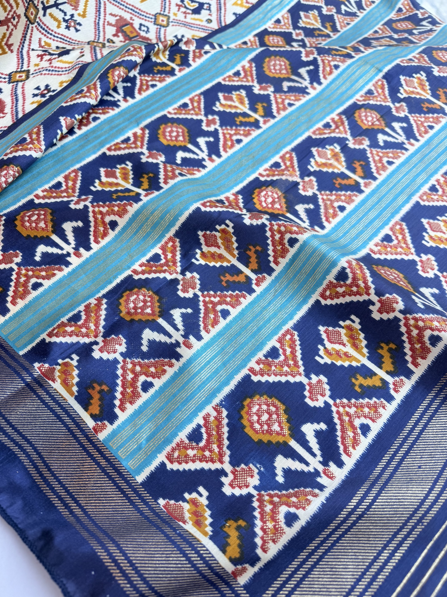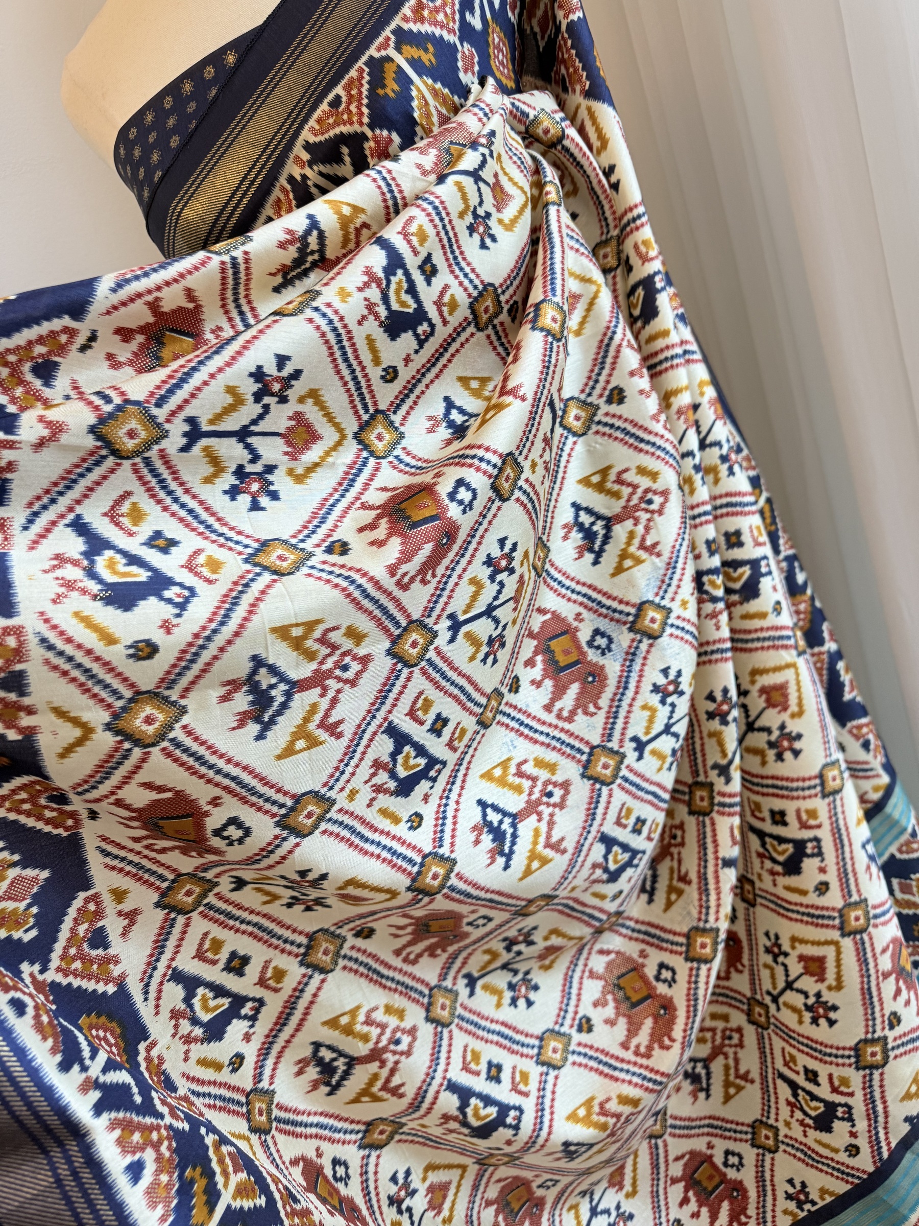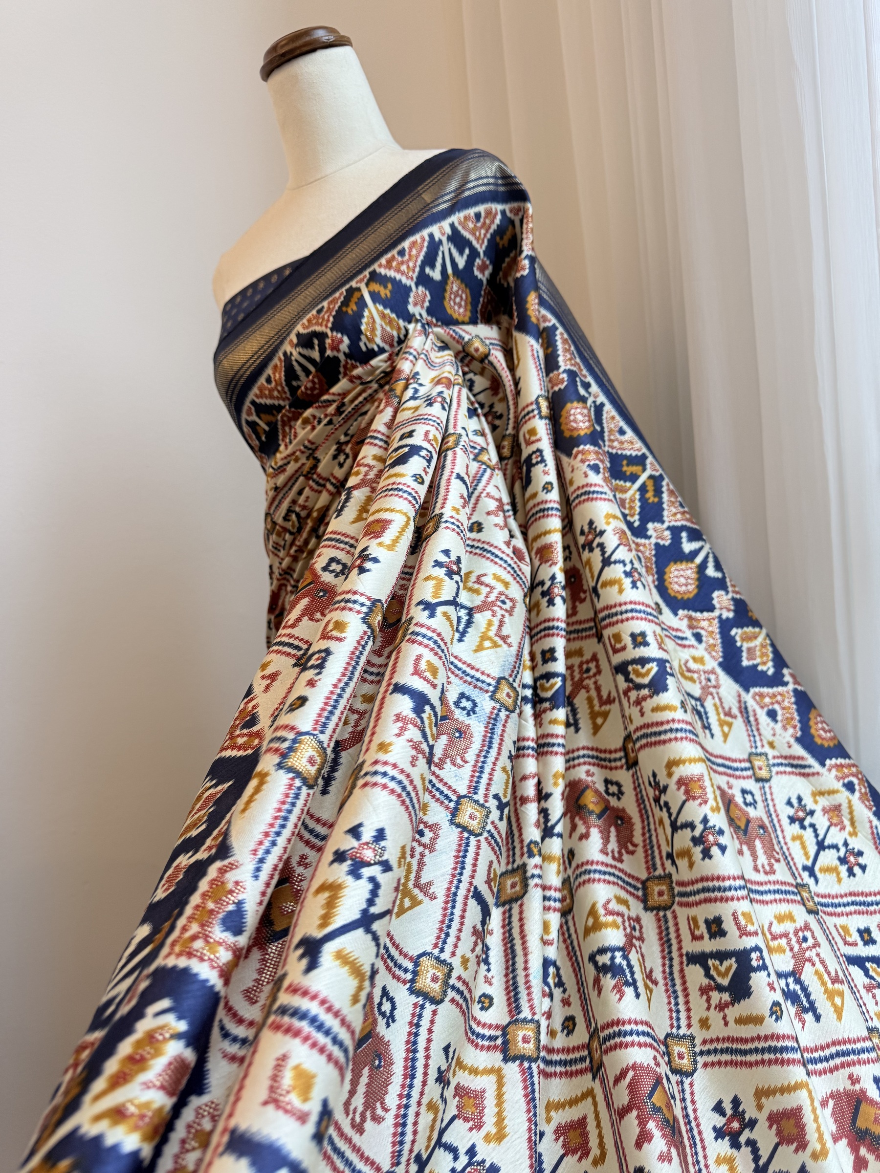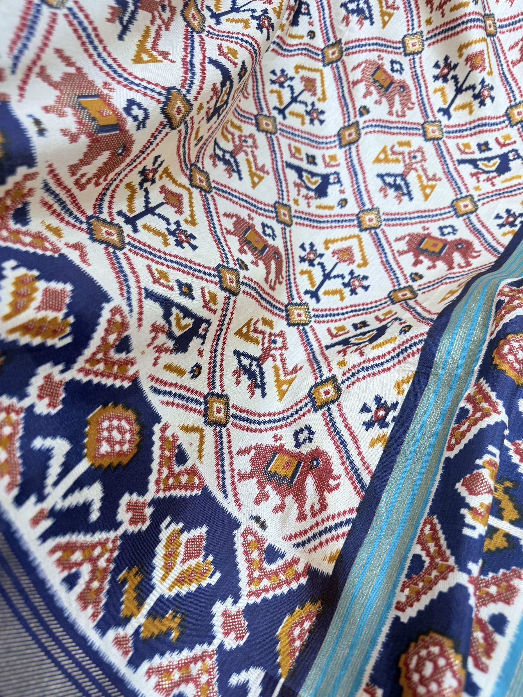 Soft and easy to drape mixed crepe silk saree with Patola design inspired design on body, contrast border & contrast design pallu and comes with attached contrast design blouse material (refer to the second last picture for blouse material picture).
