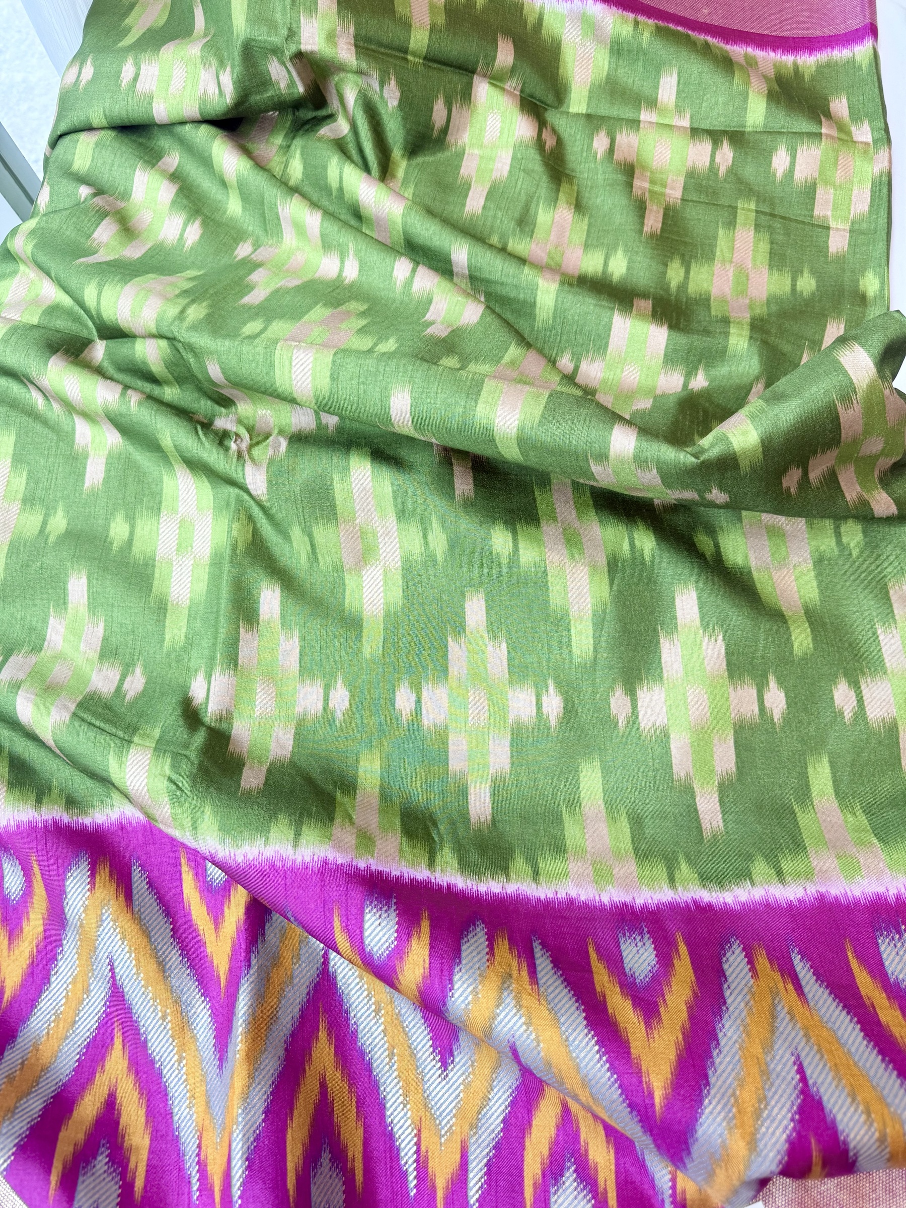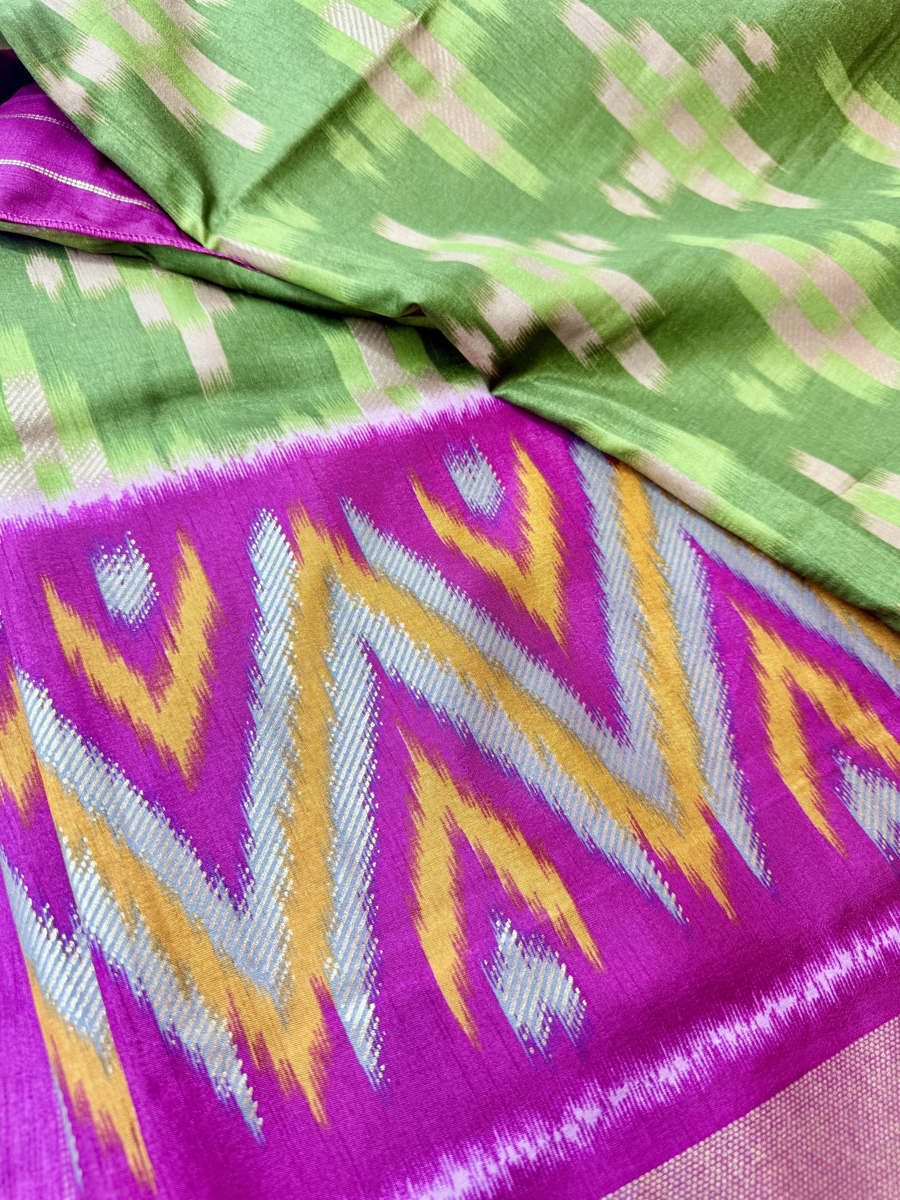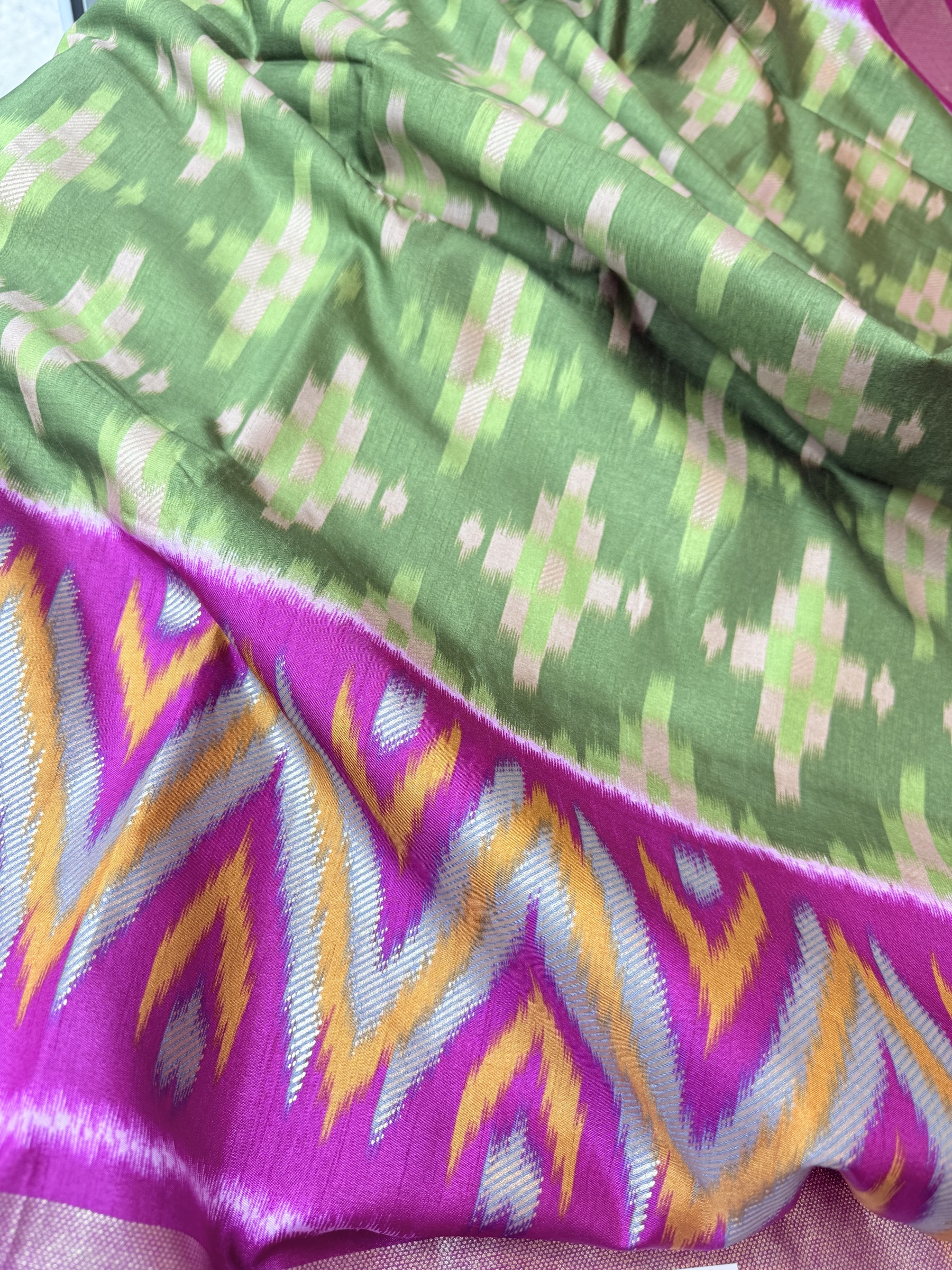 Soft and easy to drape mixed crepe silk saree with Pochampally Ikkat inspired design on body, contrast border & contrast design pallu and comes with attached contrast design blouse material (refer to the last picture for blouse material picture).