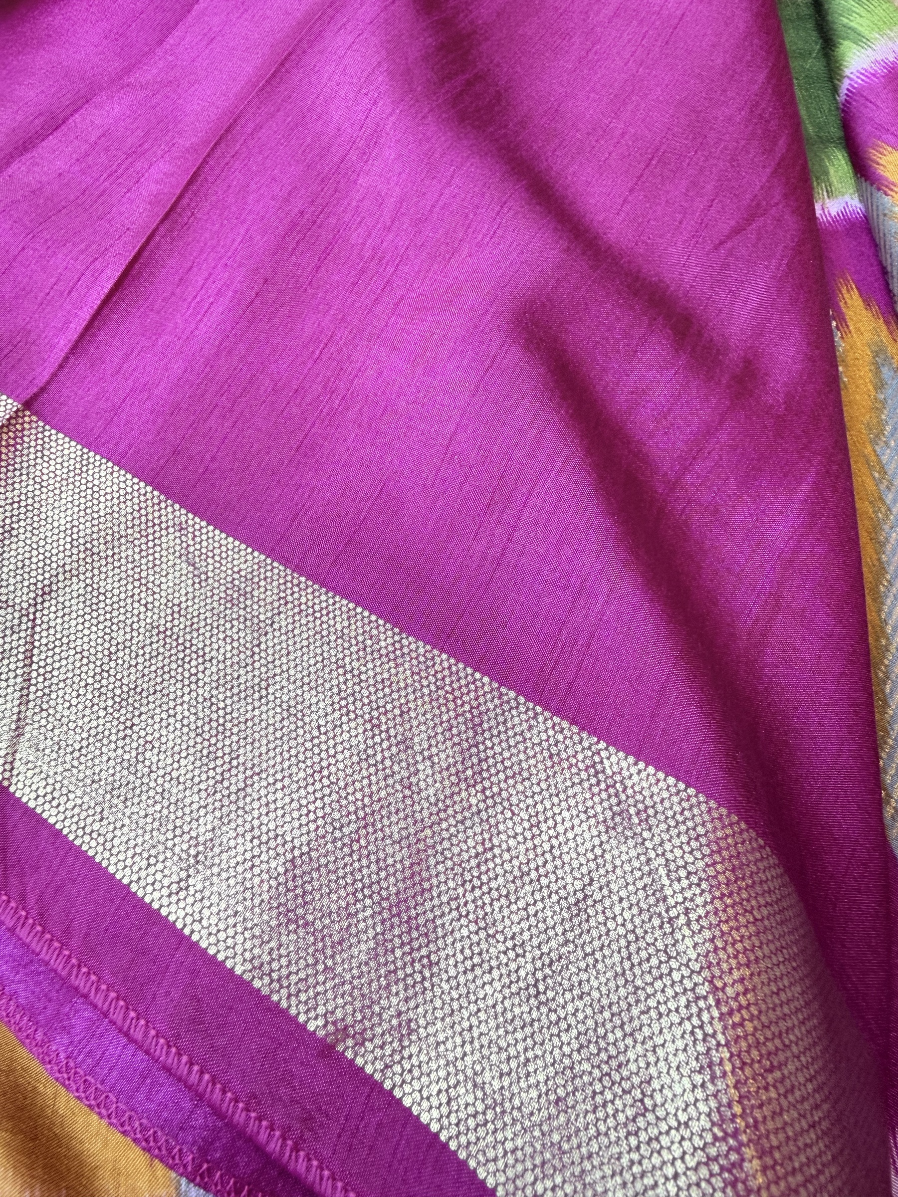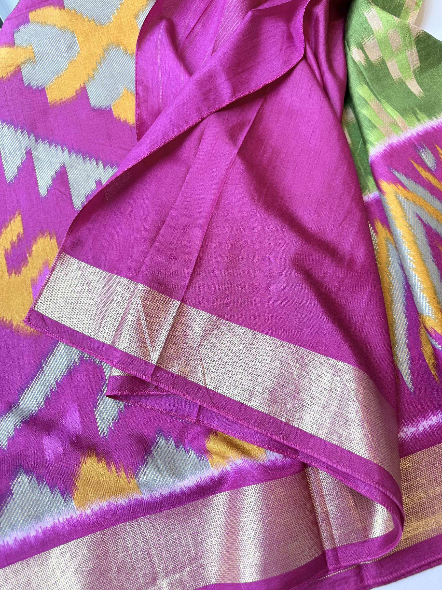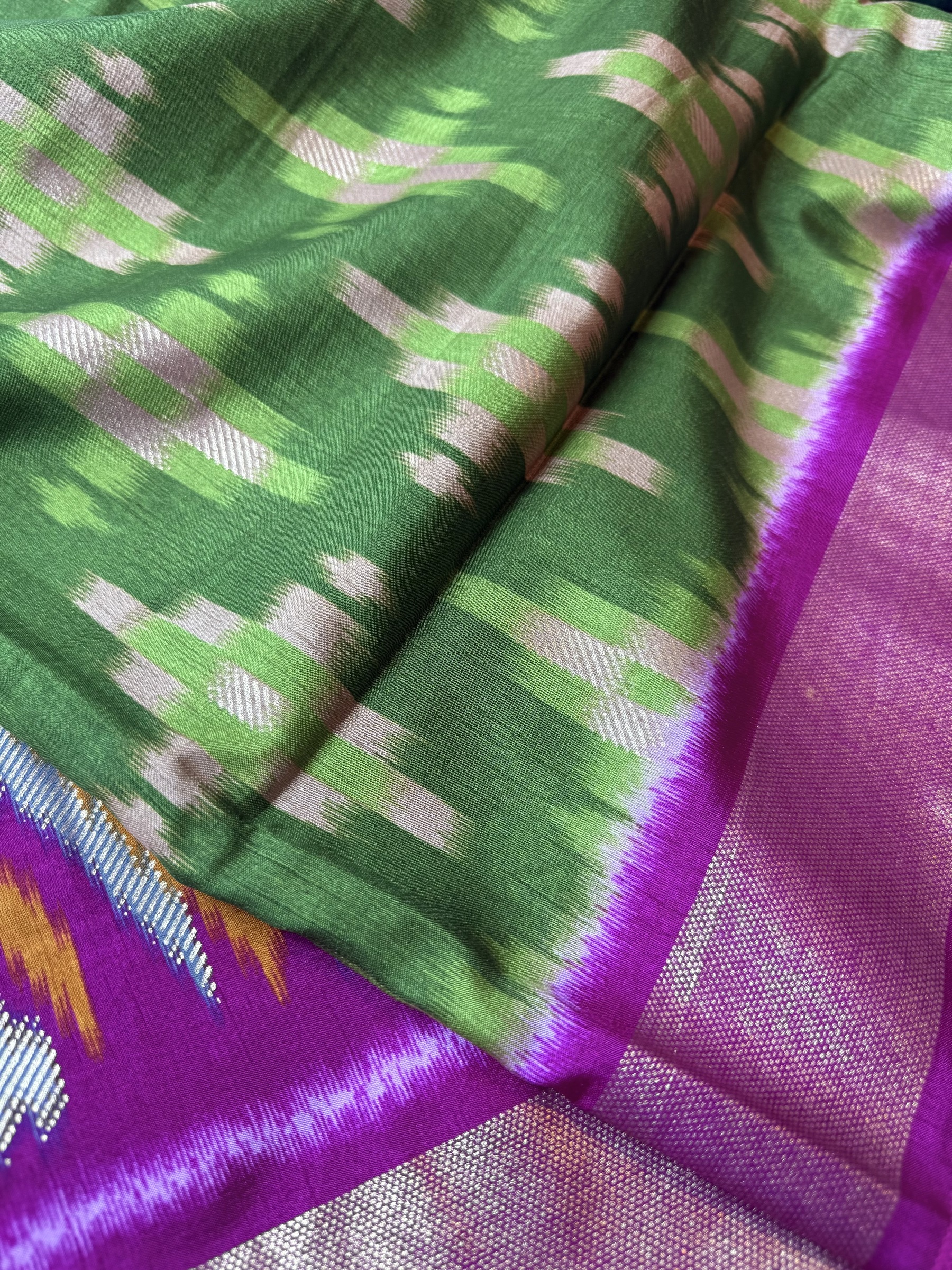 Soft and easy to drape mixed crepe silk saree with Pochampally Ikkat inspired design on body, contrast border & contrast design pallu and comes with attached contrast design blouse material (refer to the last picture for blouse material picture).