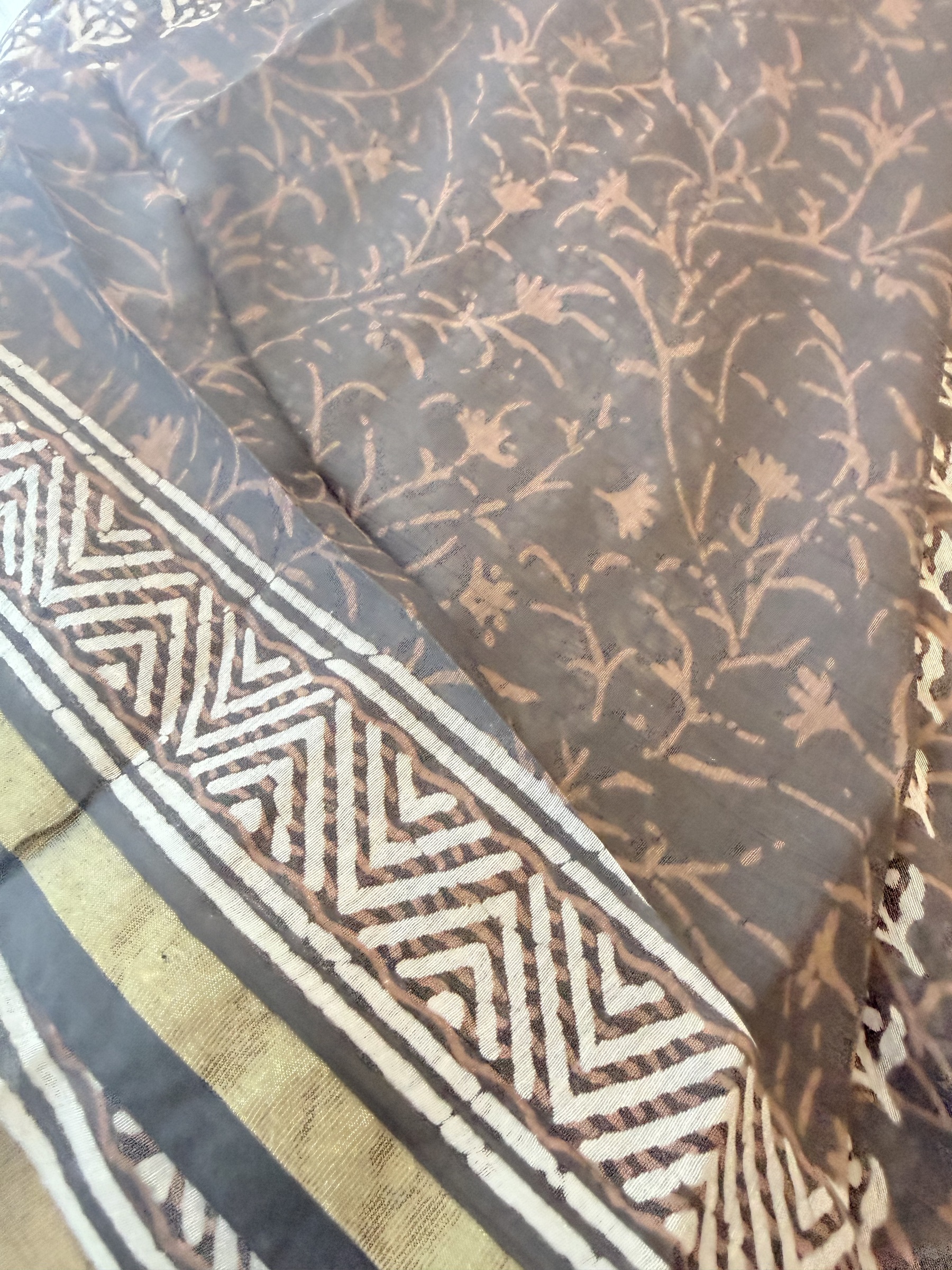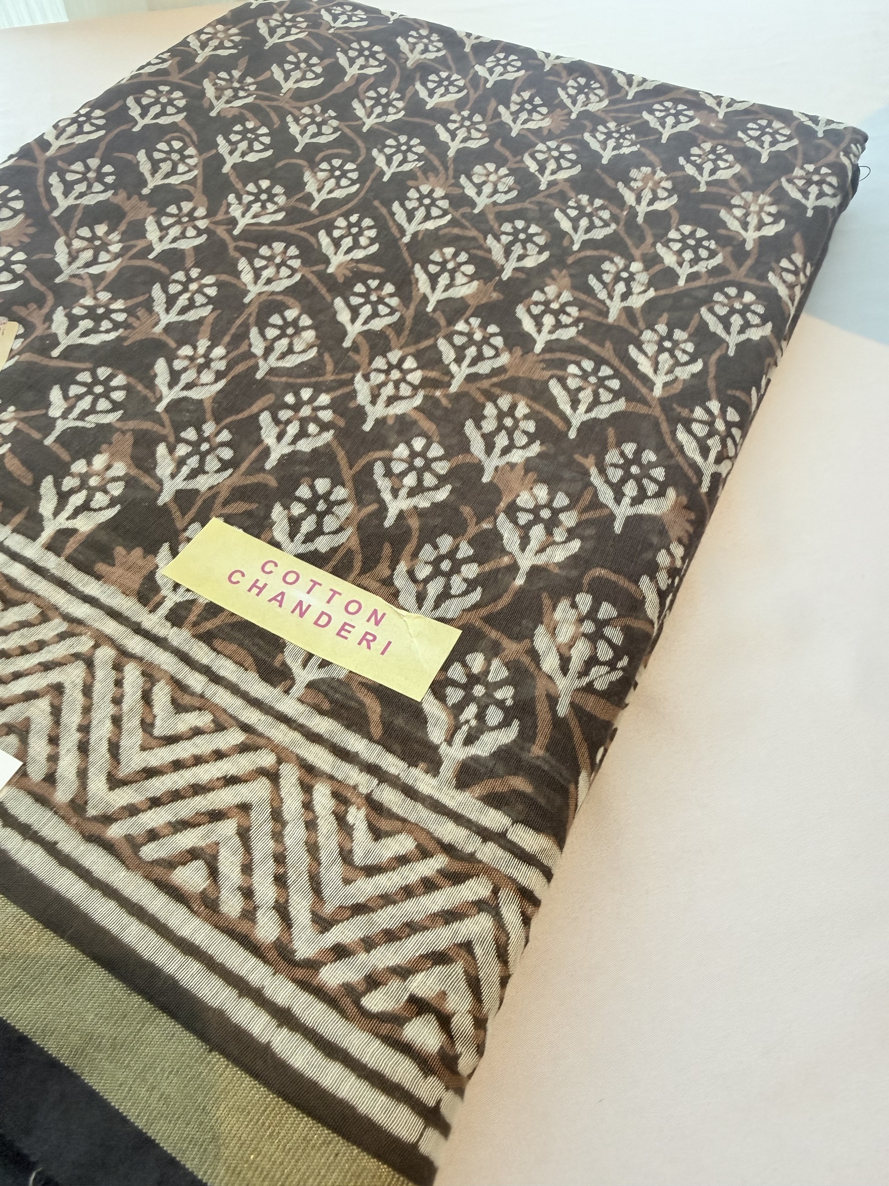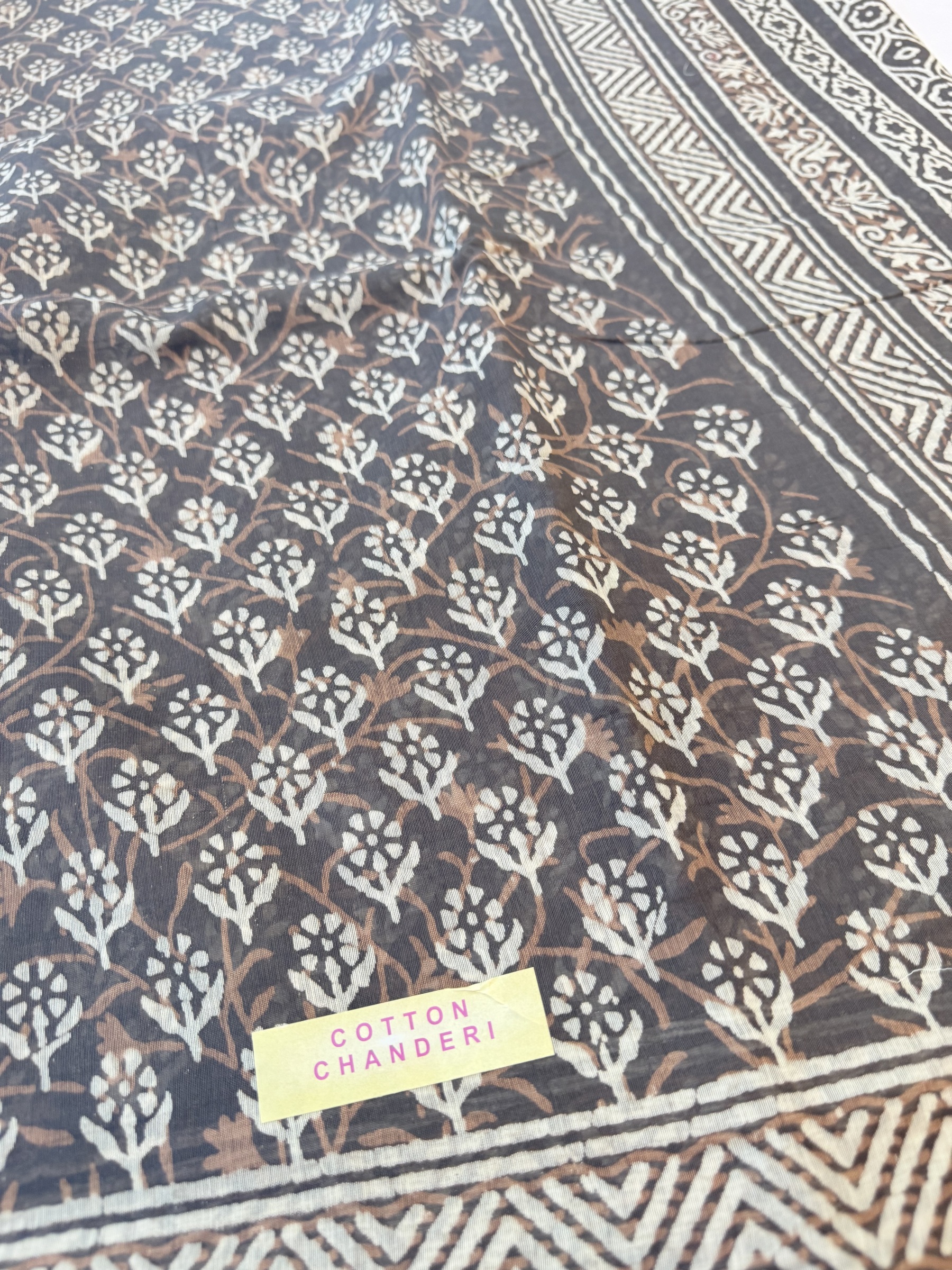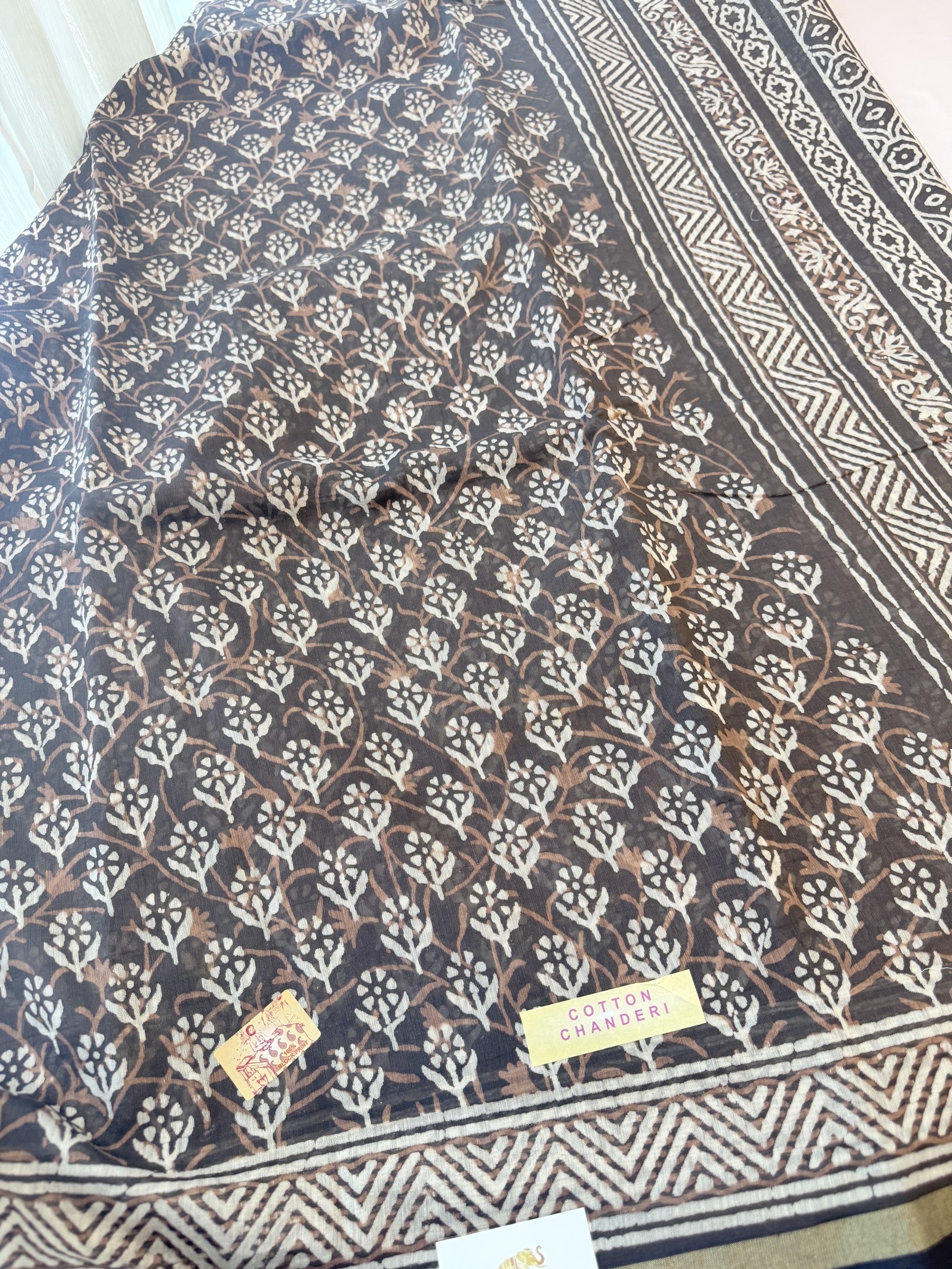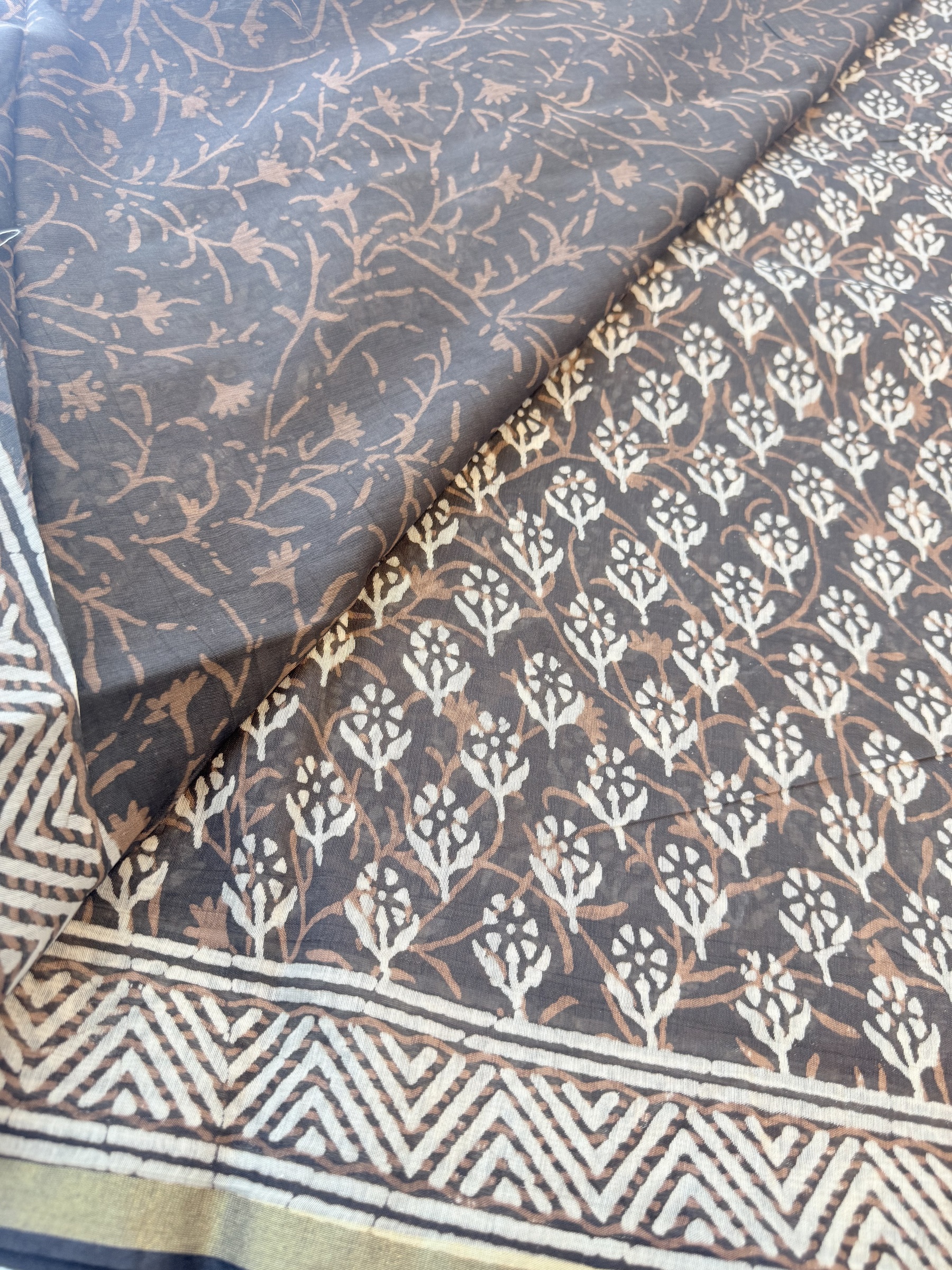 Lightweight block print cotton saree with thin gold border and comes with contrast design pallu & blouse material.