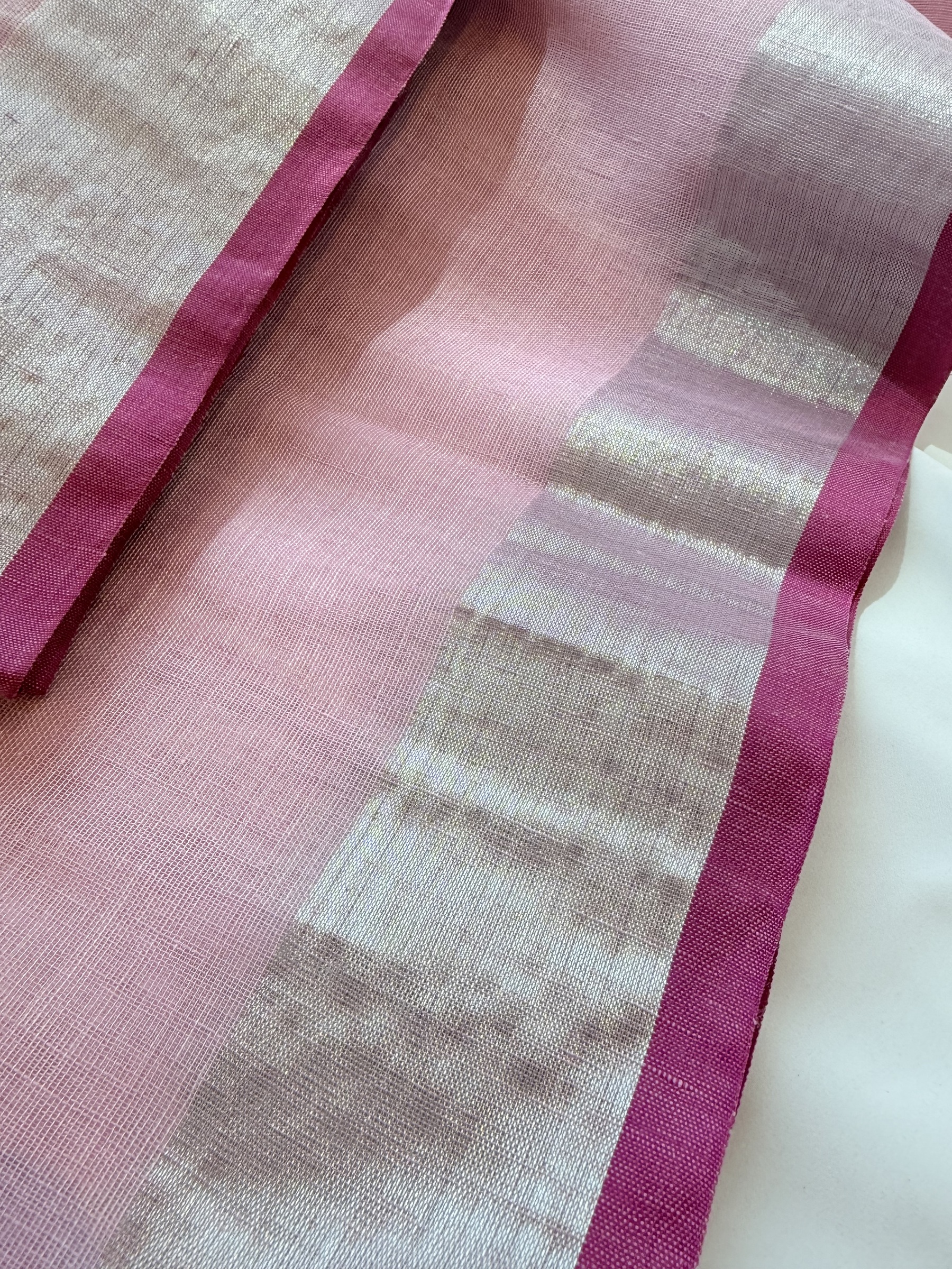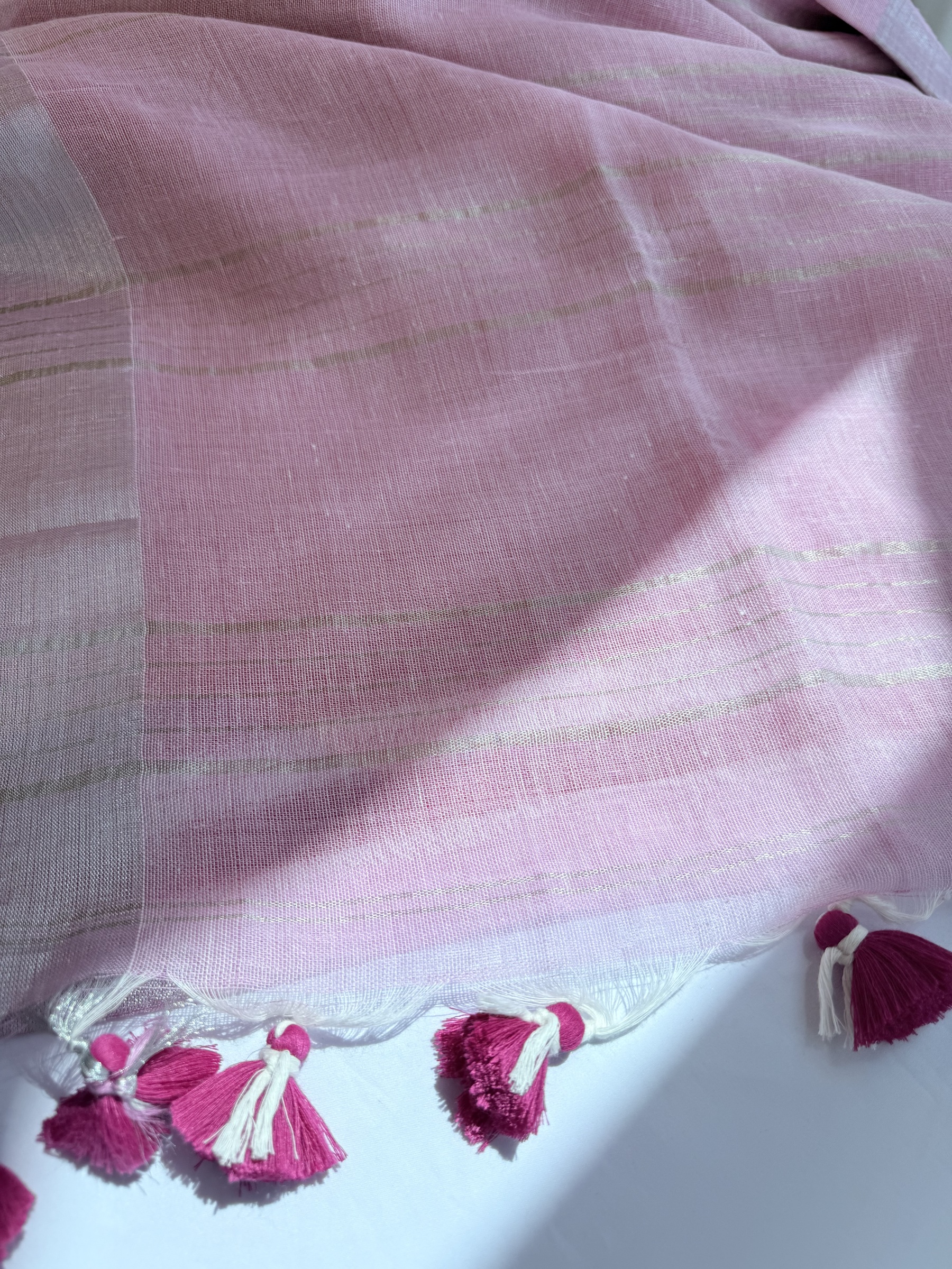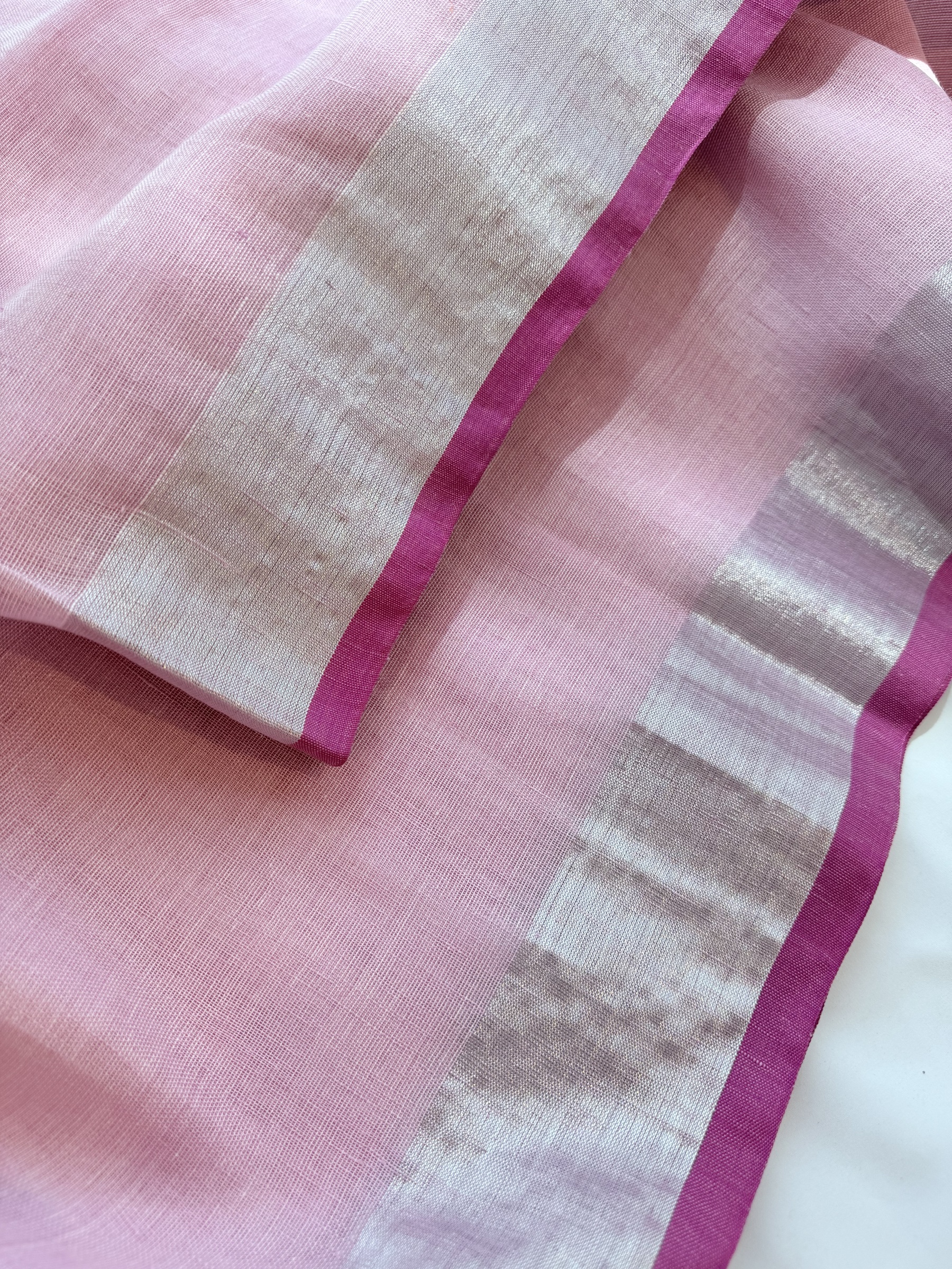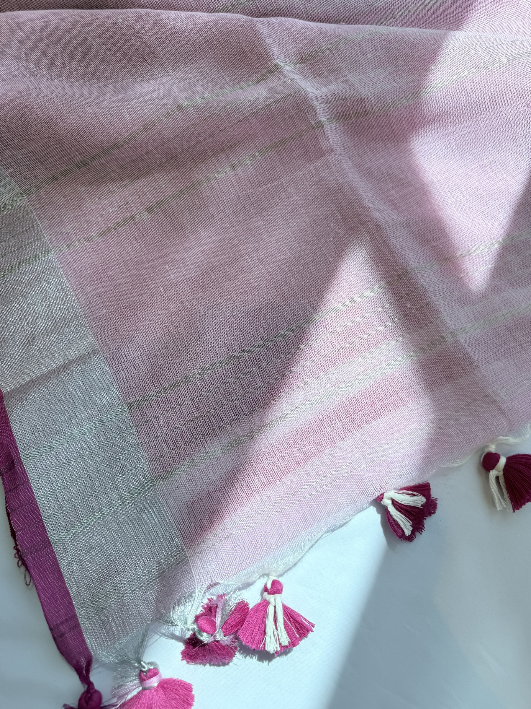 Linen cotton mix saree with silver border and running colour blouse material and pompoms on pallu.