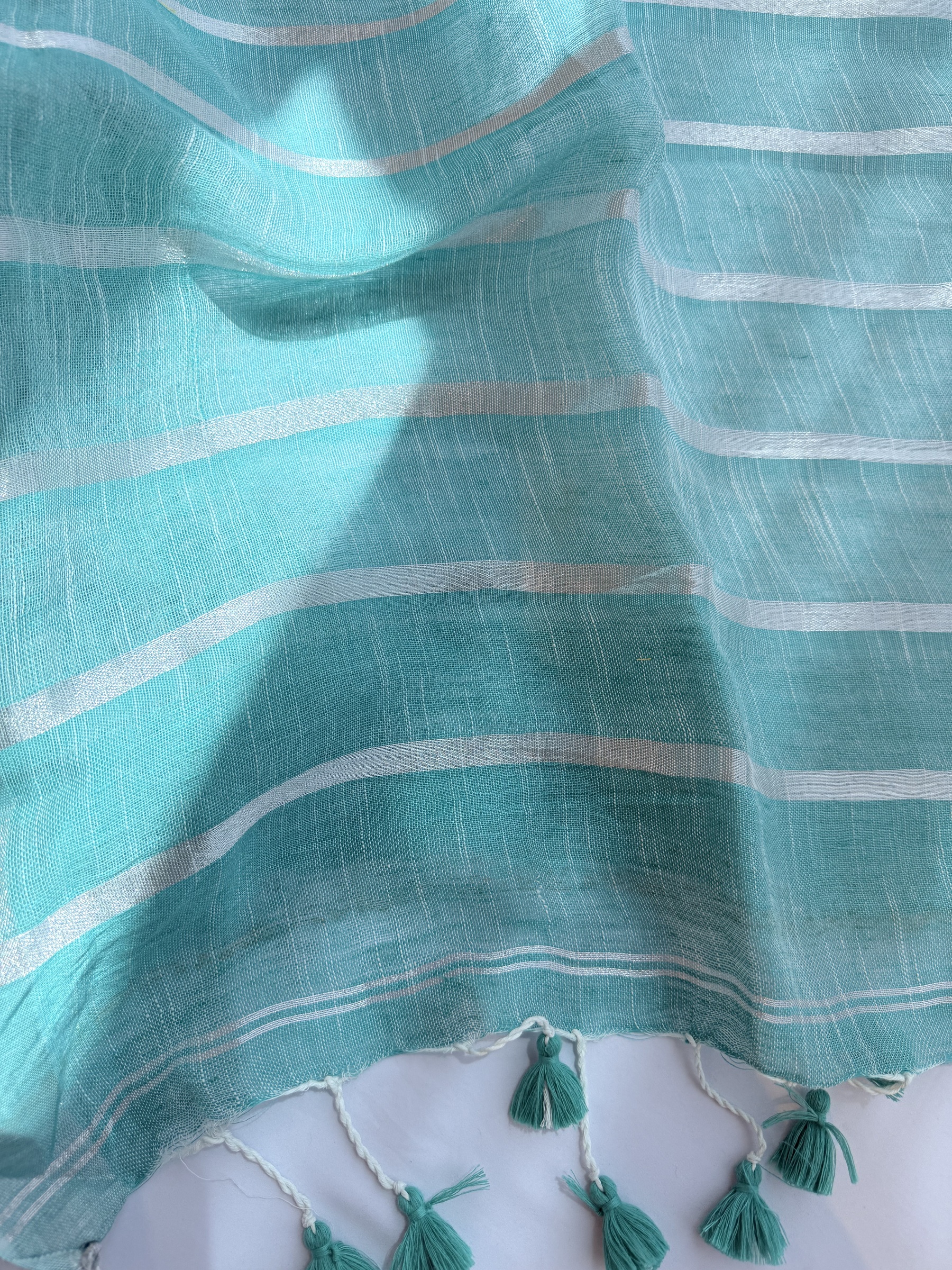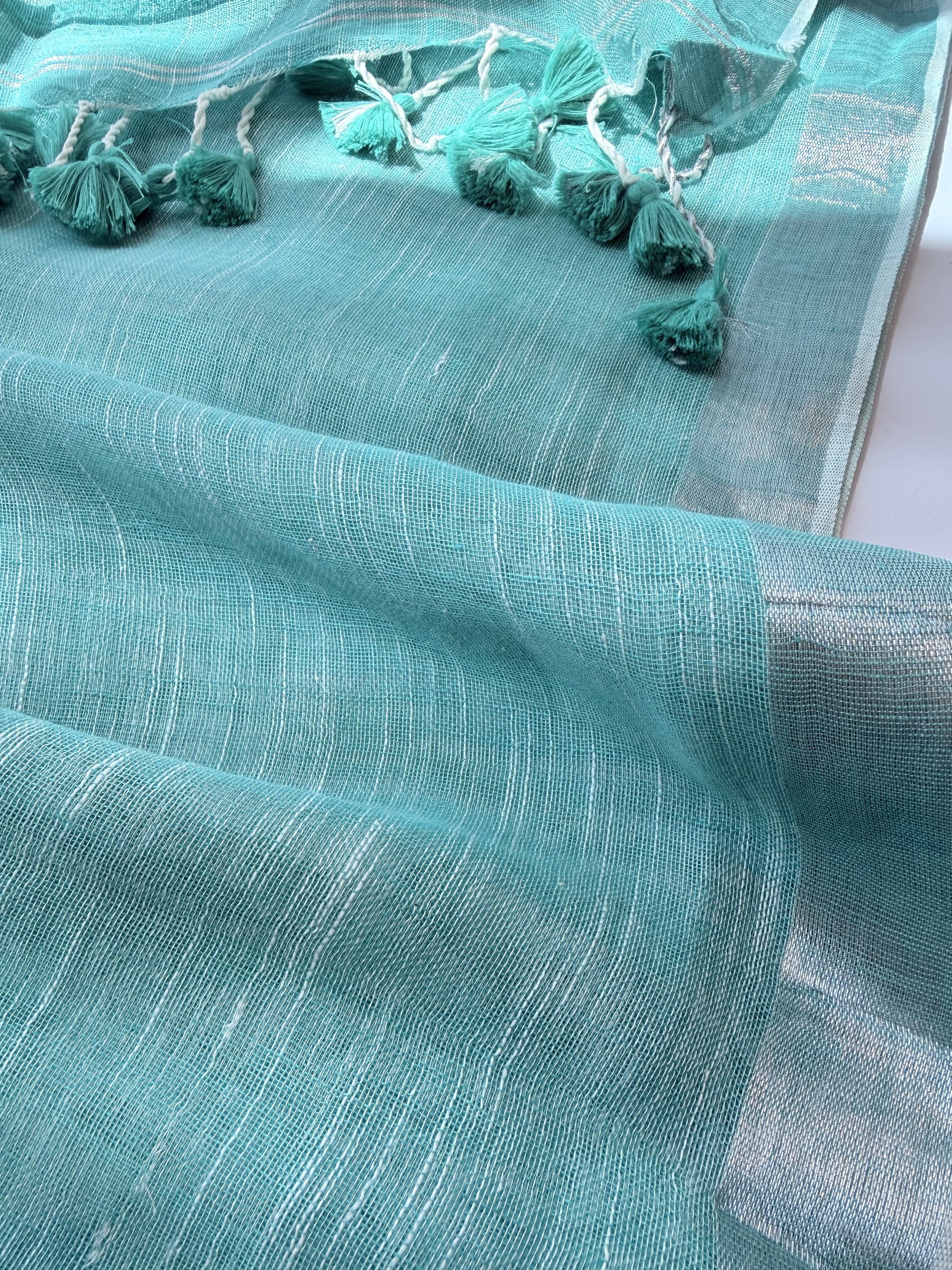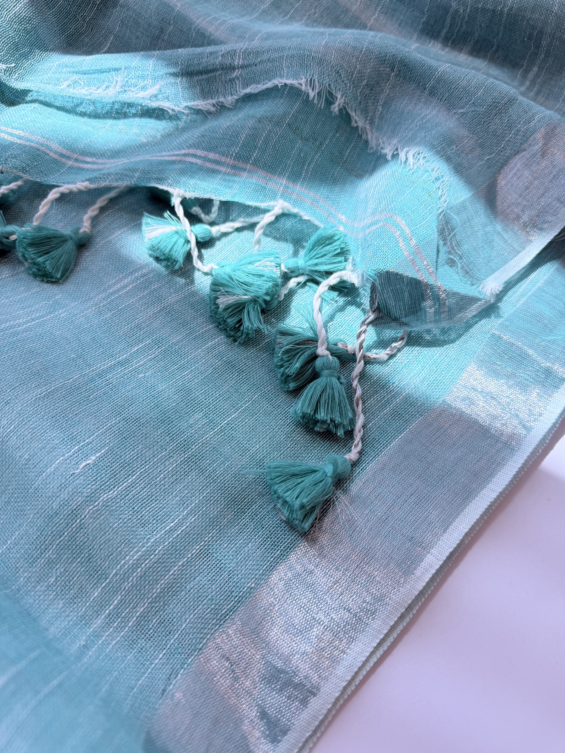 Linen cotton mix saree with silver border and running colour blouse material and pompoms on pallu.