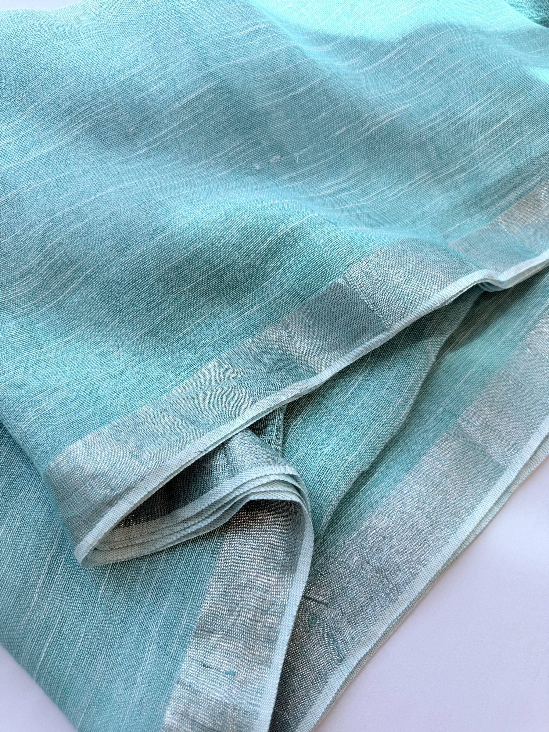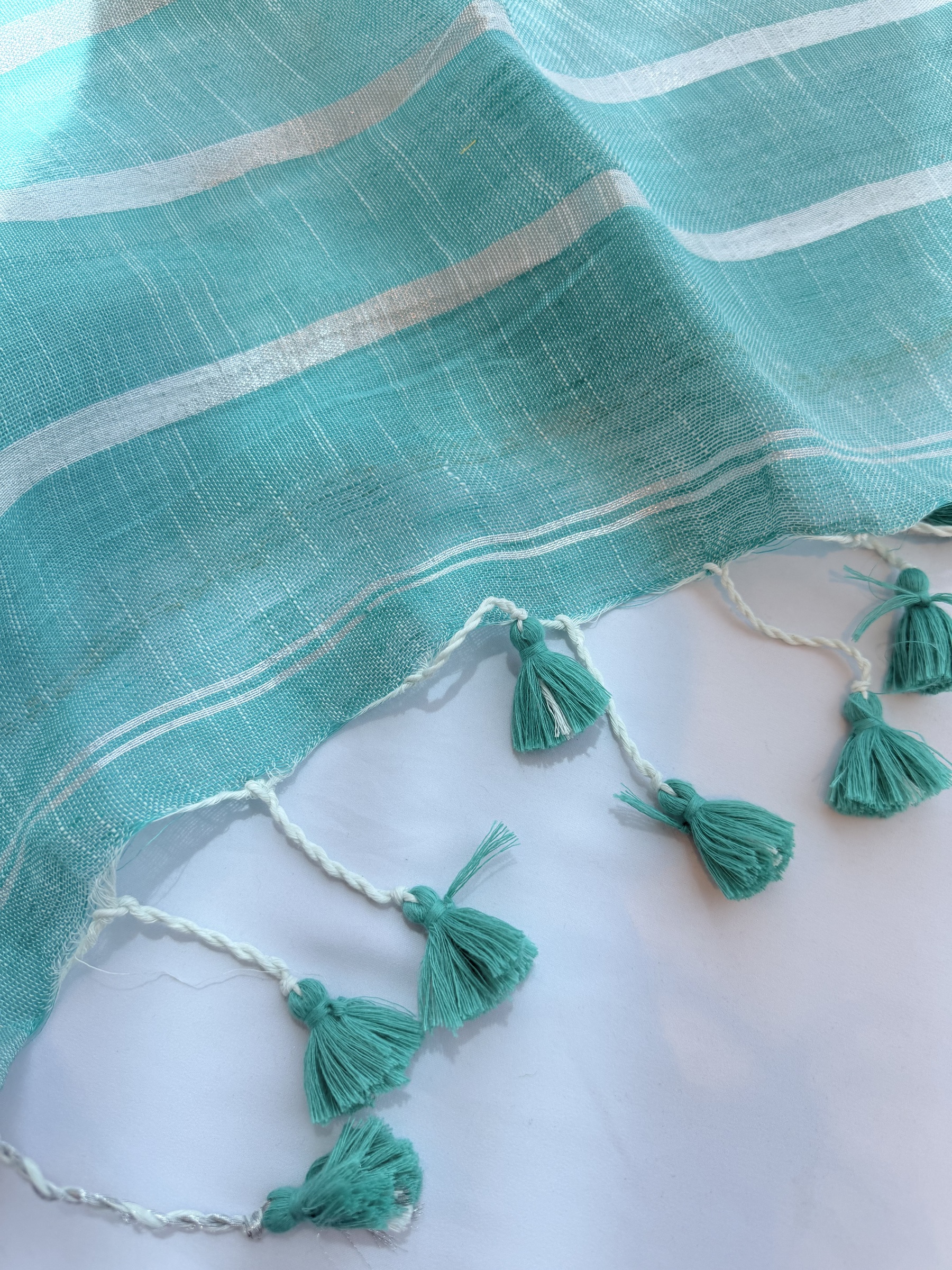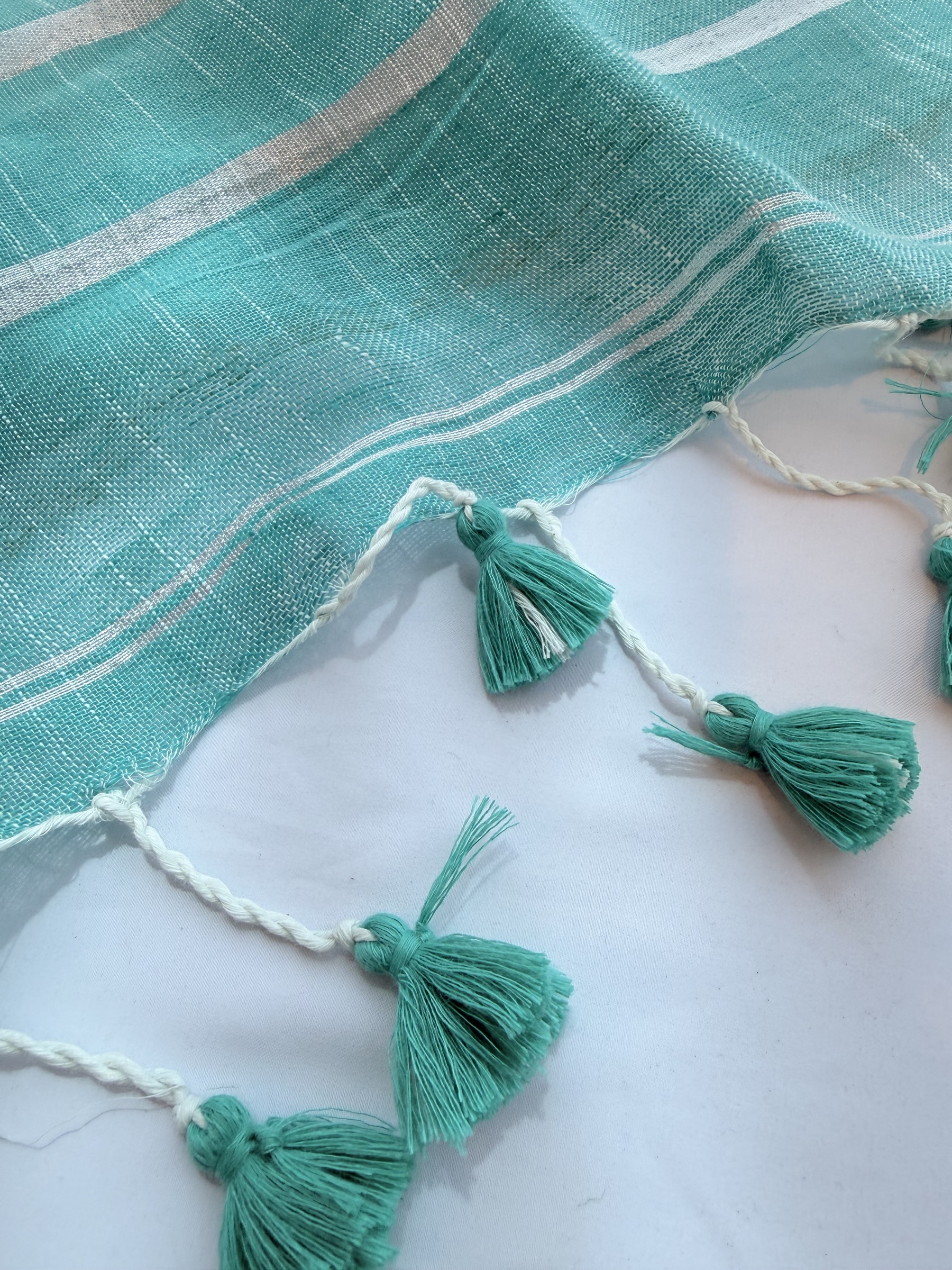 Linen cotton mix saree with silver border and running colour blouse material and pompoms on pallu.