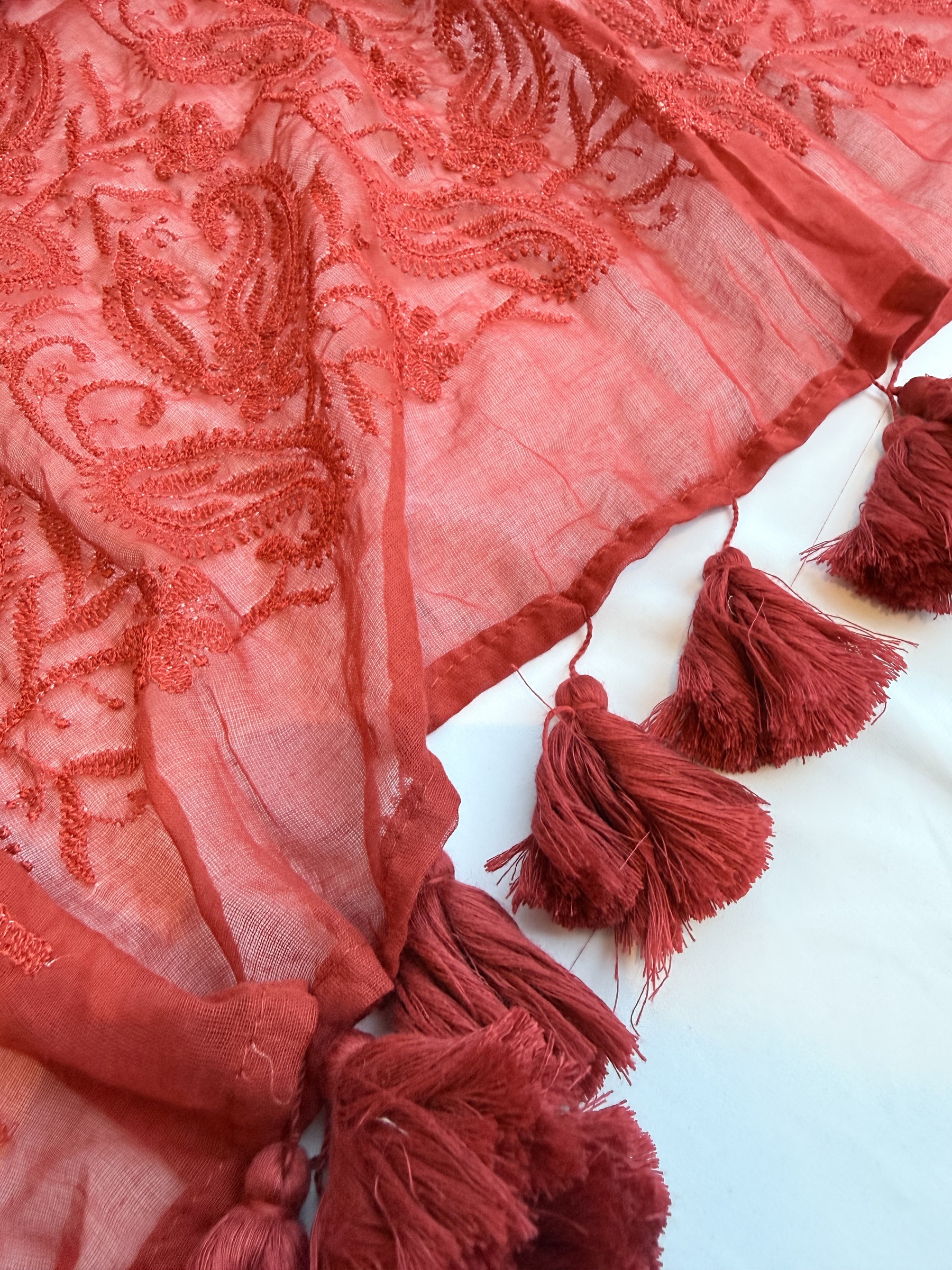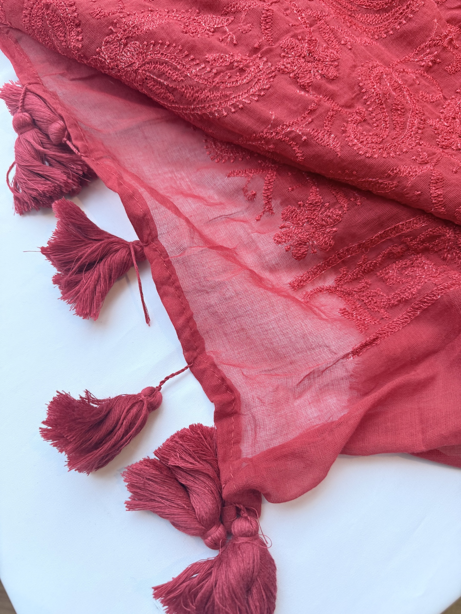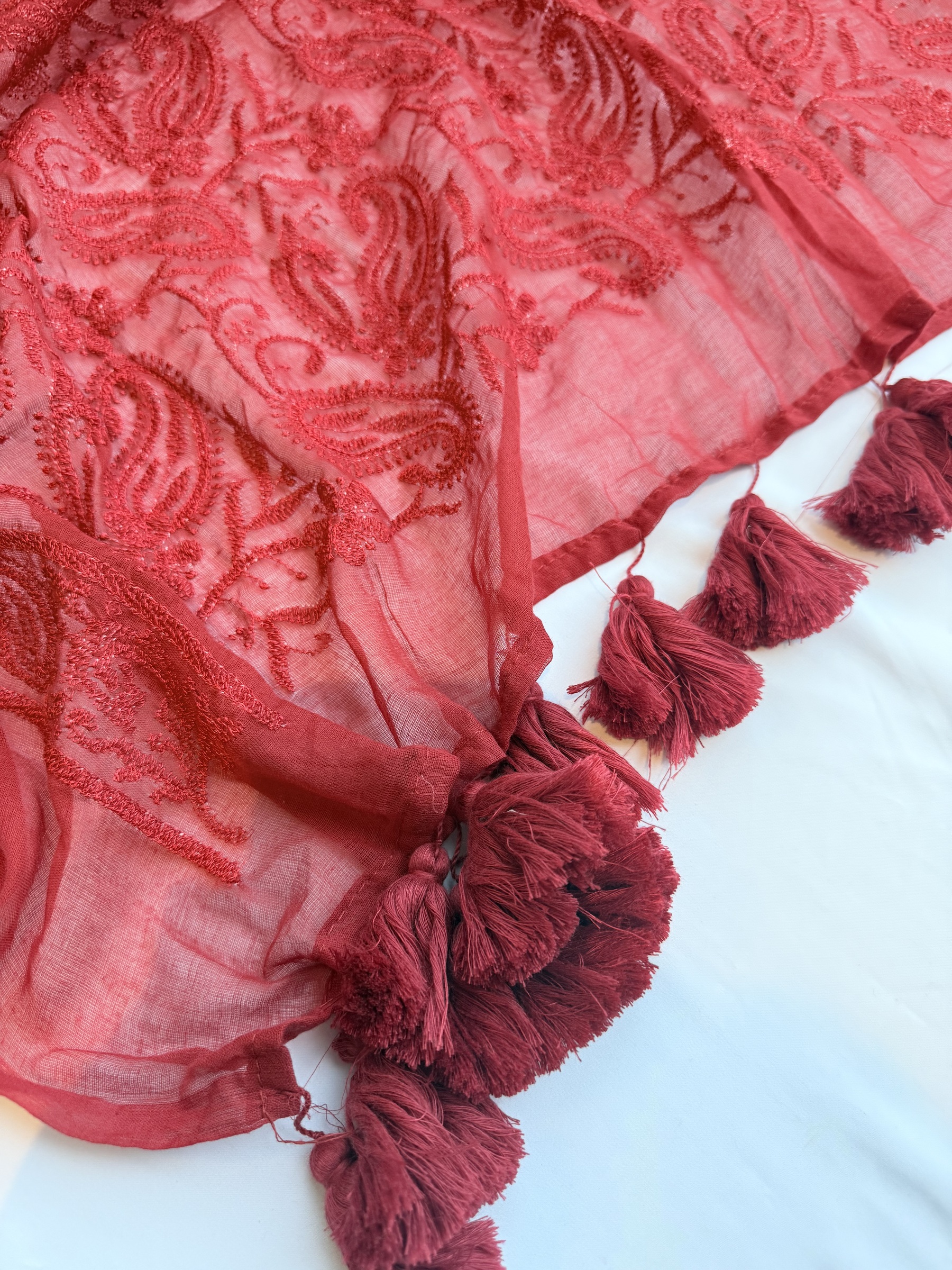 Chikankari inspired embroidery pure and soft Mulmul cotton saree with pompoms on pallu.
