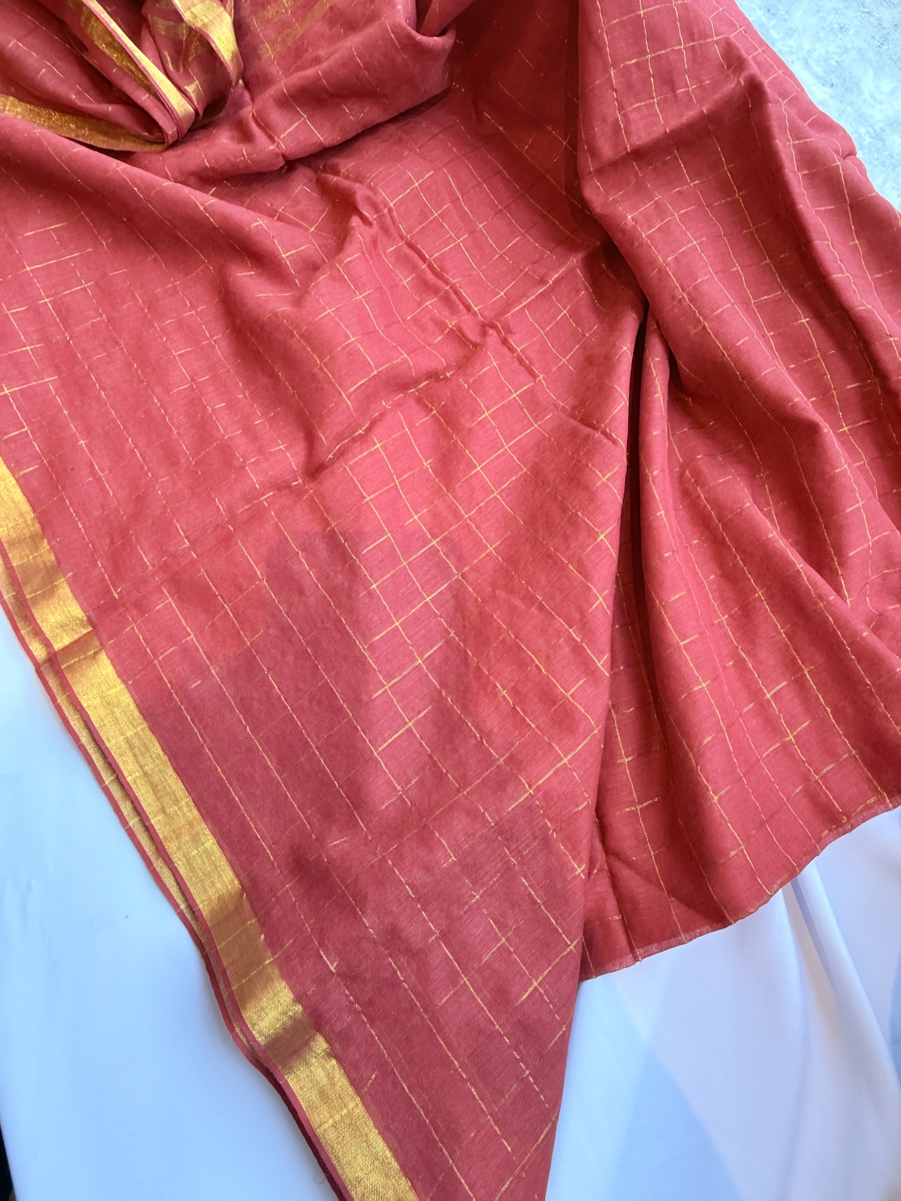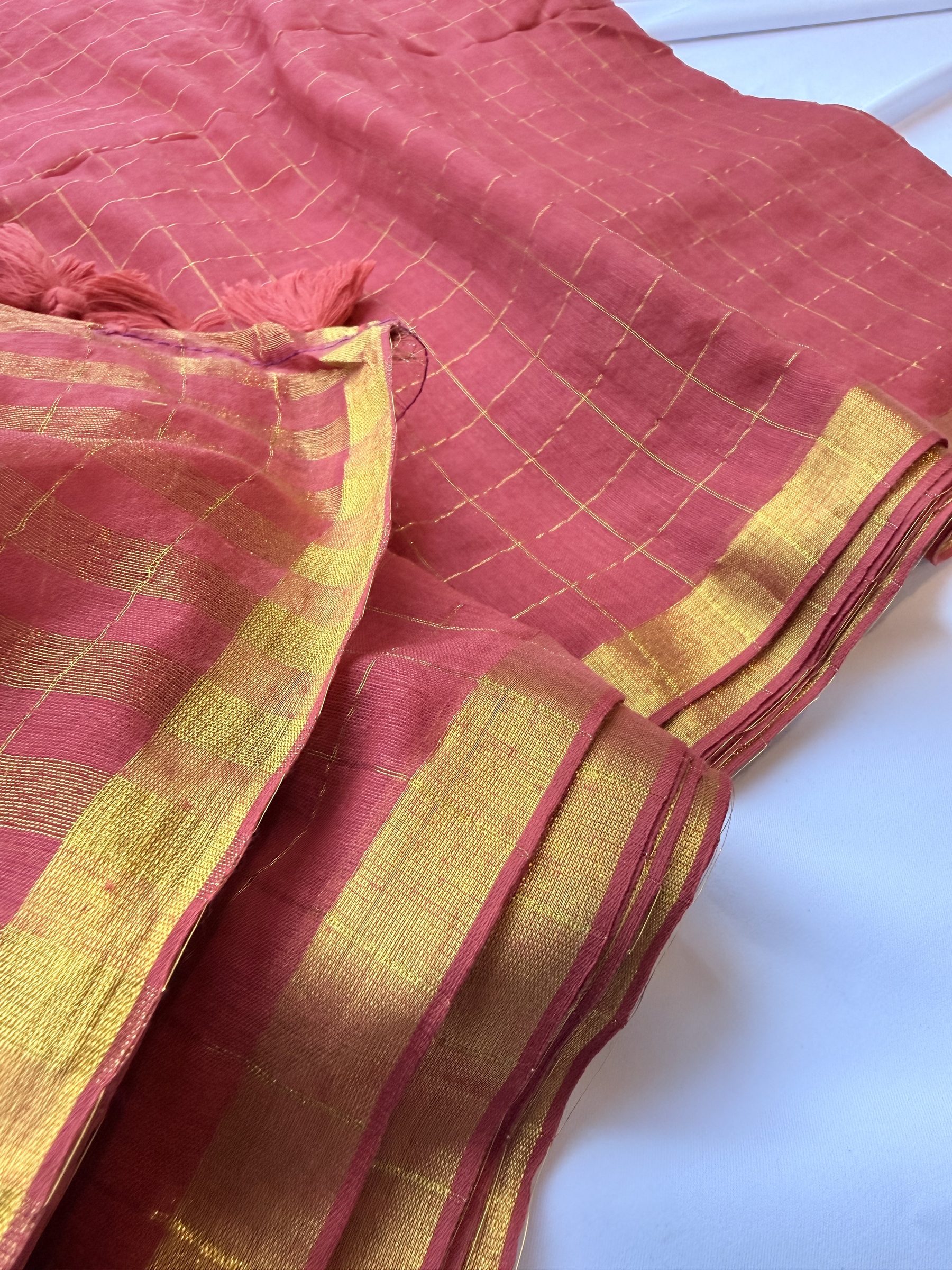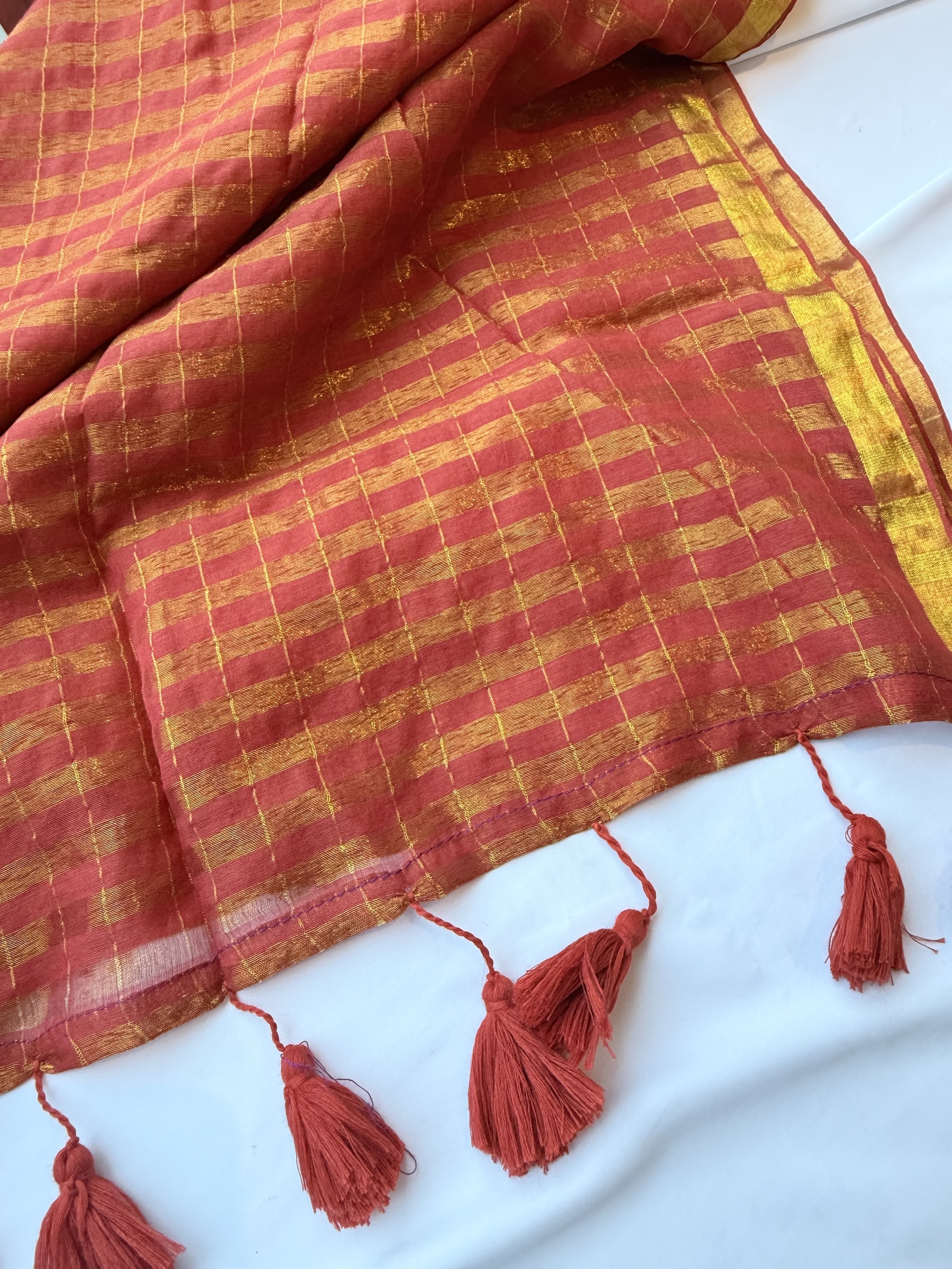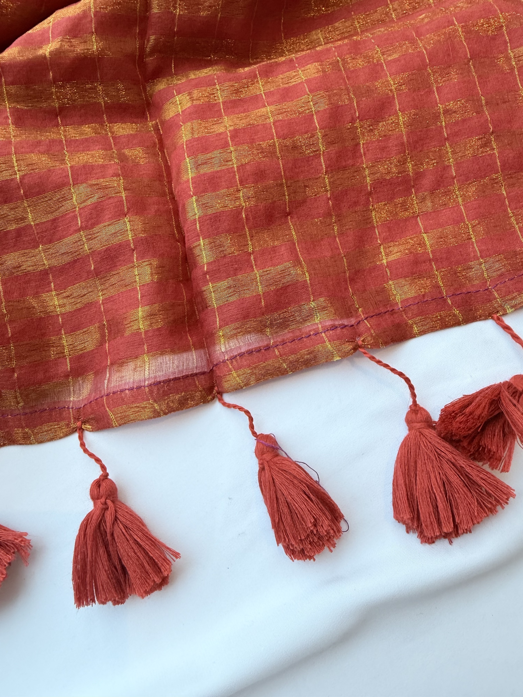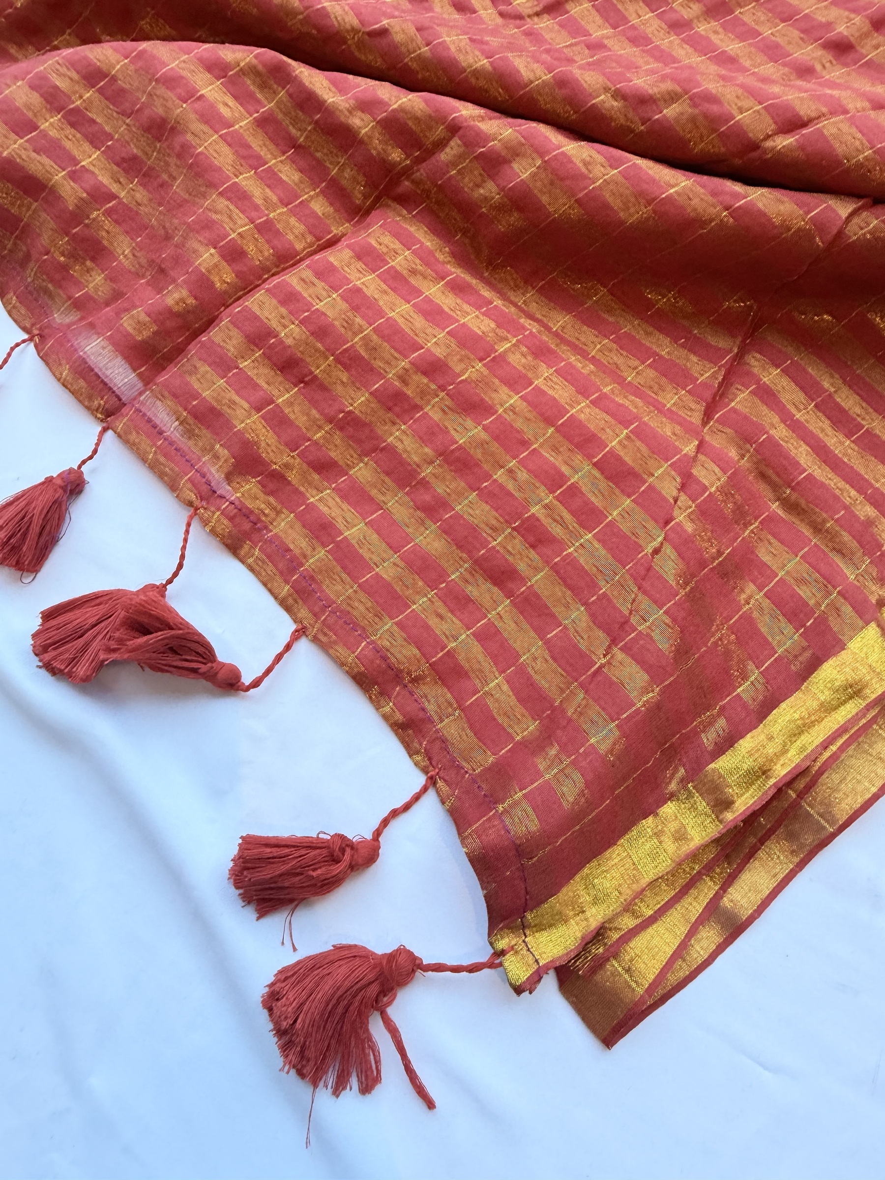 Red shade soft and lightweight pure Mulmul cotton saree with fine zari checks design on body, contrast design gold pallu with pompoms and comes with attached running design blouse.