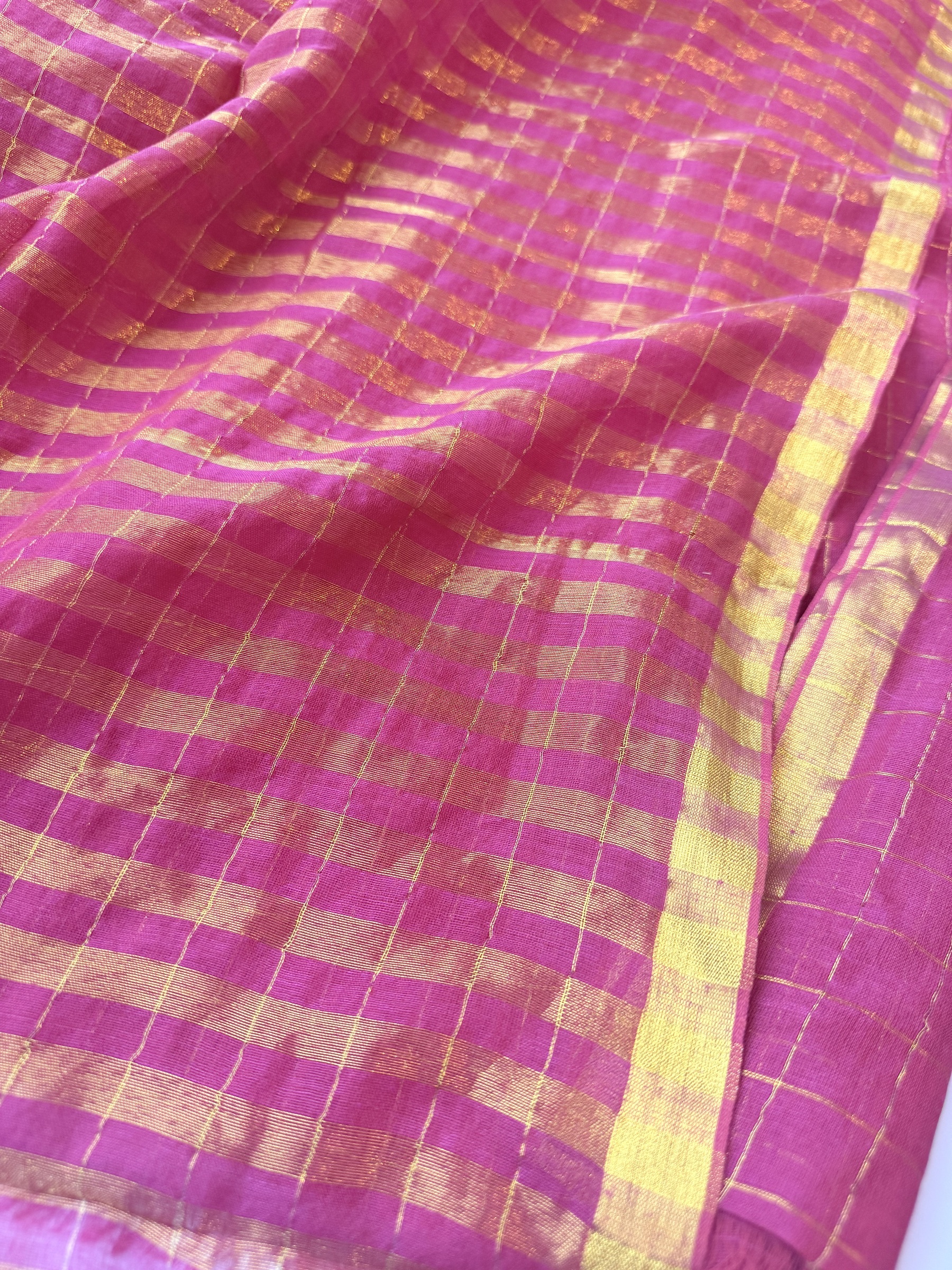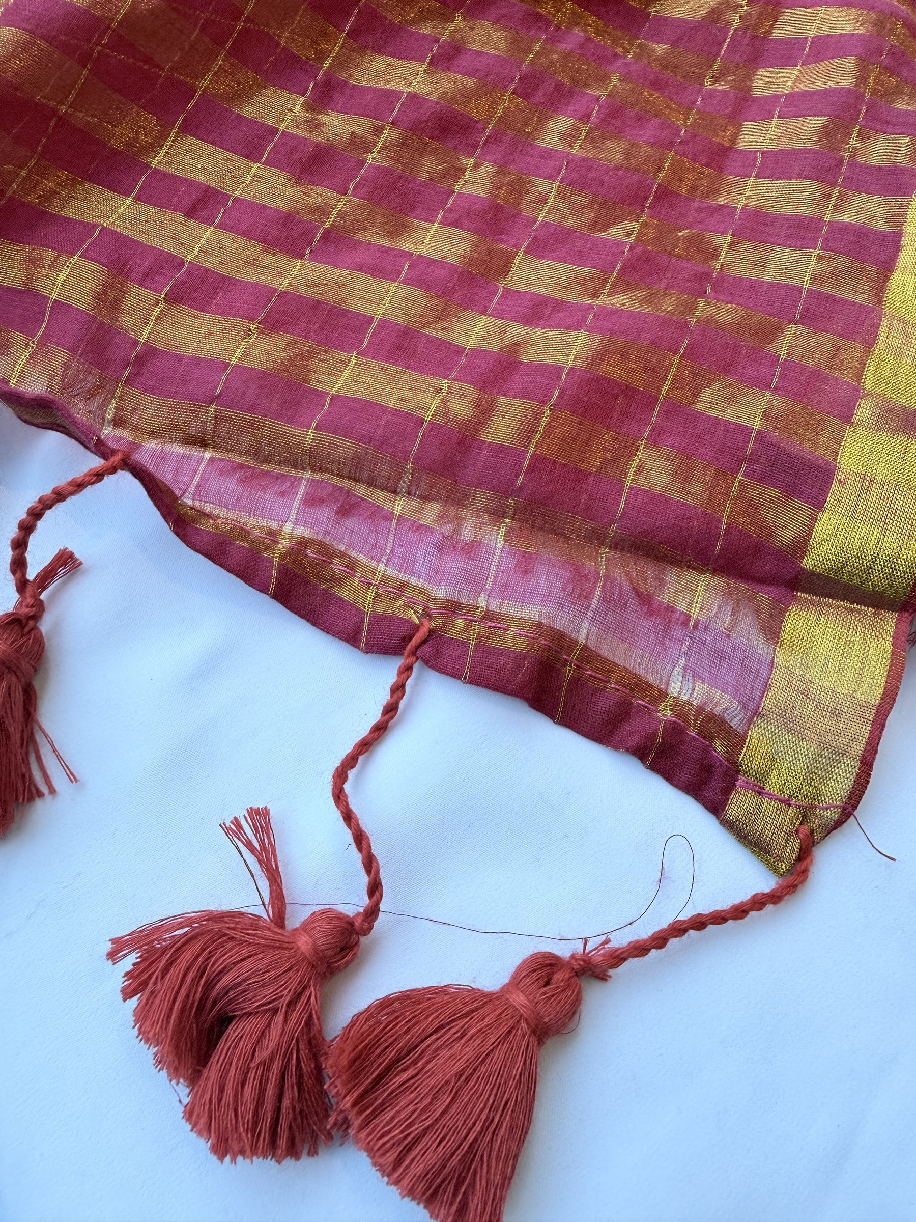 Magenta shade soft and lightweight pure Mulmul cotton saree with fine zari checks design on body, contrast design gold pallu with pompoms and comes with attached running design blouse.