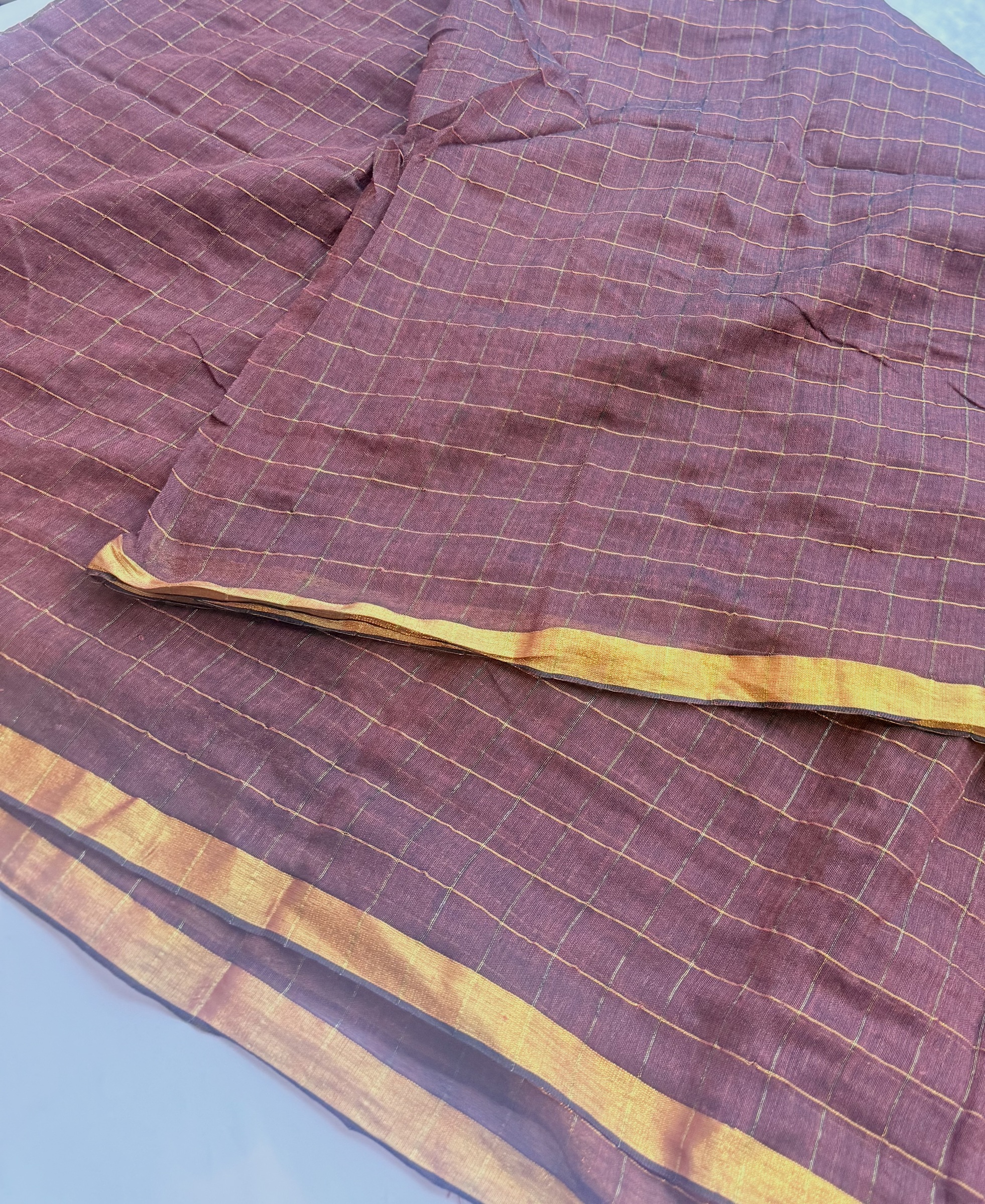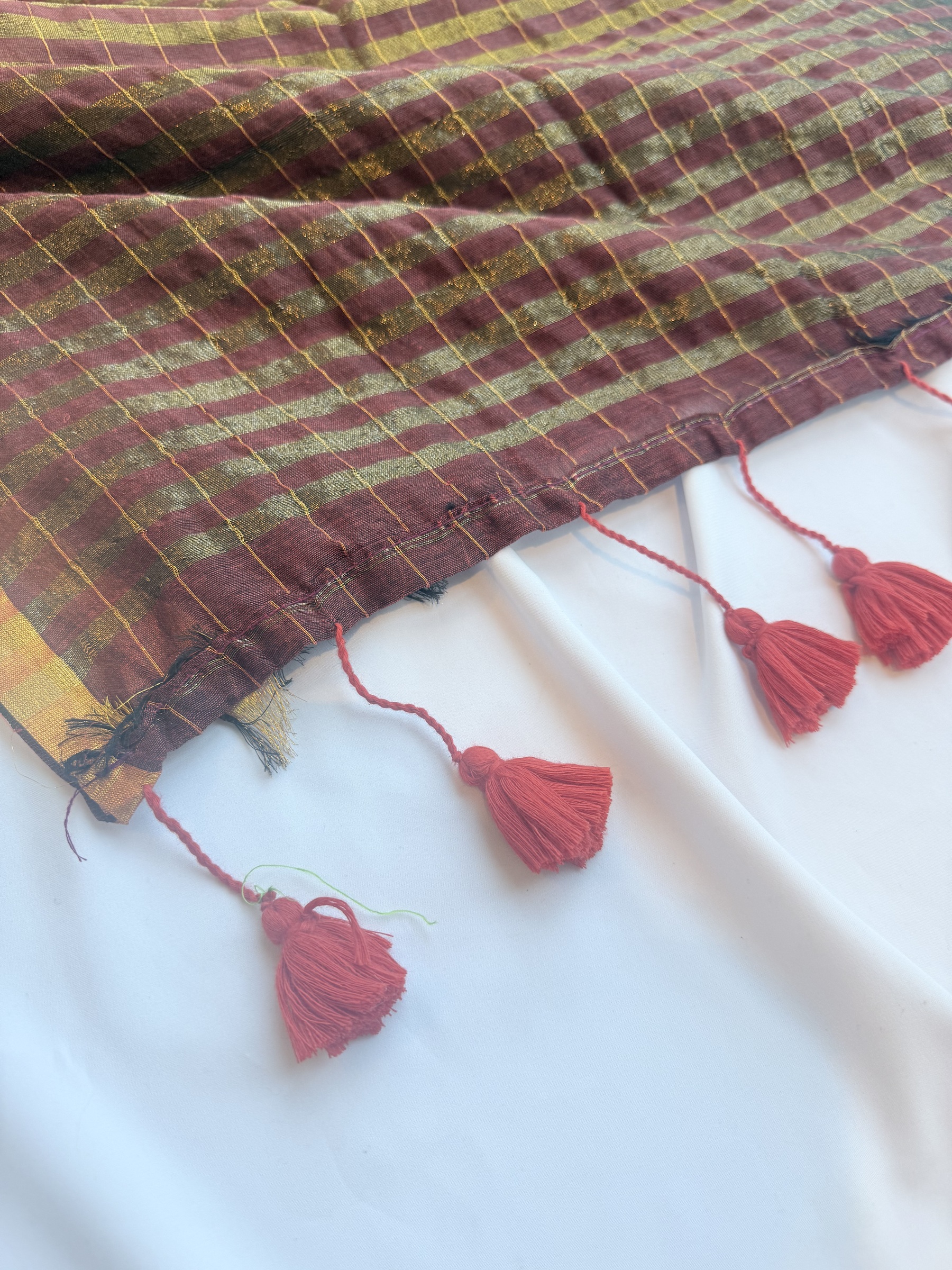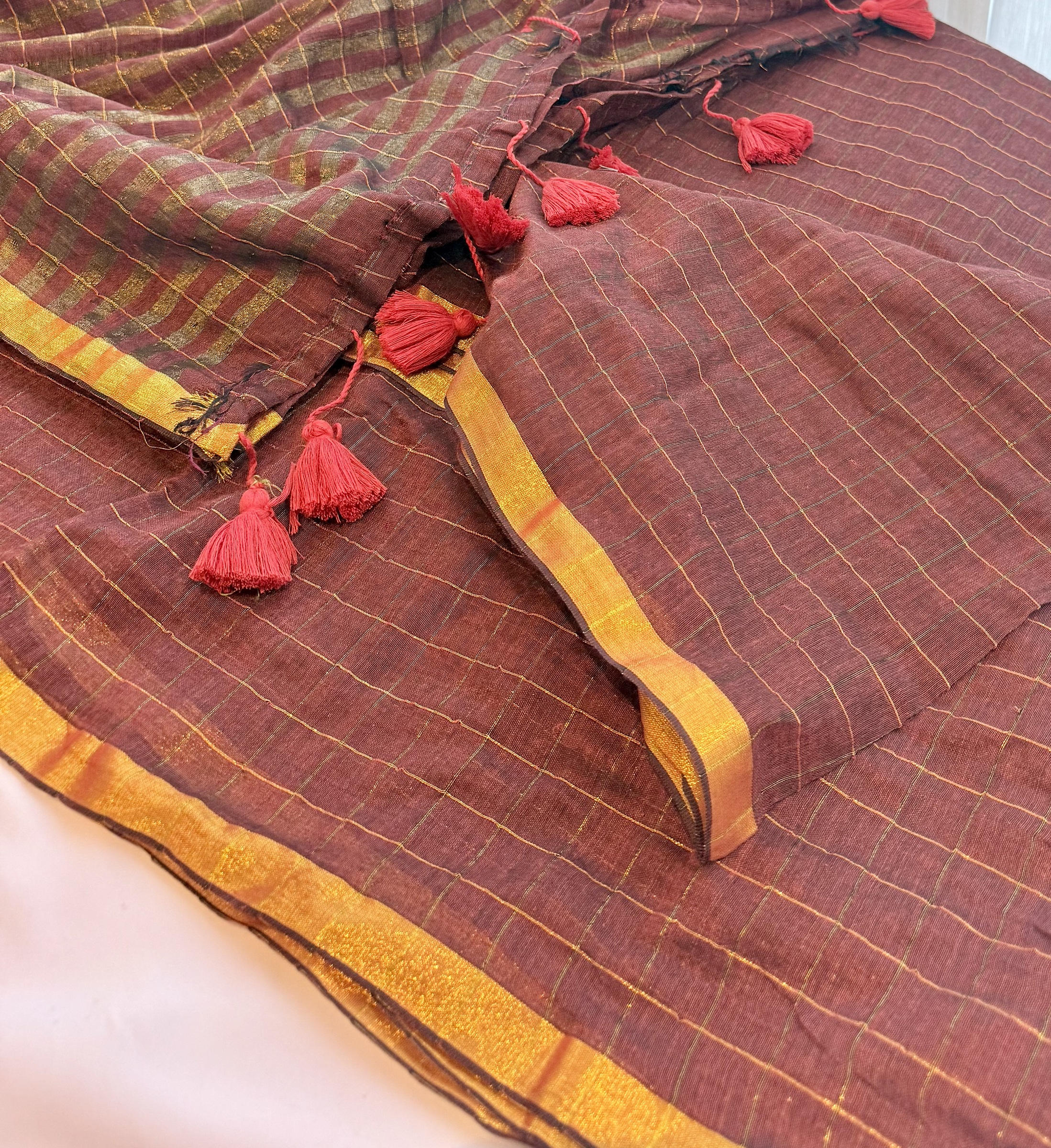 Soft and lightweight pure Mulmul cotton saree with fine zari checks design on body, contrast design gold pallu with pompoms and comes with attached running design blouse.