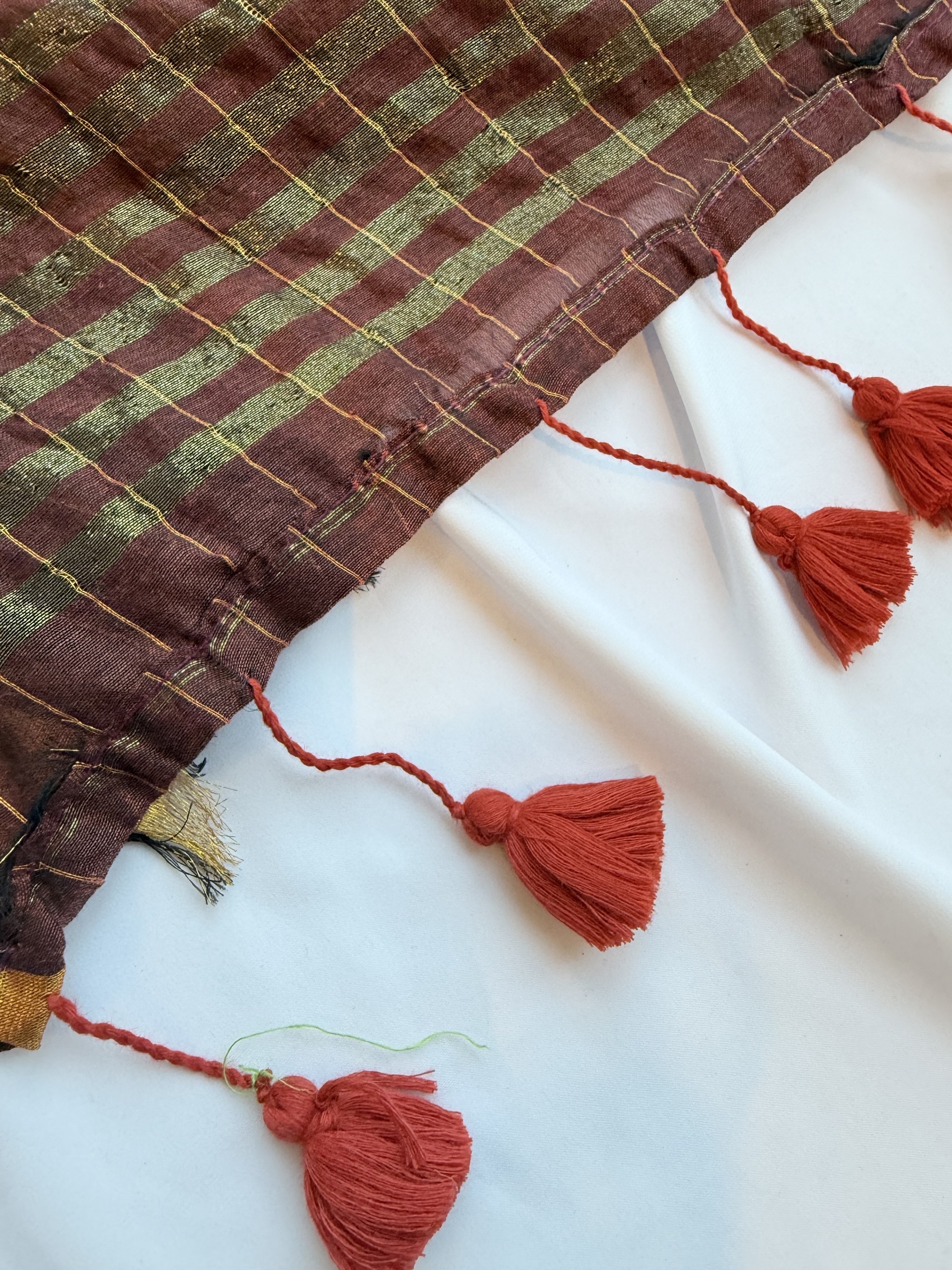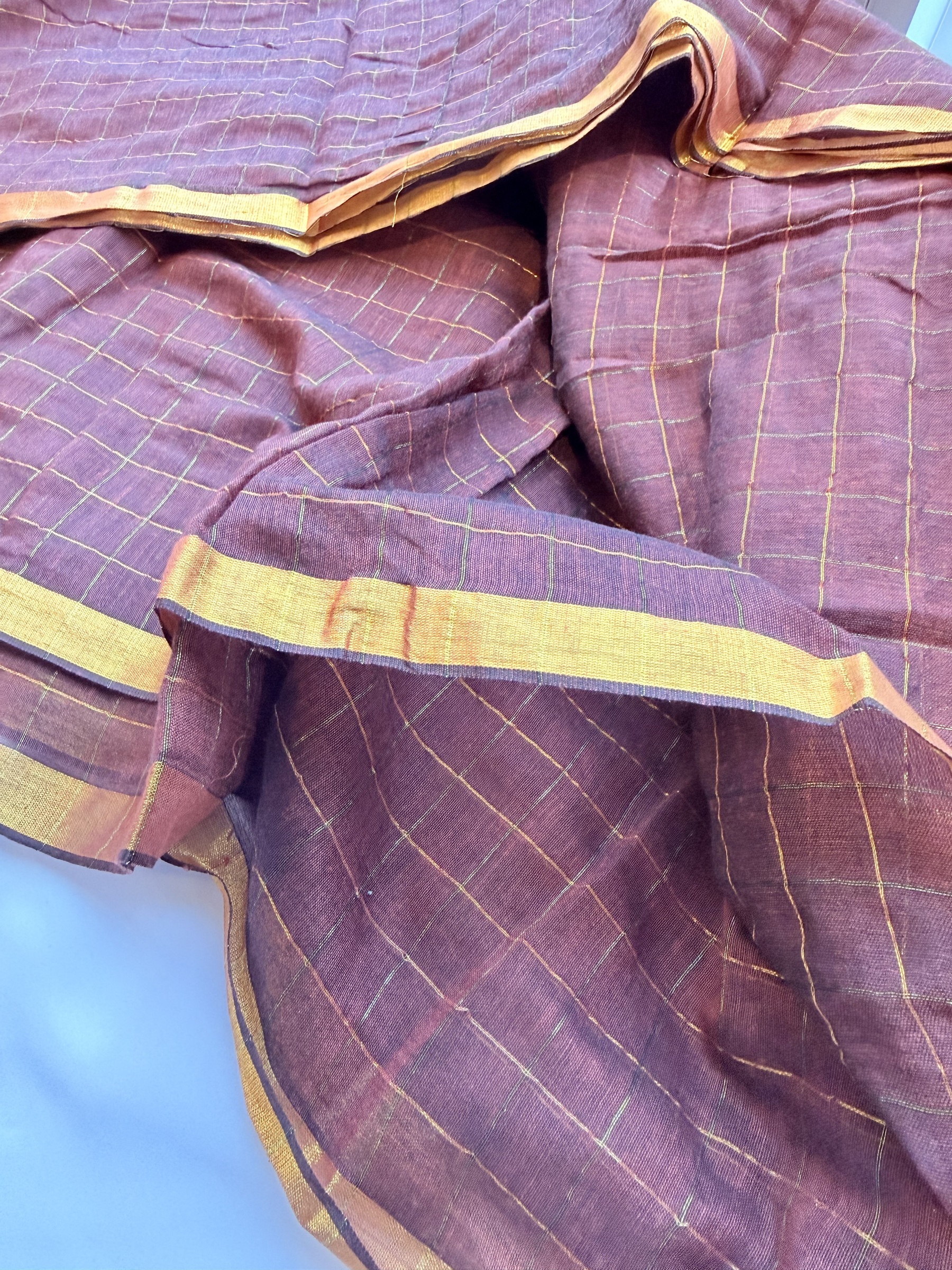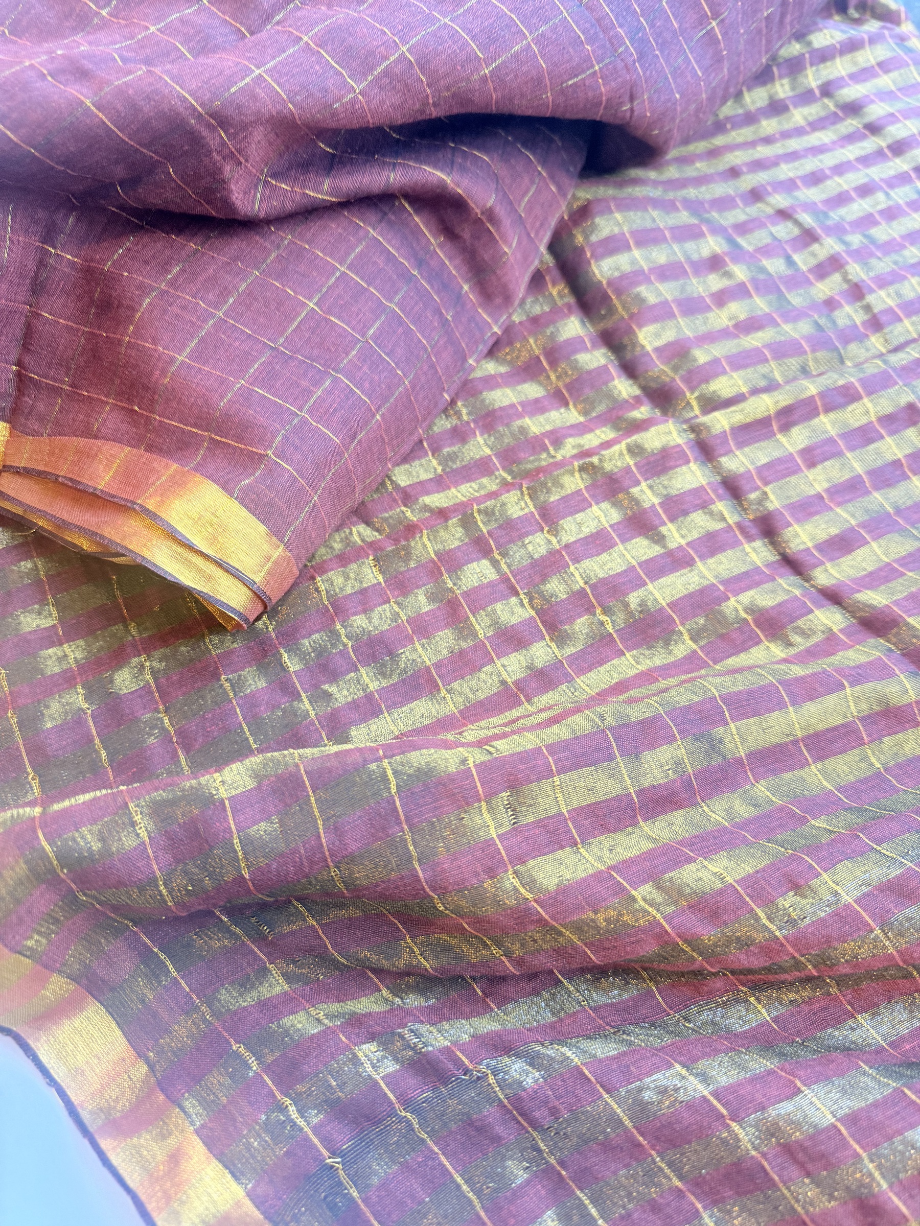 Soft and lightweight pure Mulmul cotton saree with fine zari checks design on body, contrast design gold pallu with pompoms and comes with attached running design blouse.