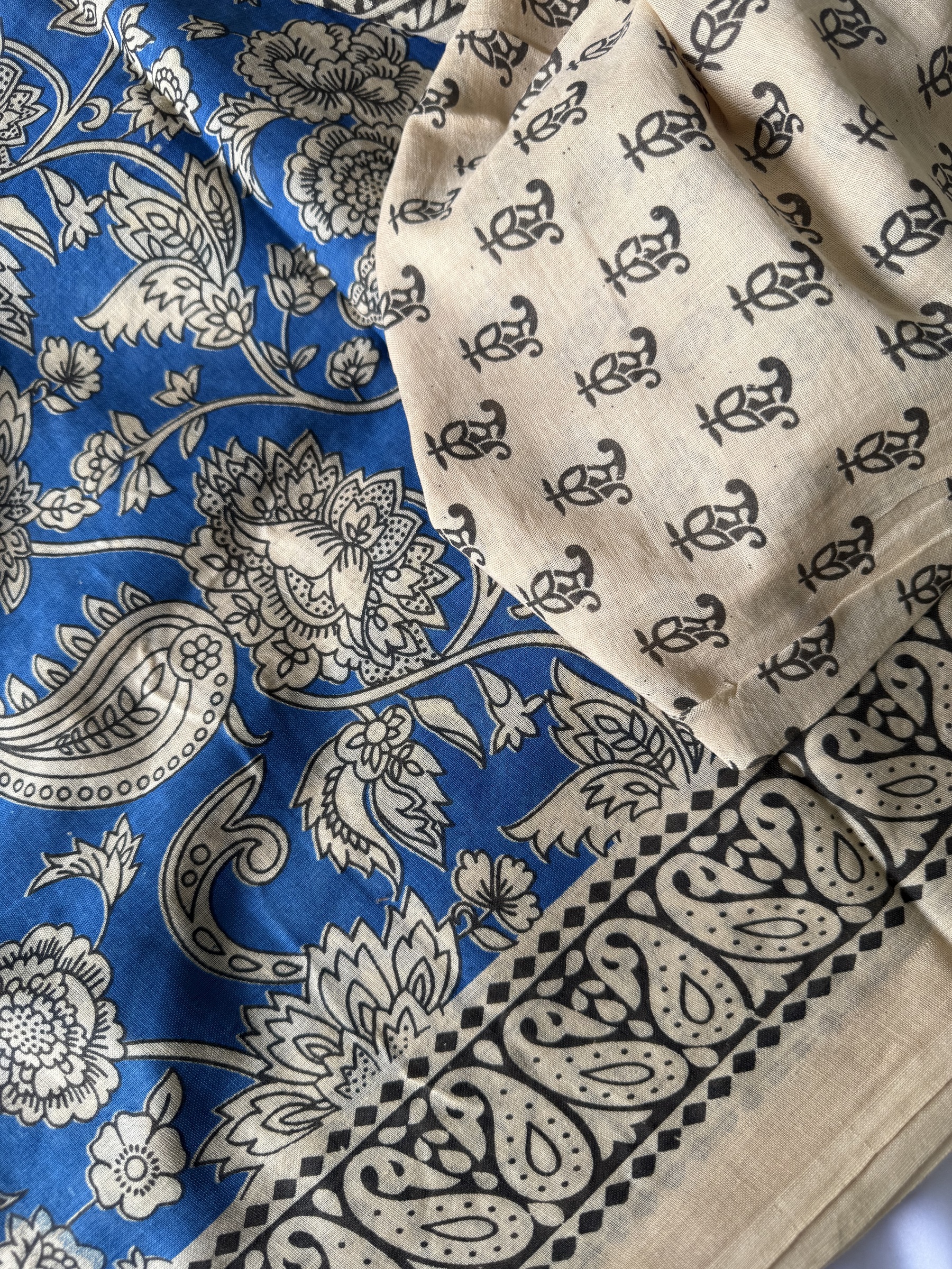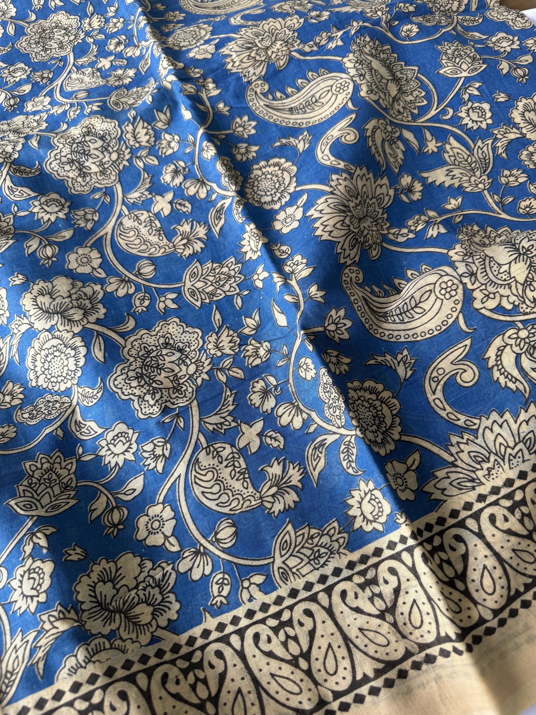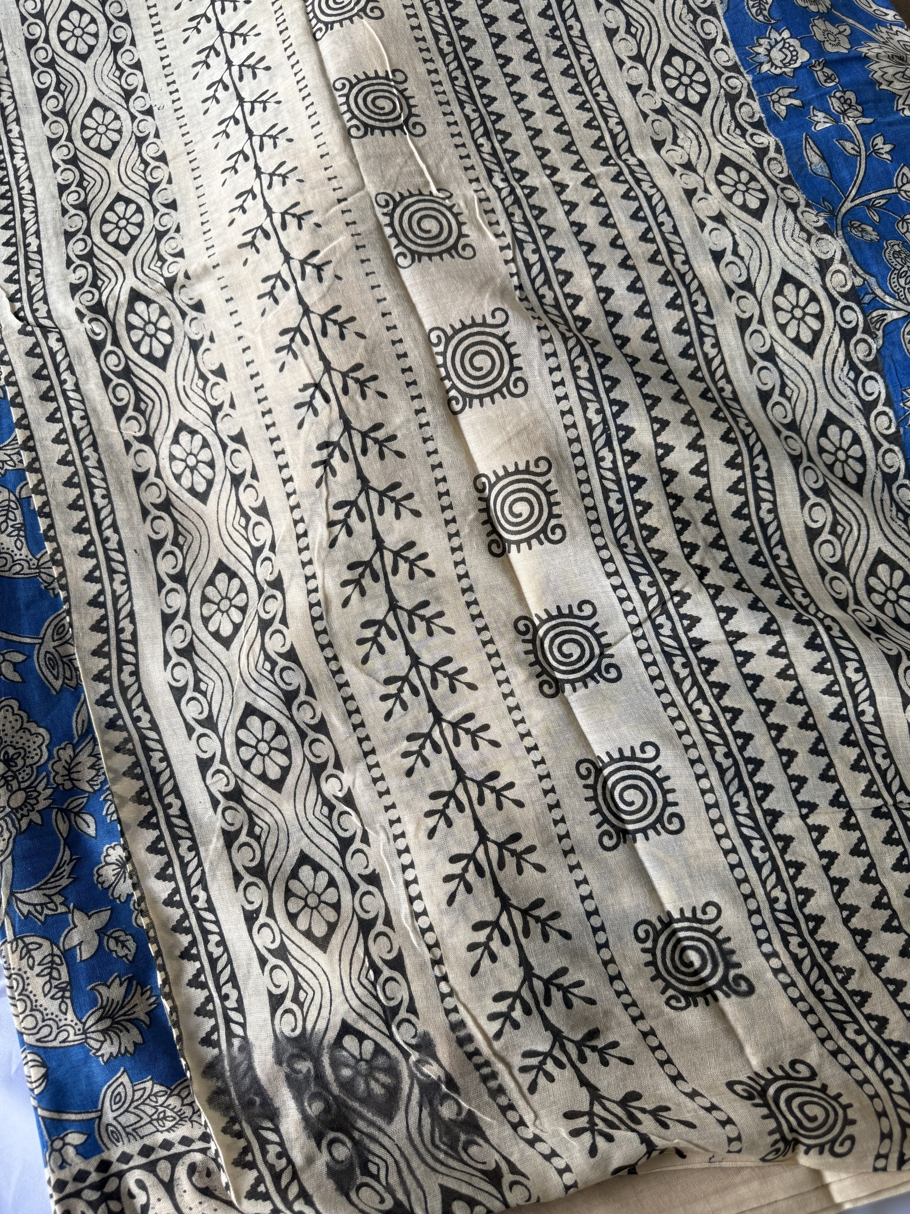 Lightweight cotton Kalamkari design saree with contrast design pallu and comes with attached contrast design blouse material (refer to the last picture for the blouse material).