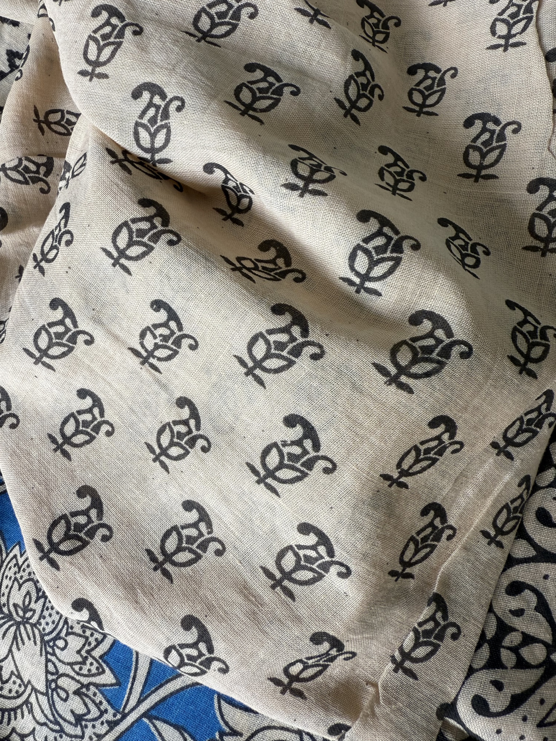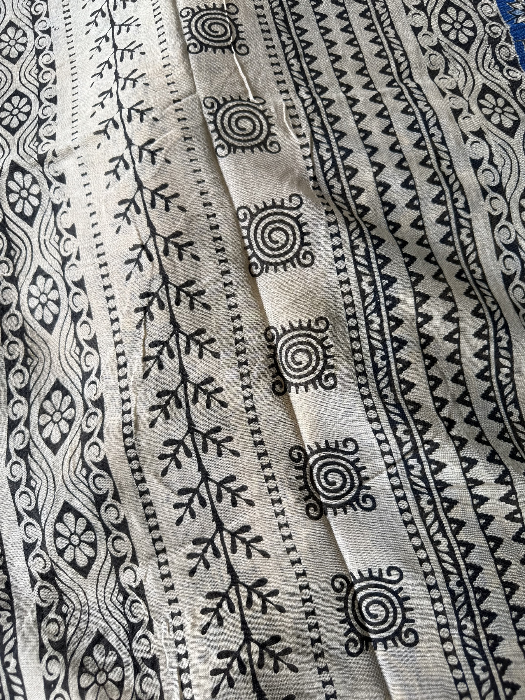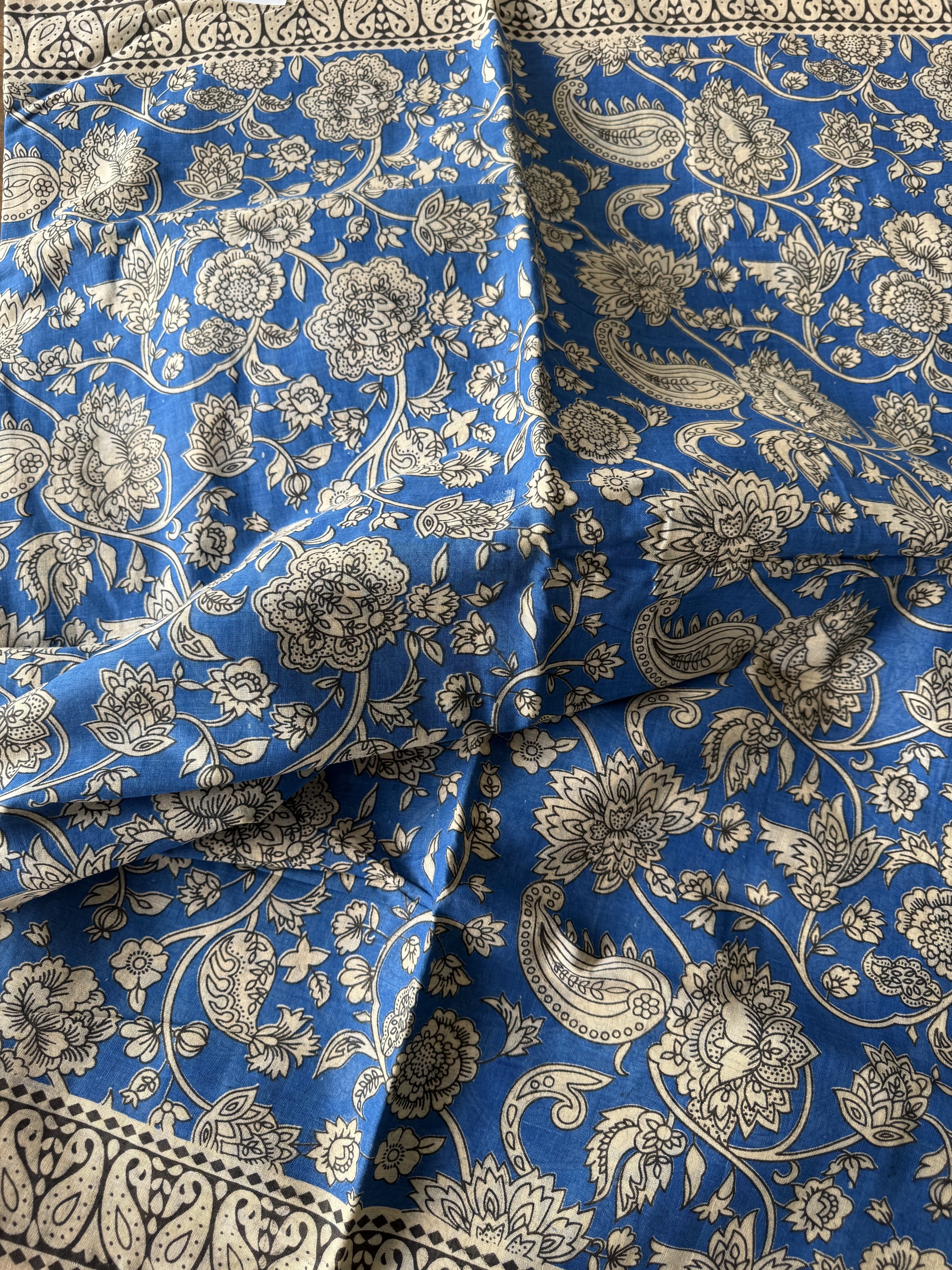 Lightweight cotton Kalamkari design saree with contrast design pallu and comes with attached contrast design blouse material (refer to the last picture for the blouse material).