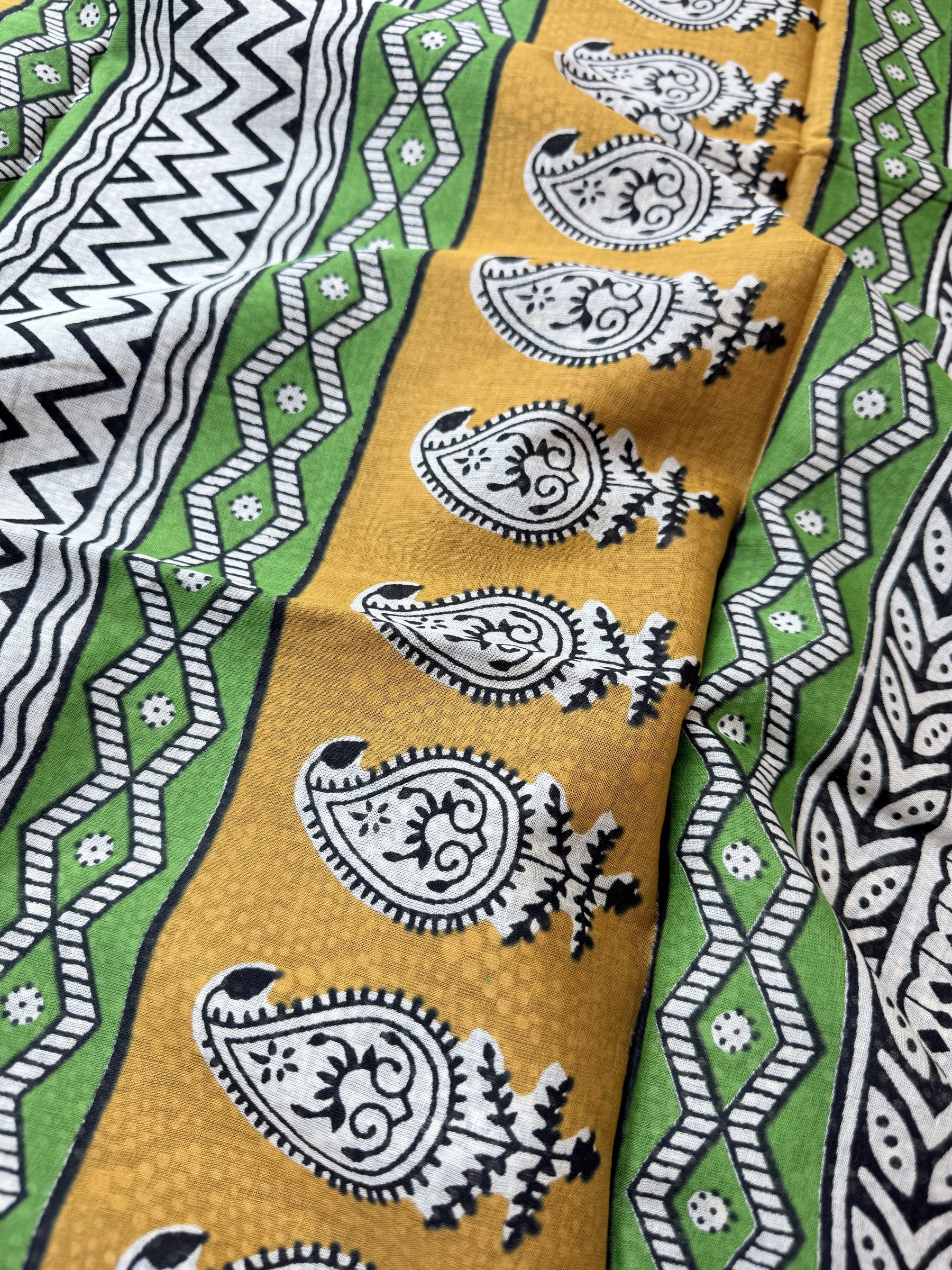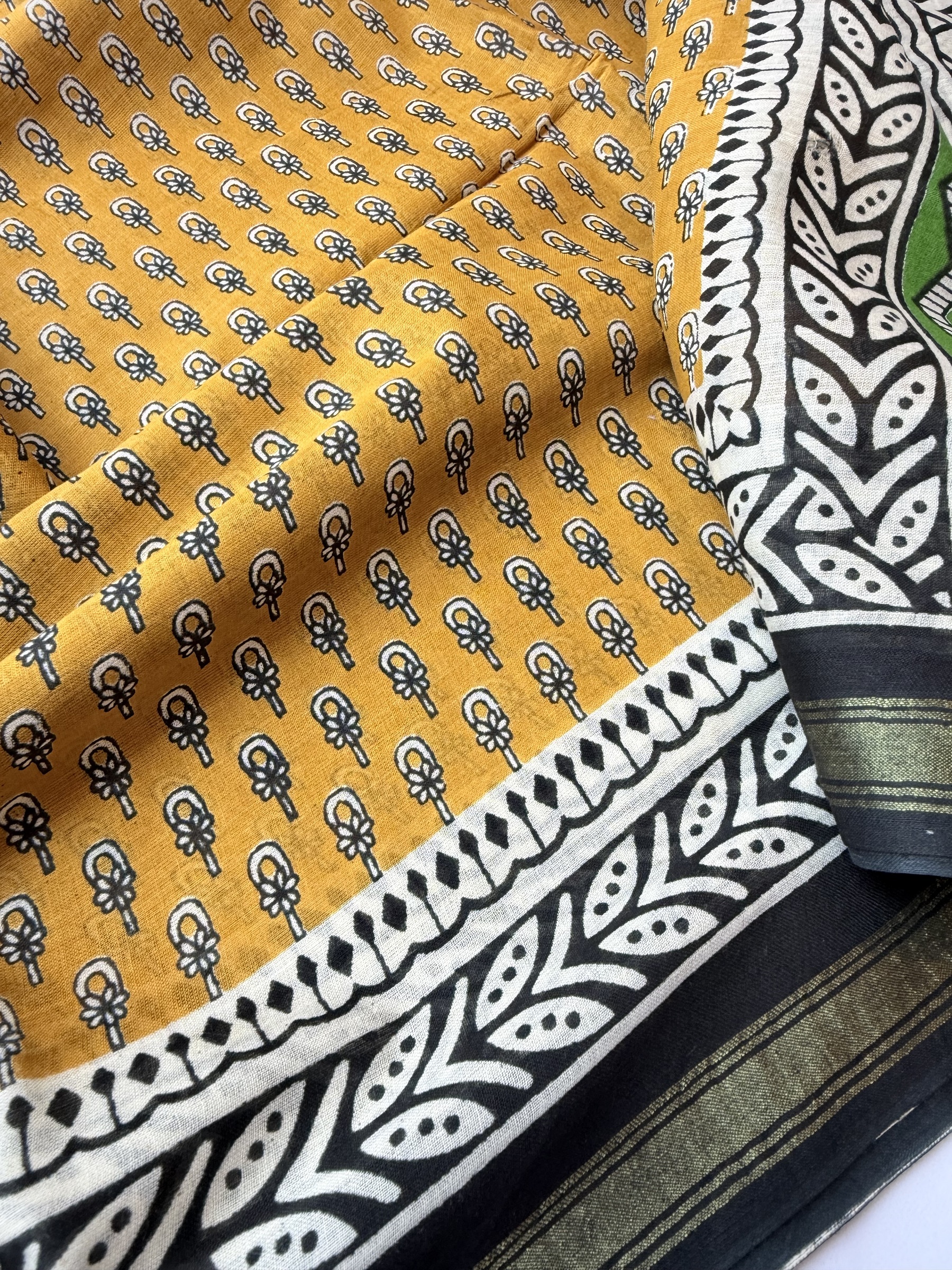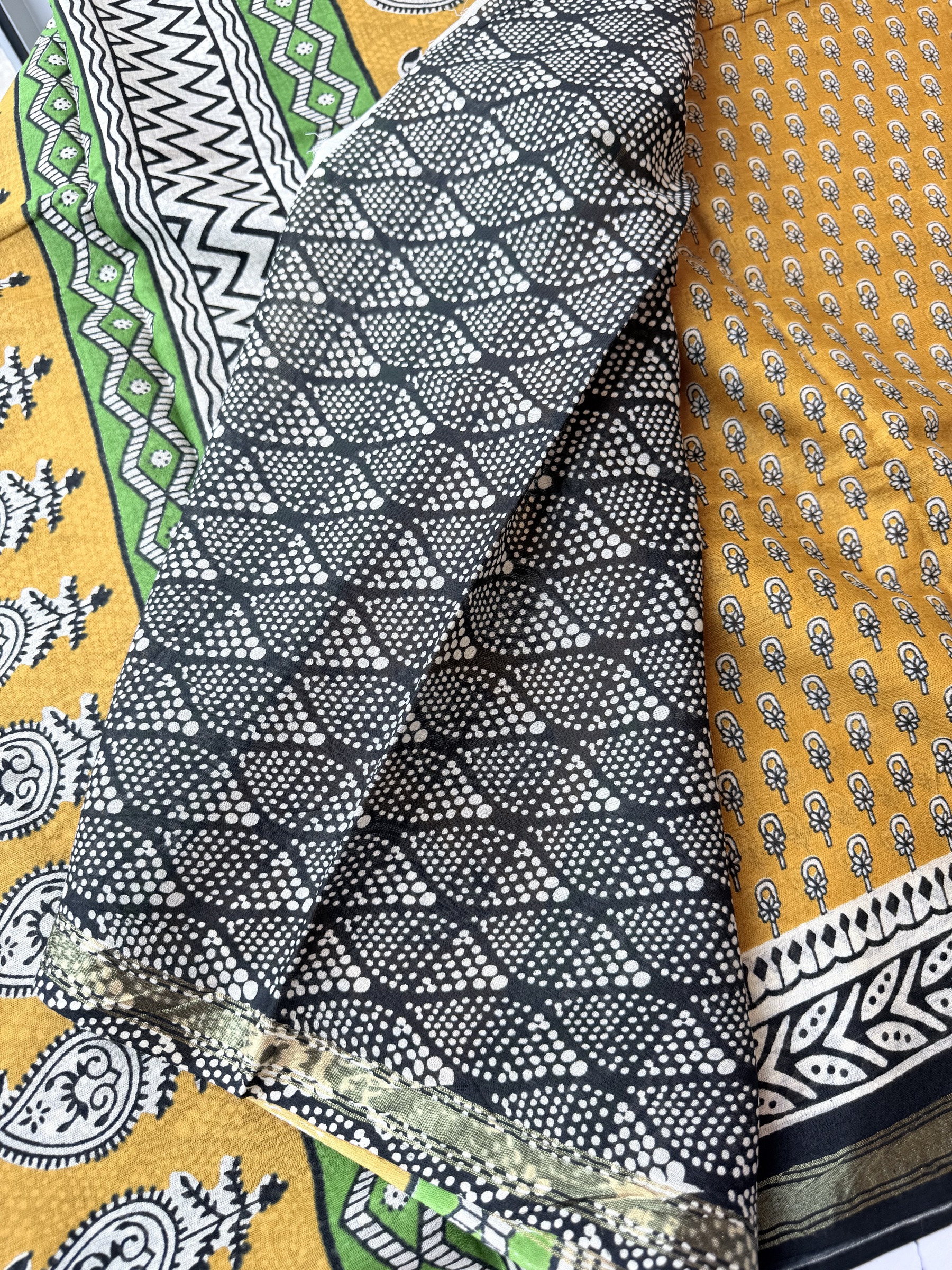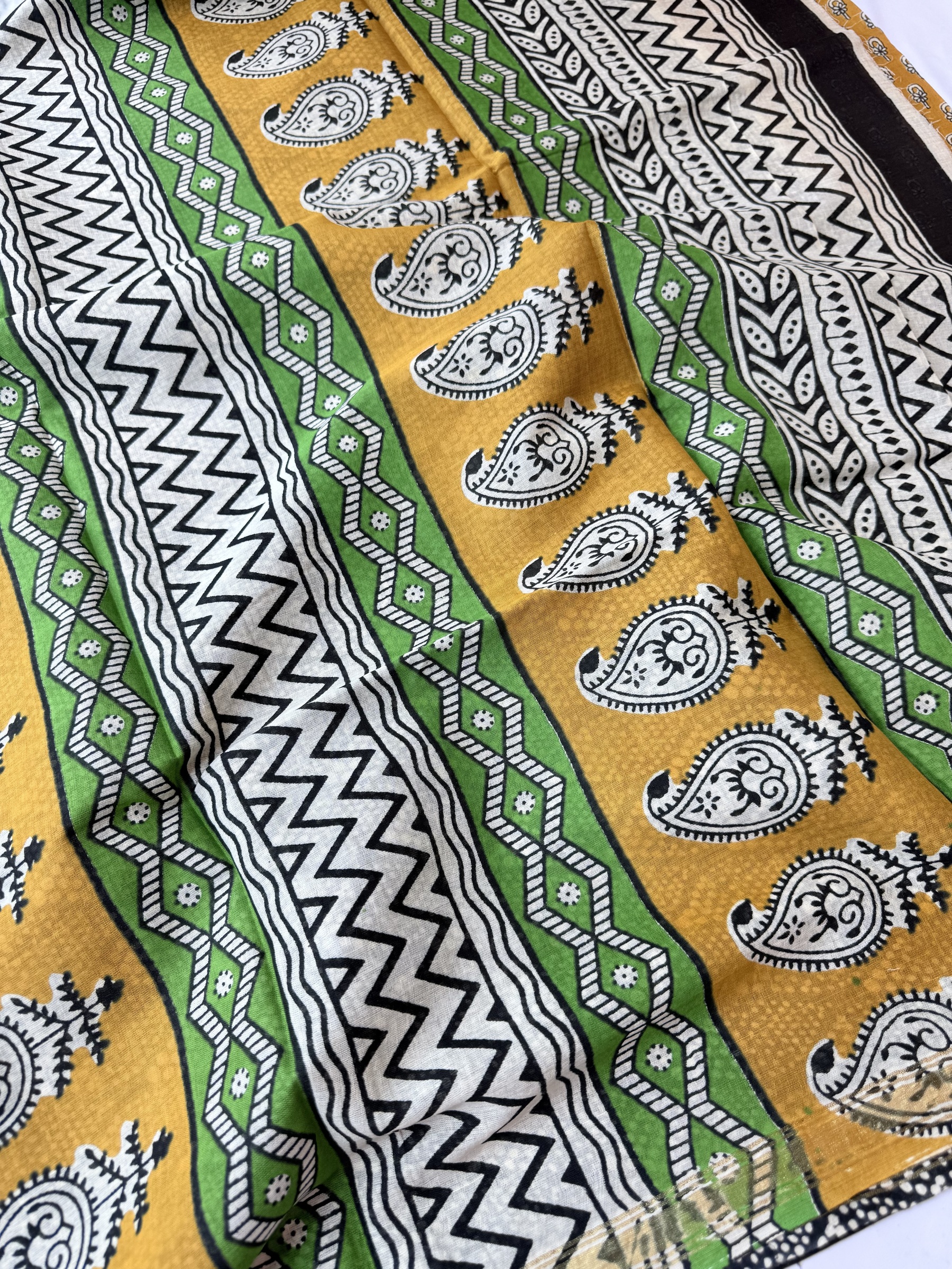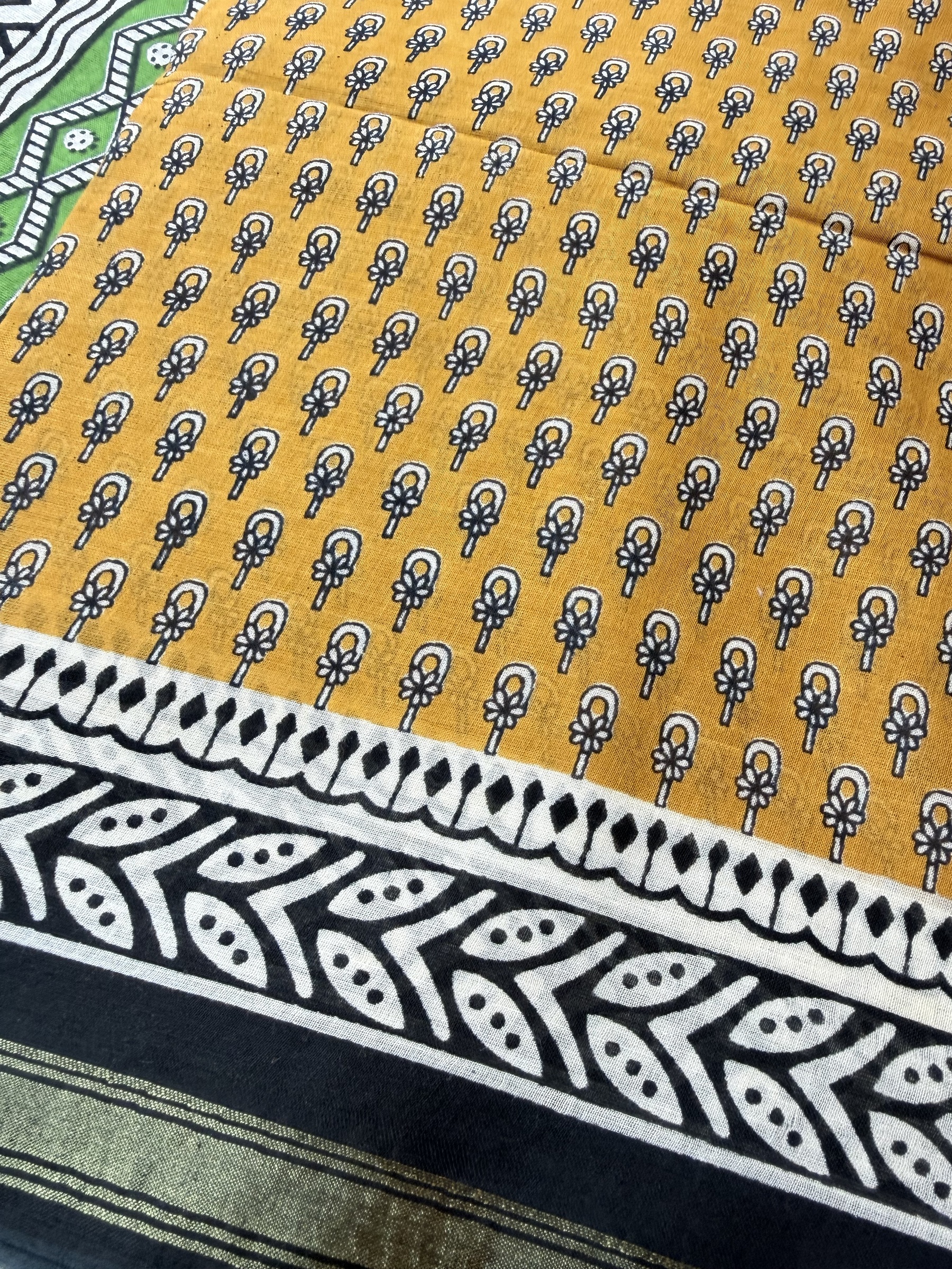 Ethnic design printed soft cotton saree with contrast design blouse material (refer to last picture for blouse design).