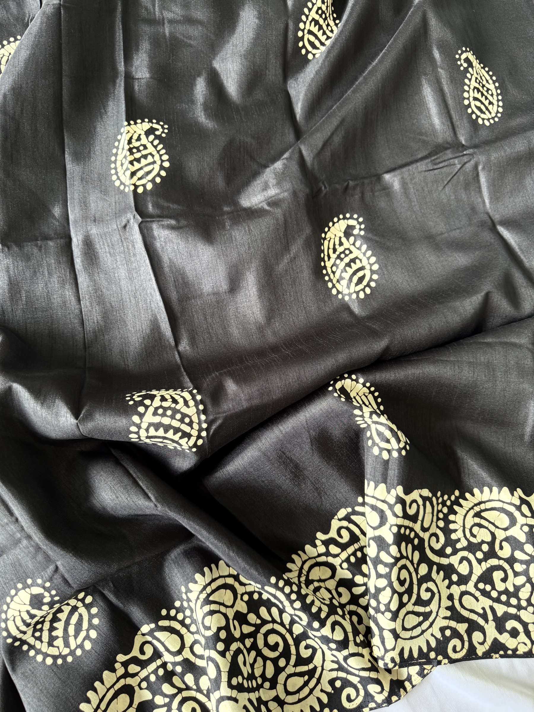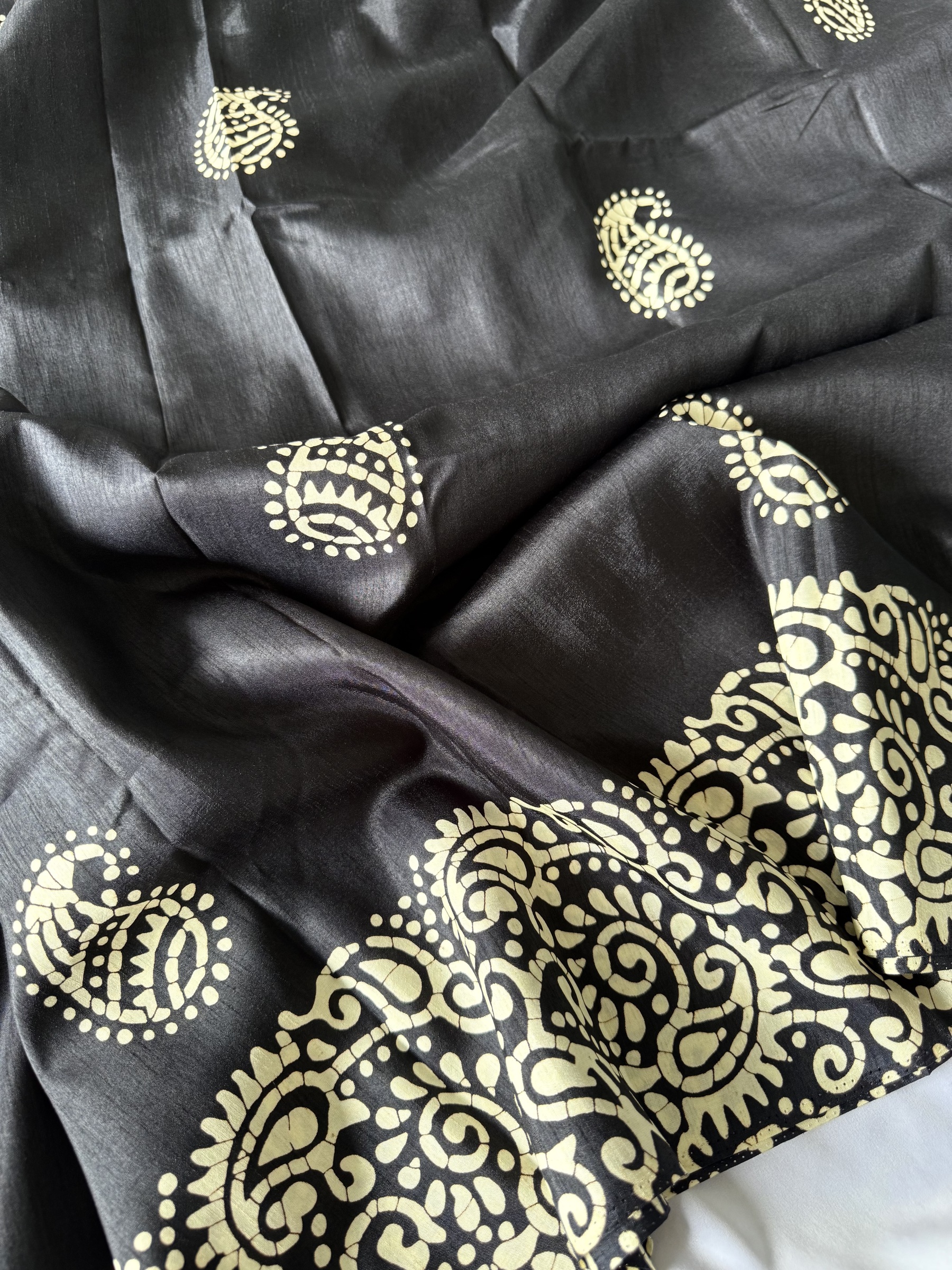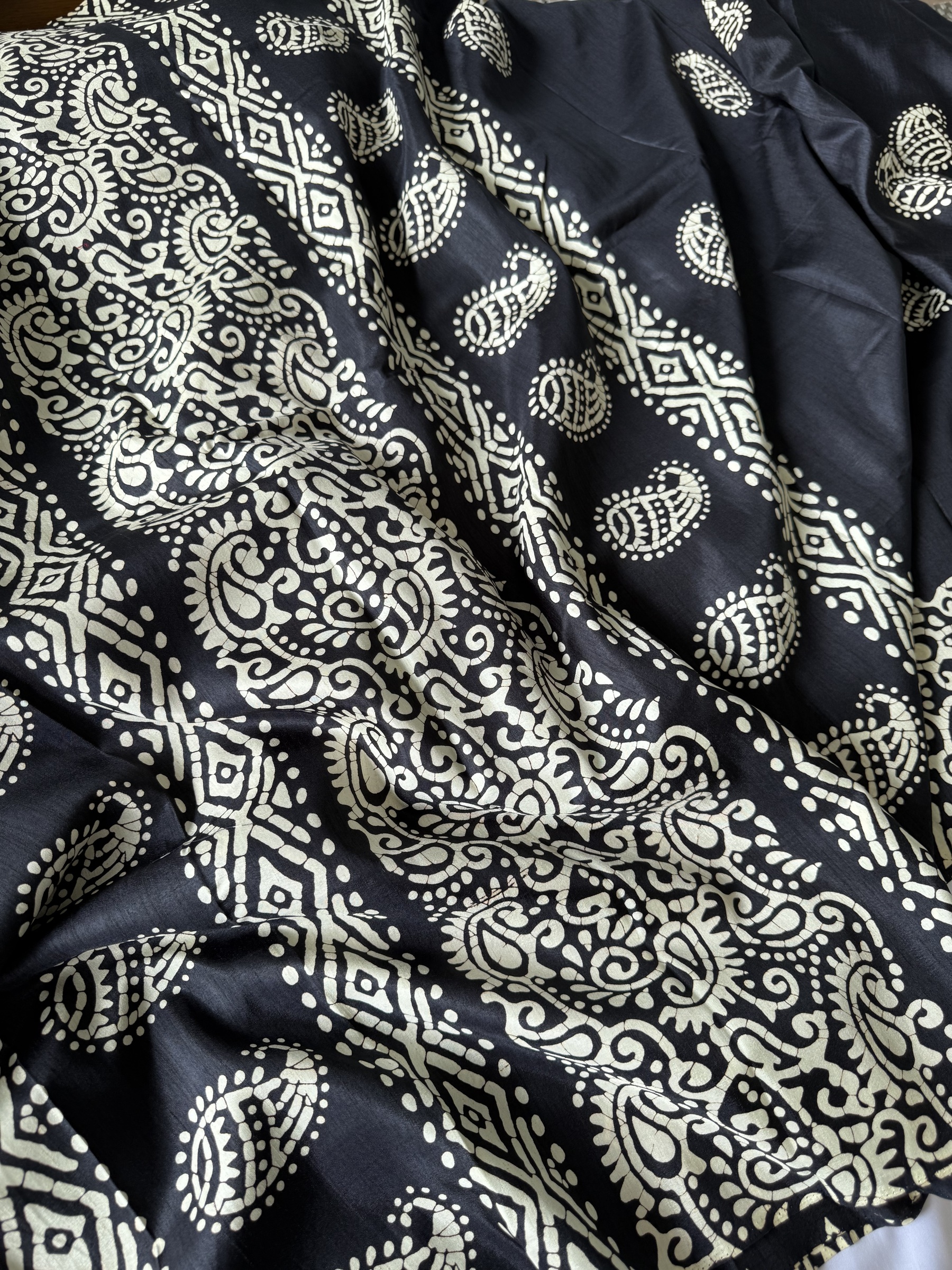 Synthetic mix soft and easy to drape Dola Silk paisley design saree with contrast design pallu and contrast design attached blouse material.