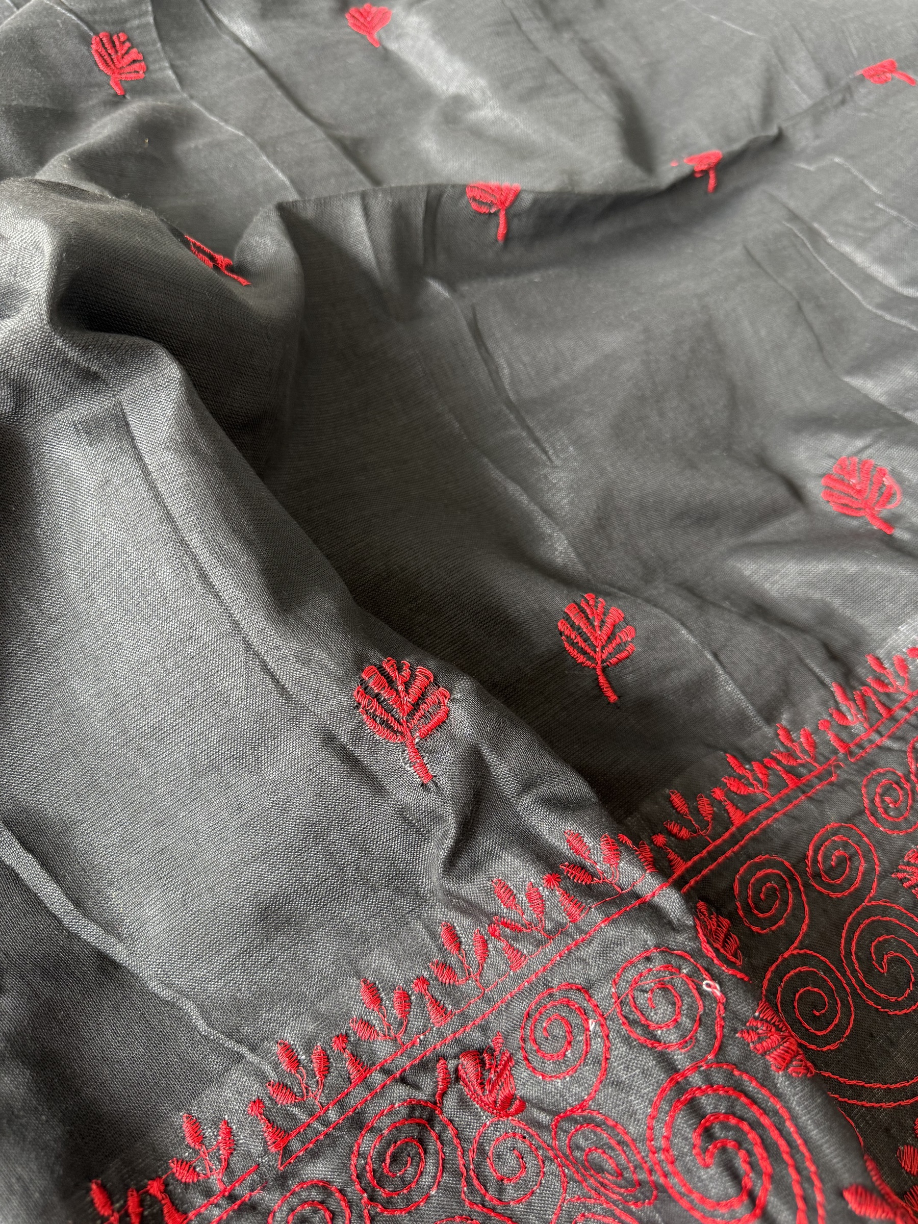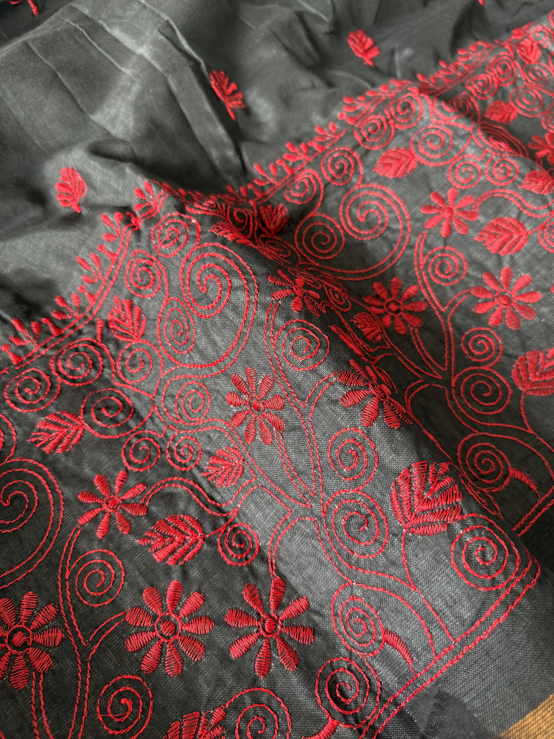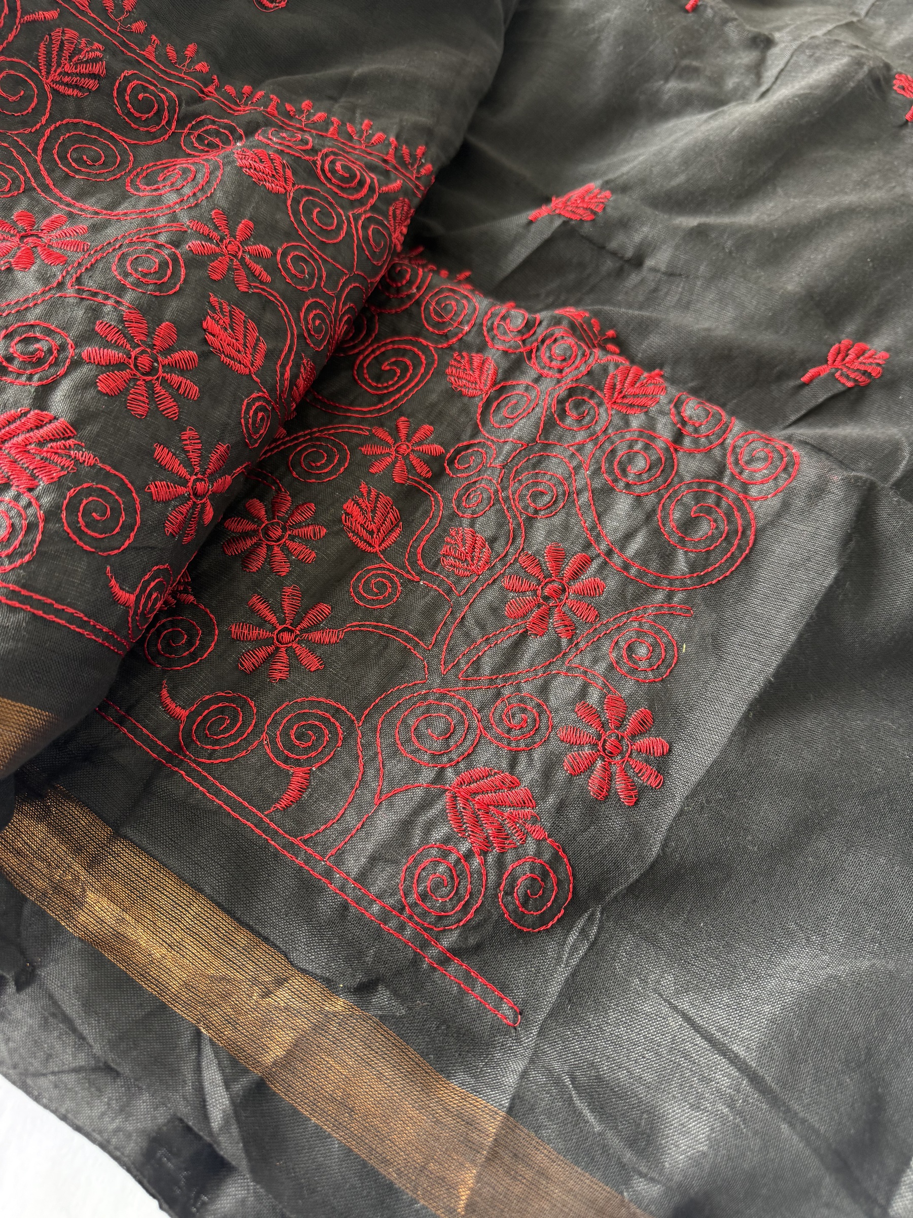 Black colour mixed cotton saree with thread floral embroidery work on body and bottom border and comes with attached running colour blouse material.