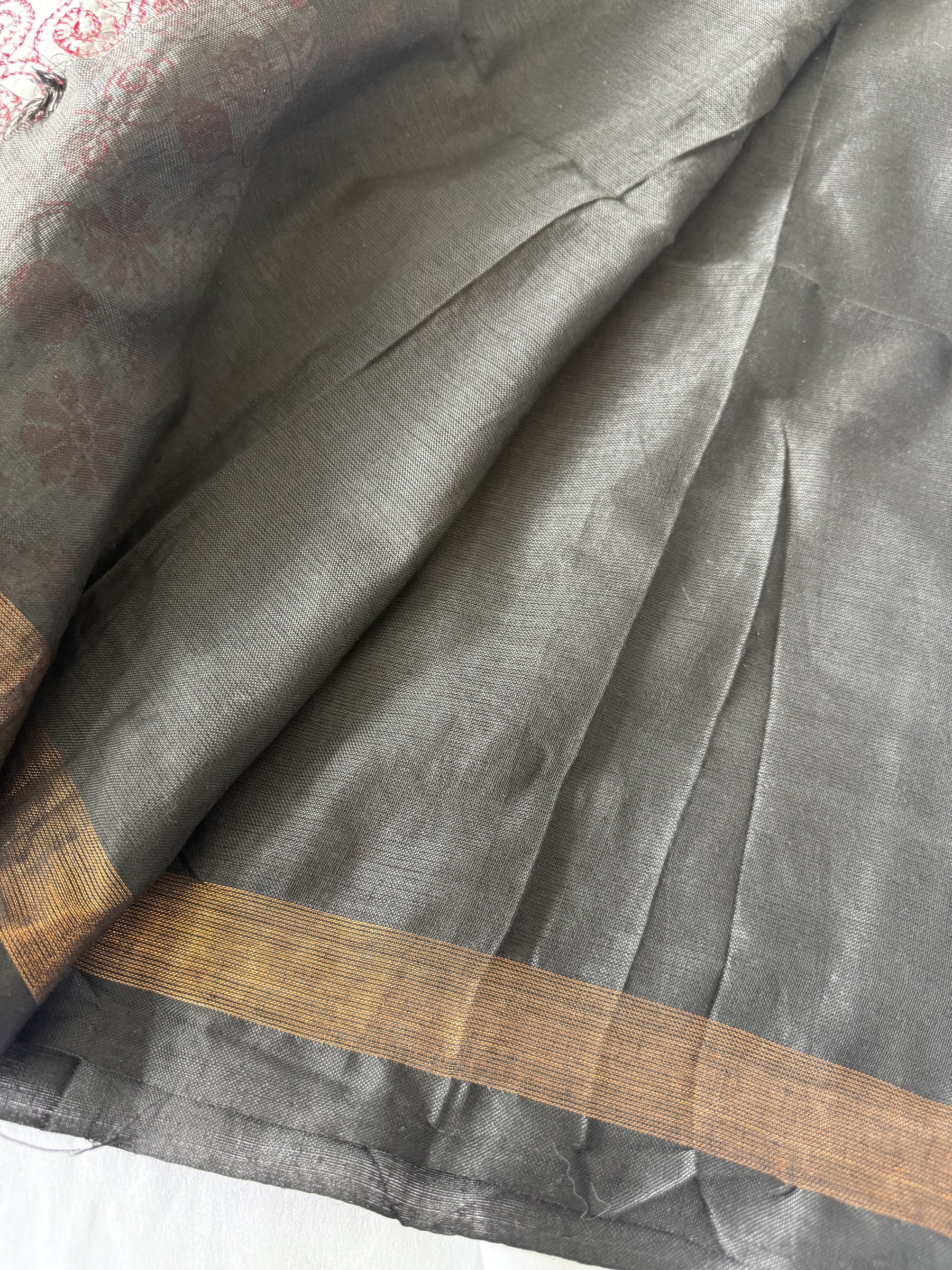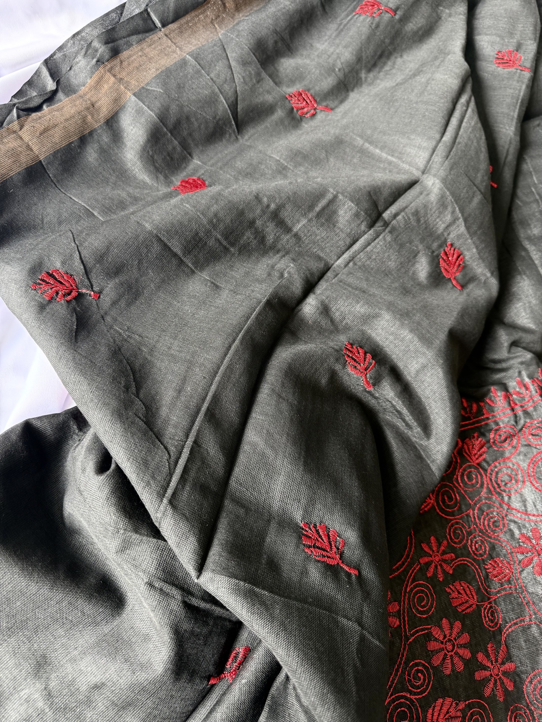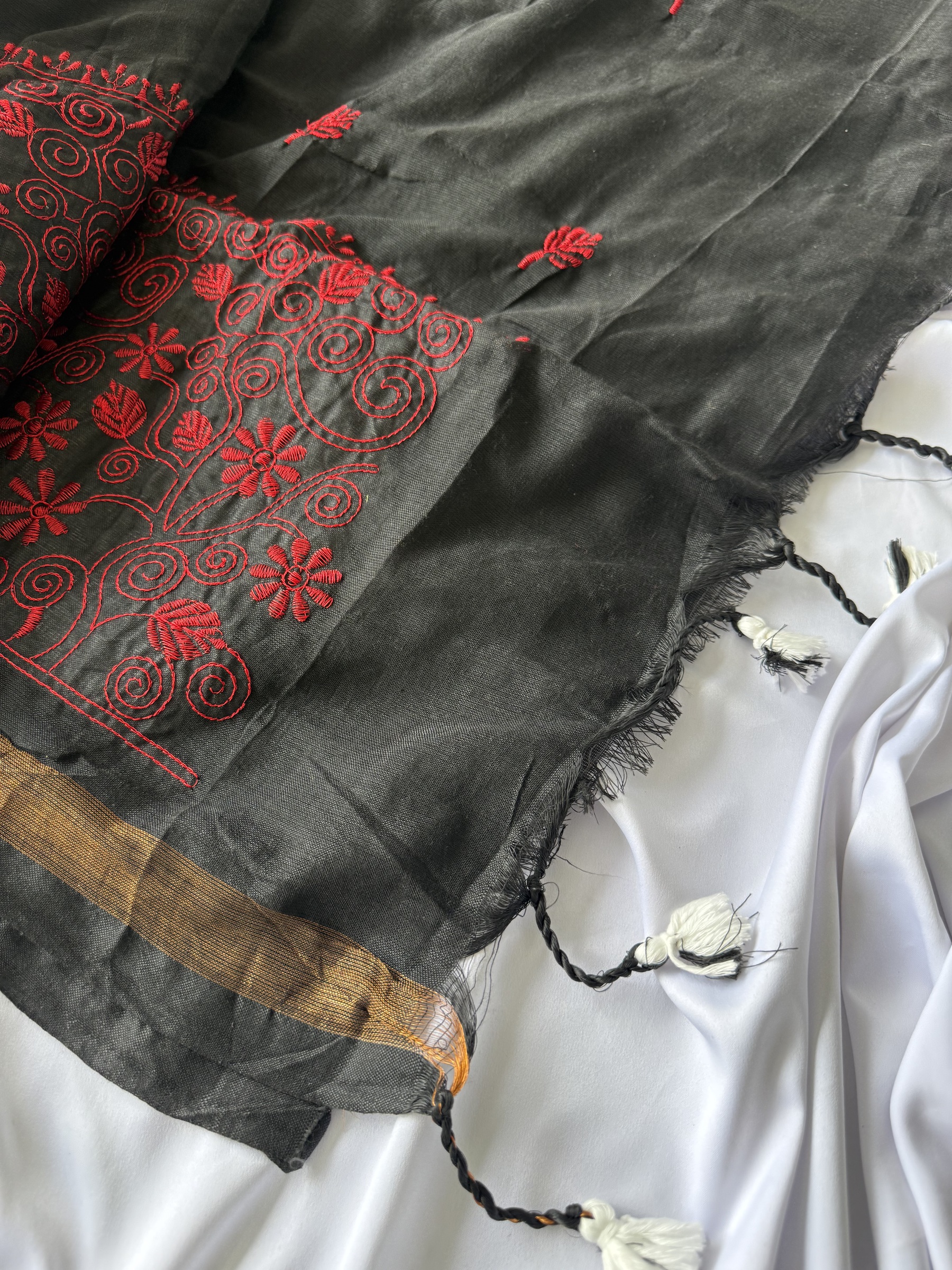 Black colour mixed cotton saree with thread floral embroidery work on body and bottom border and comes with attached running colour blouse material.