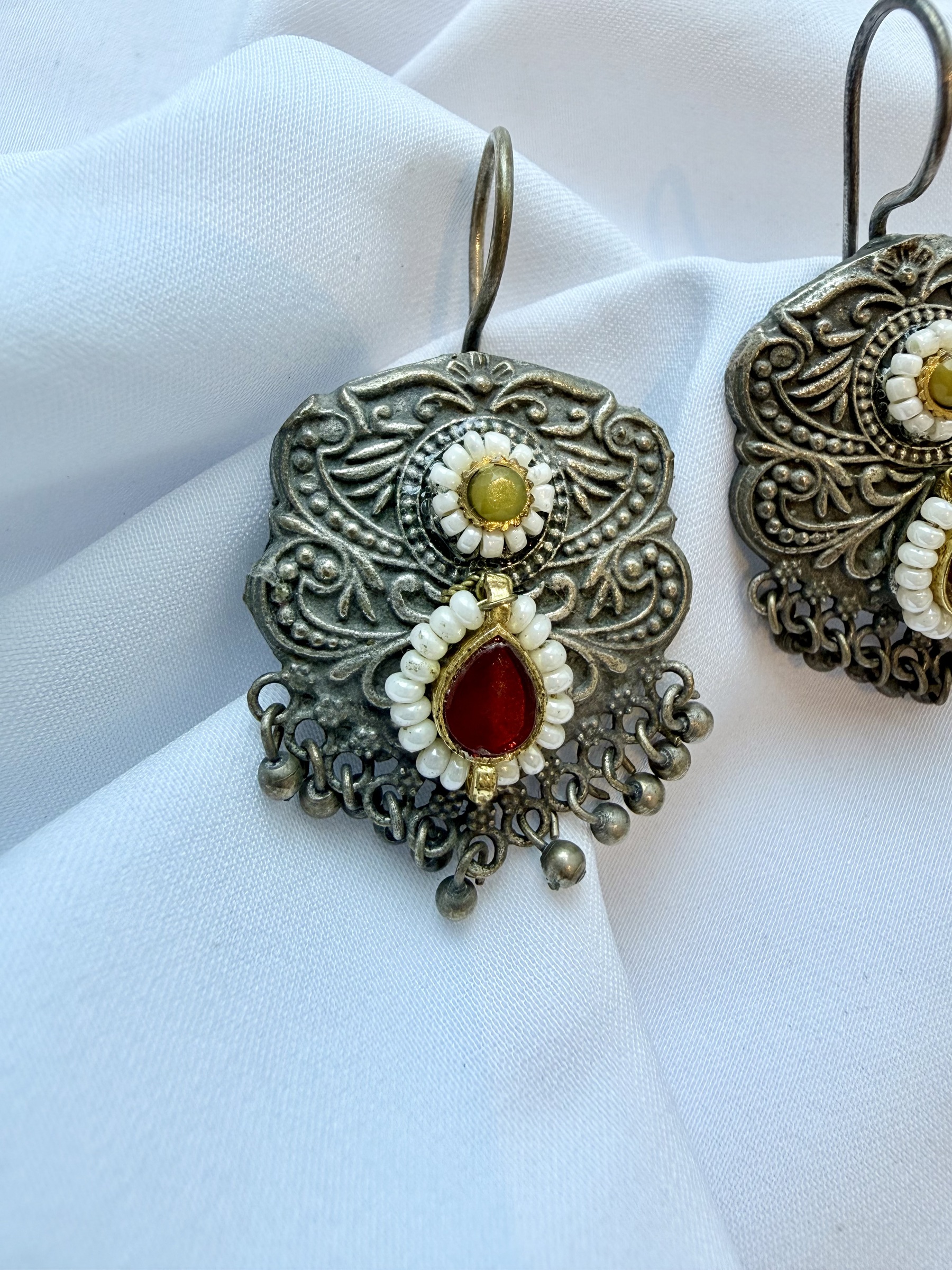Oxidized silver Pachi Kundan replice ethnic earrings.