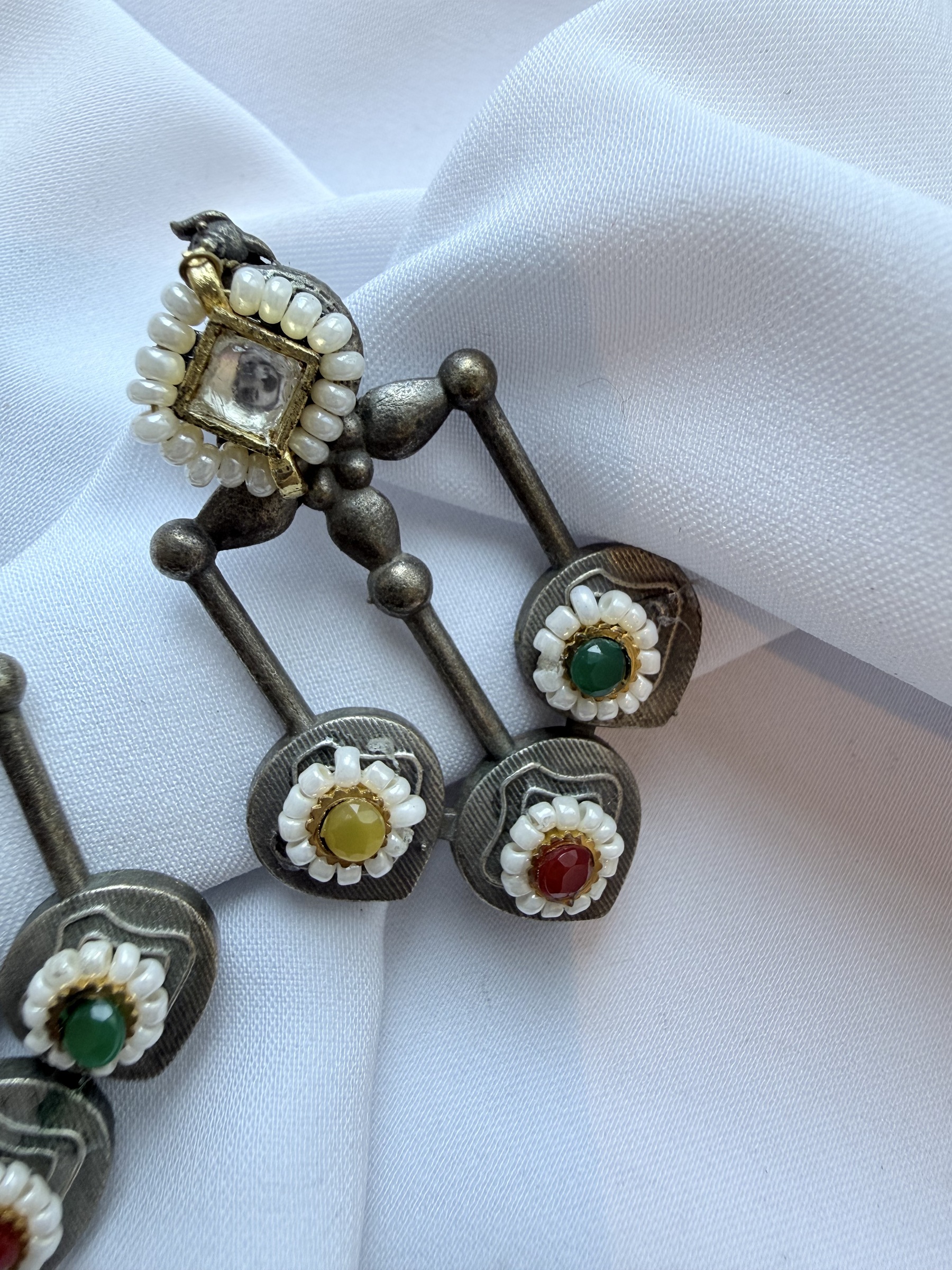 Oxidized silver Pachi Kundan replice ethnic earrings.