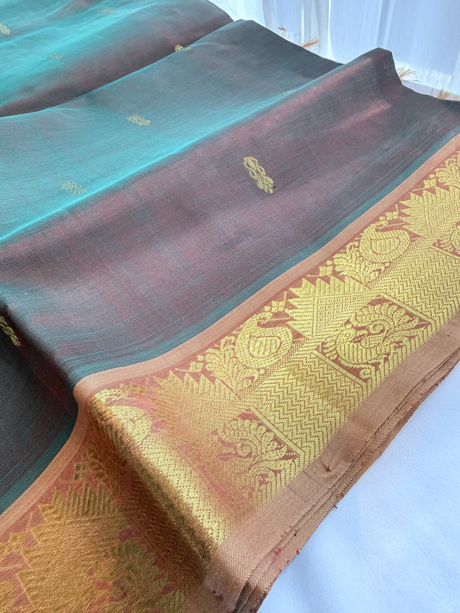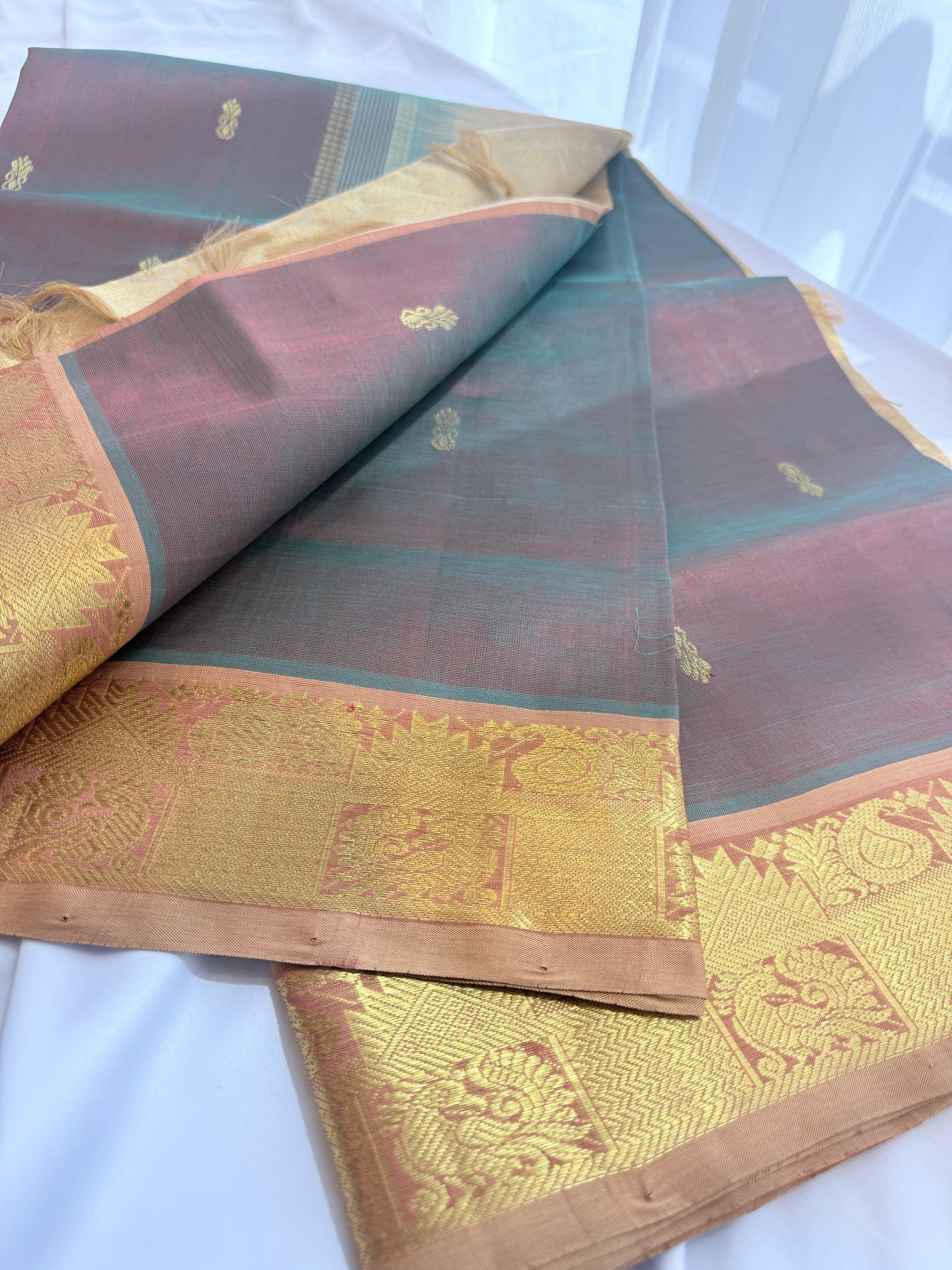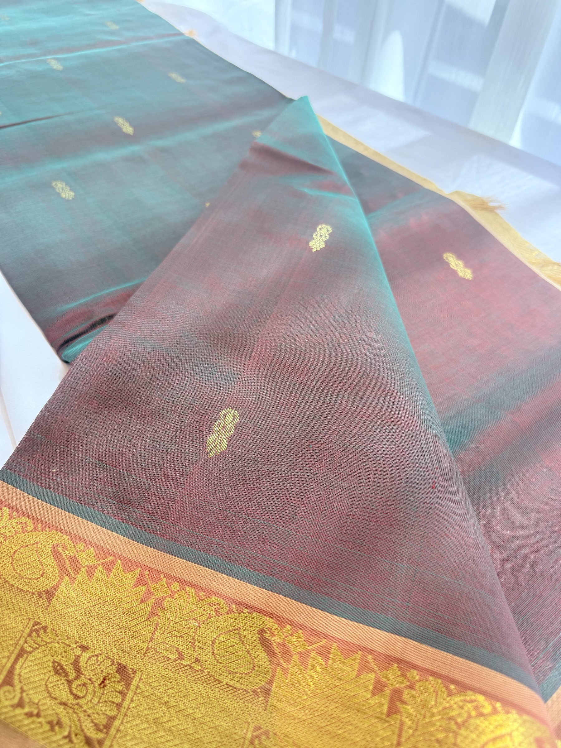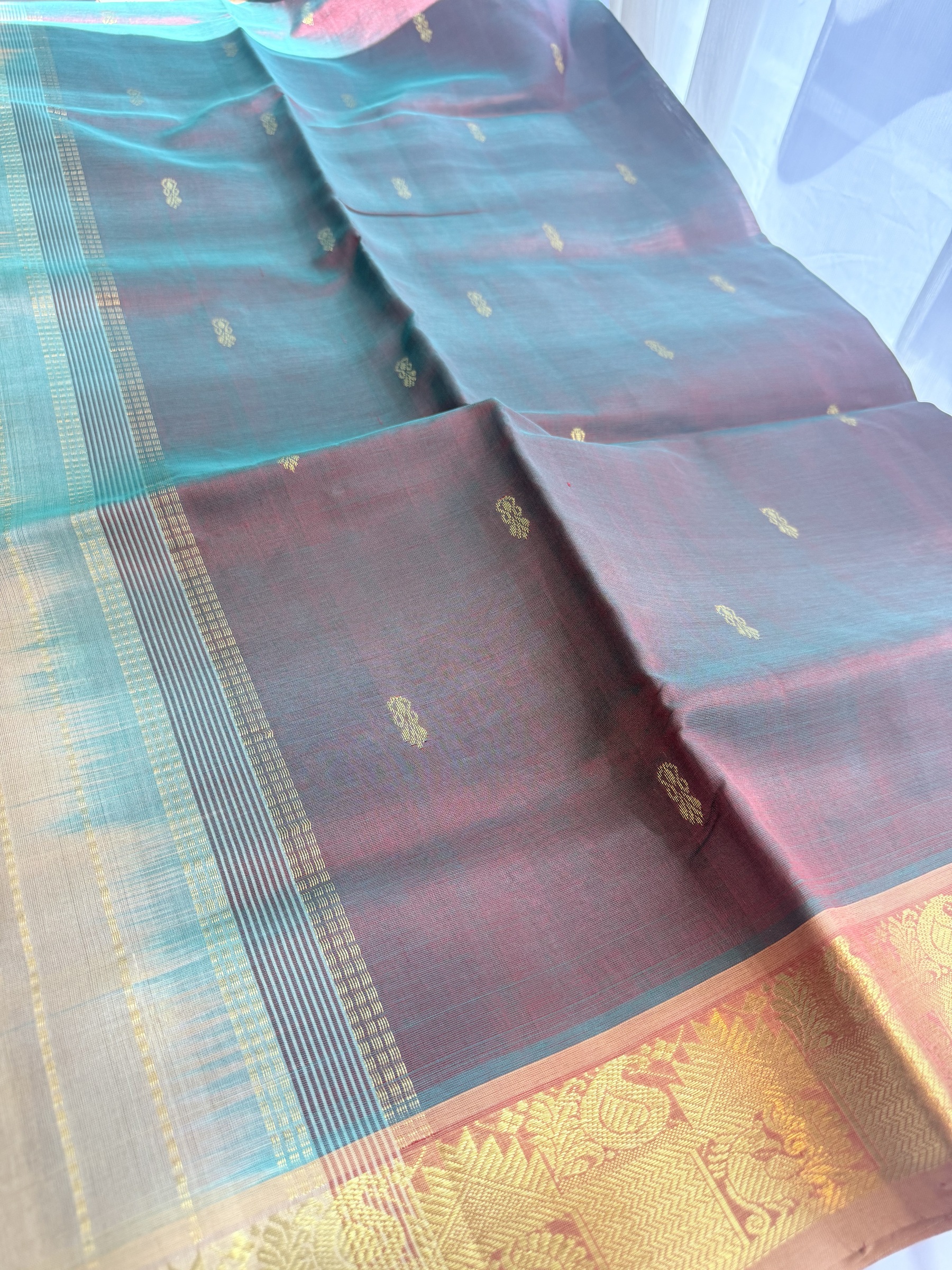 Dual tone shade pure silk cotton with buttas on body & comes with contrast colour pallu and attached contrast colour blouse material ( refer to the last picture for the blouse colour).