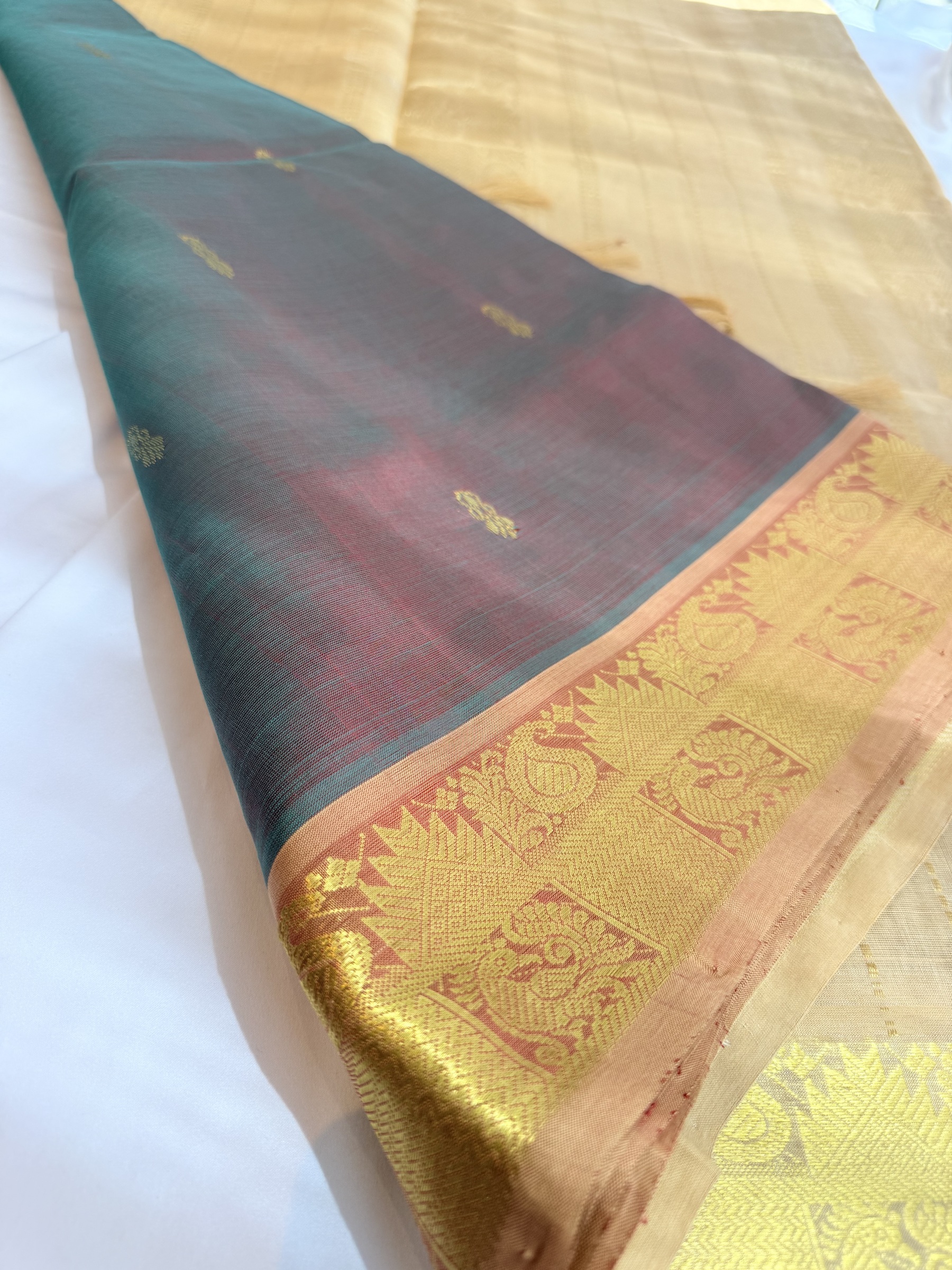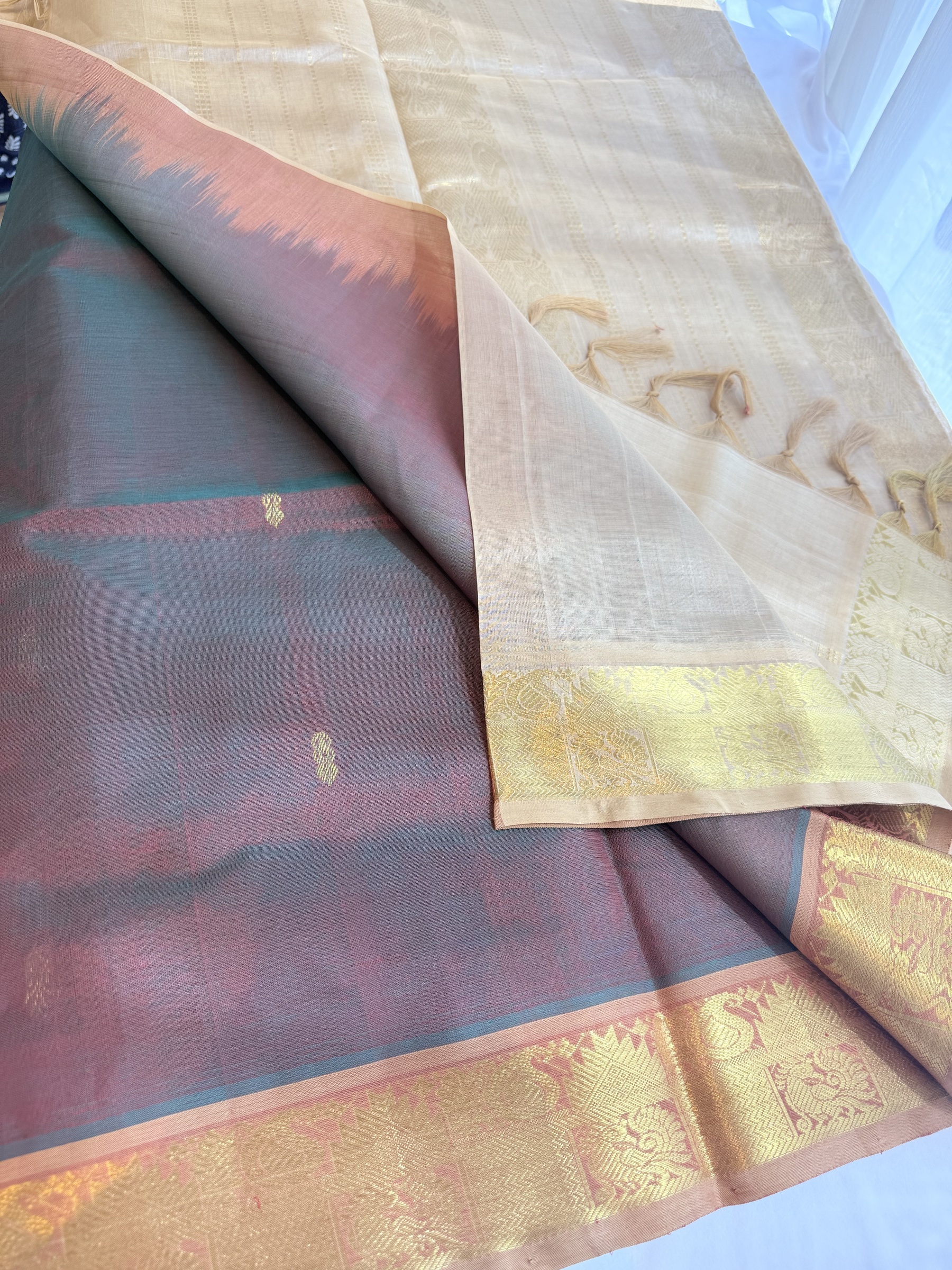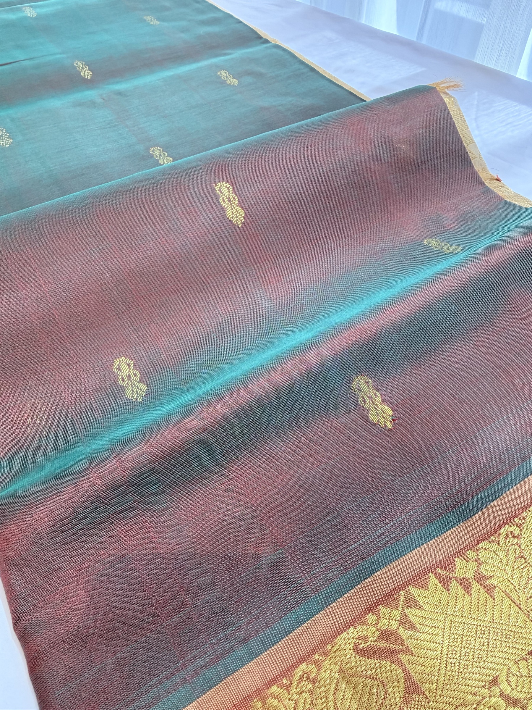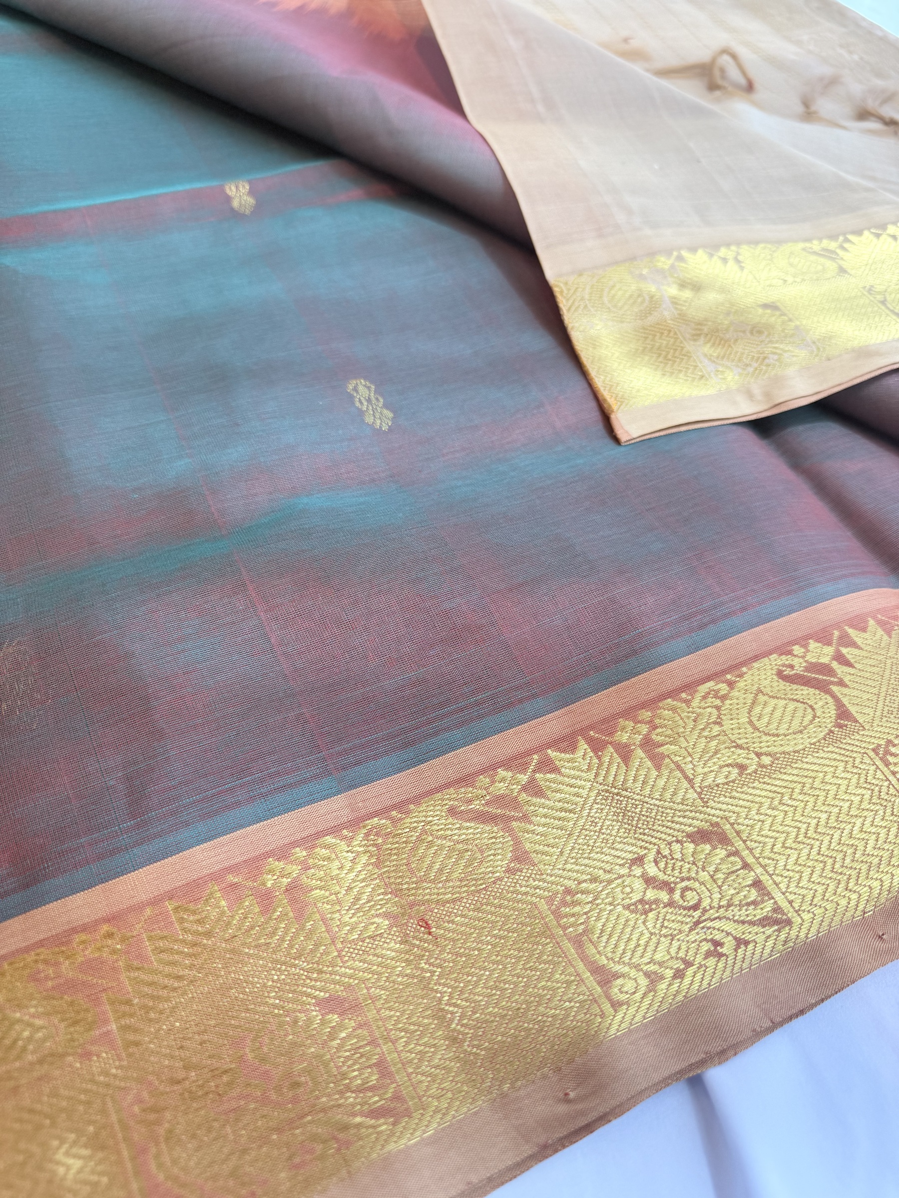 Dual tone shade pure silk cotton with buttas on body & comes with contrast colour pallu and attached contrast colour blouse material ( refer to the last picture for the blouse colour).