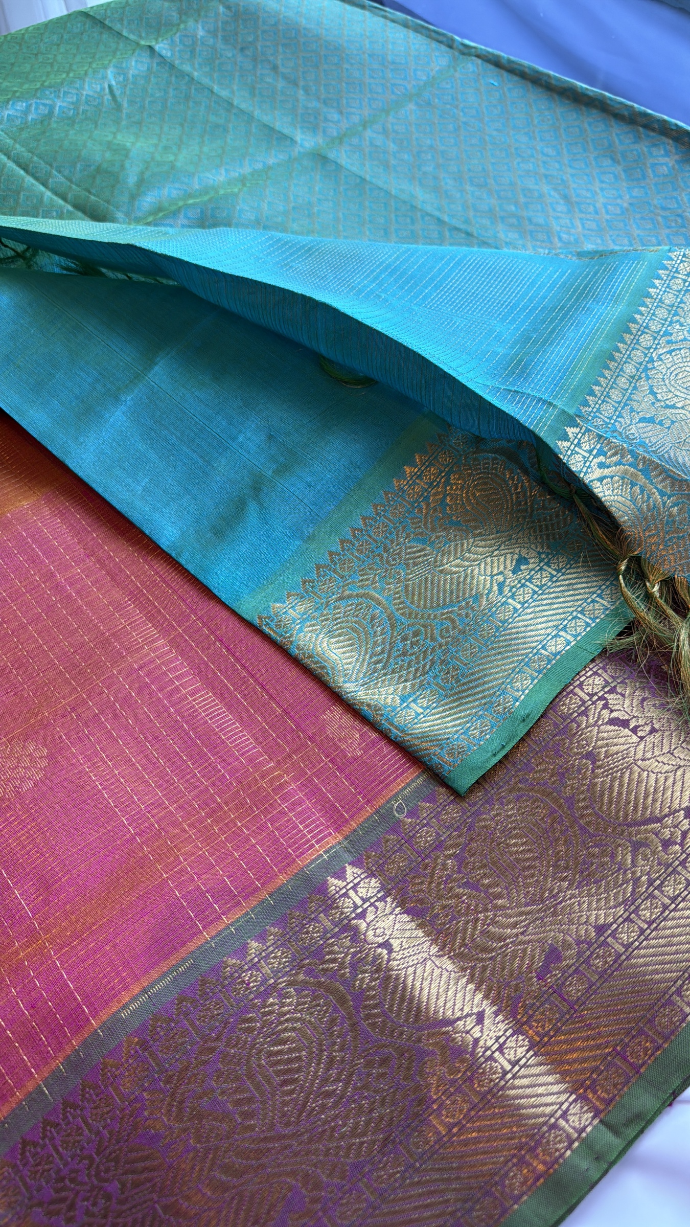 Pure silk cotton in vibrant dual tone pink hues with fine zari checks on body & comes with contrast colour pallu and attached contrast colour blouse material ( refer to the last picture for the blouse colour).