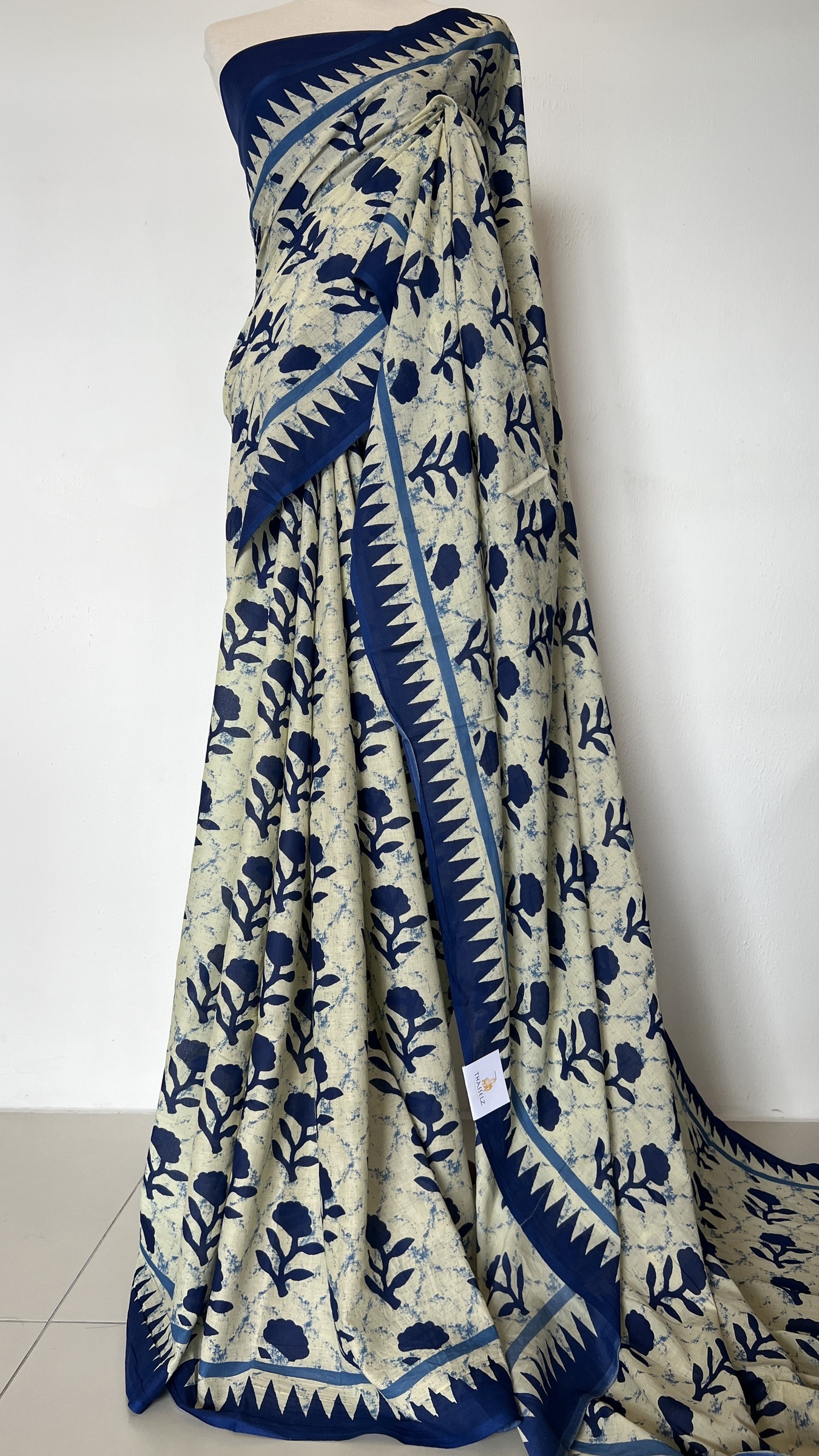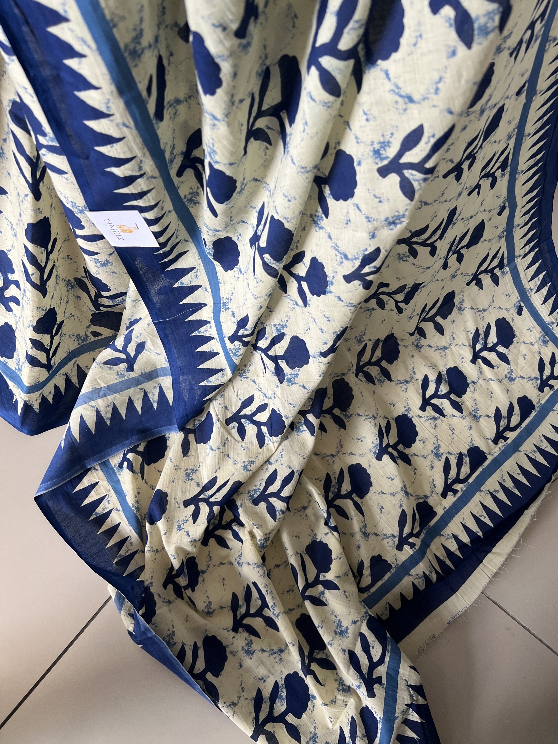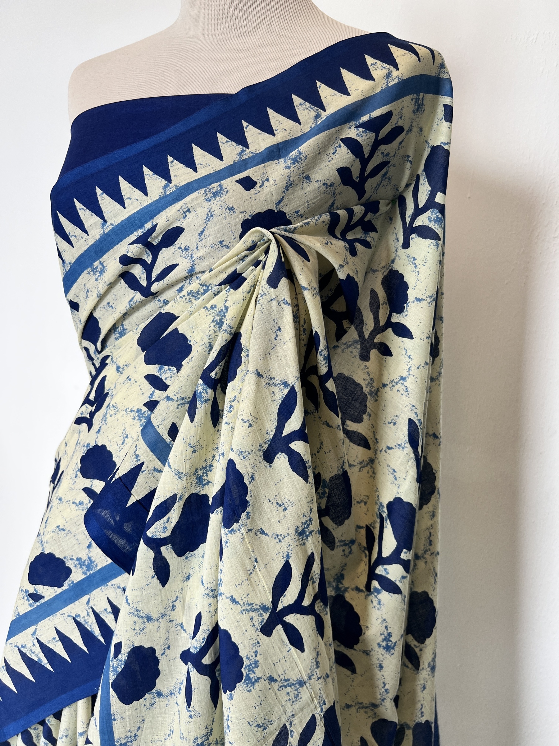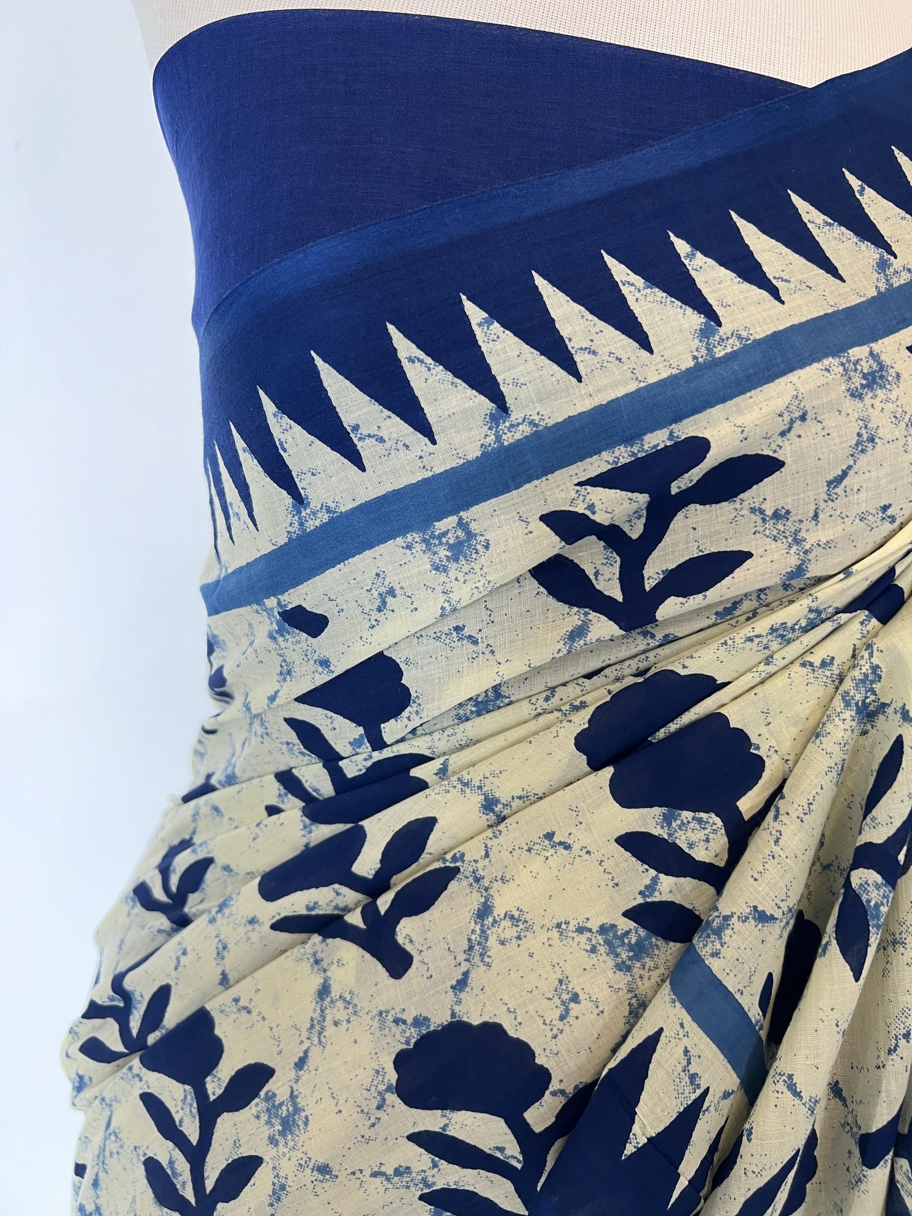 Lightweight block print Indigo cotton saree with contrast colour plain blue material.
