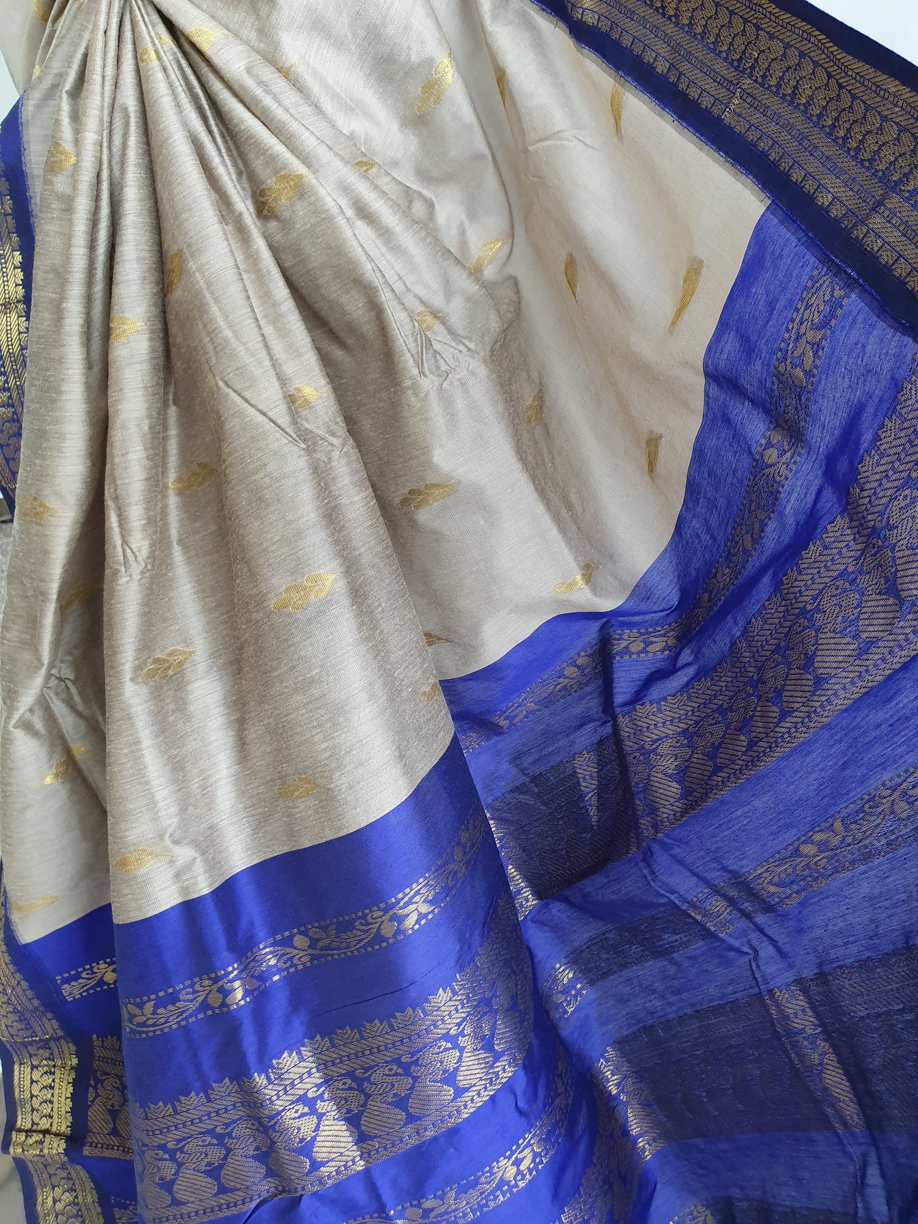 Traditional Kalyani Cotton Saree with gold buttas on body and contrast colour attached blouse, grand pallu and contrast colour zari border.