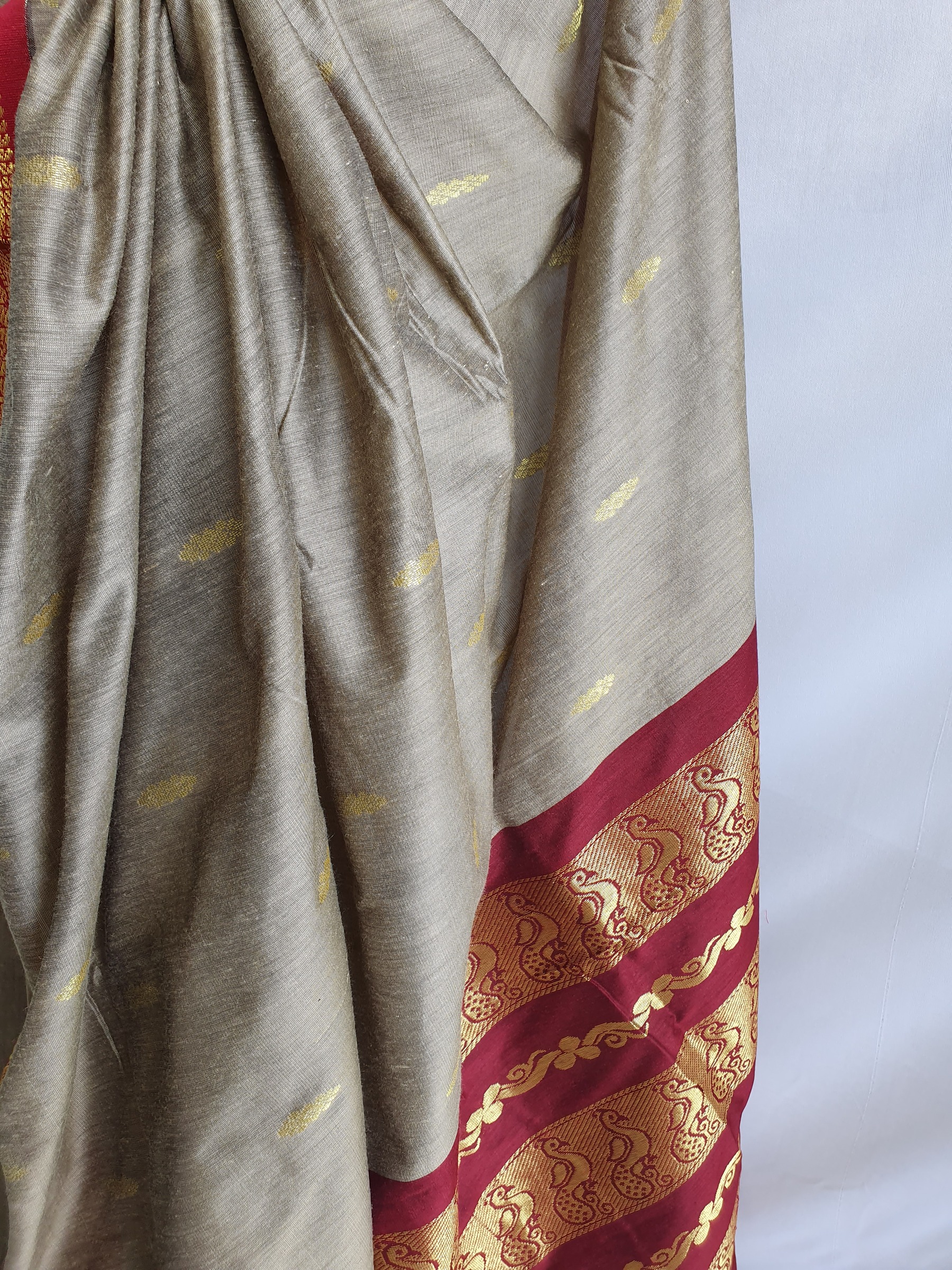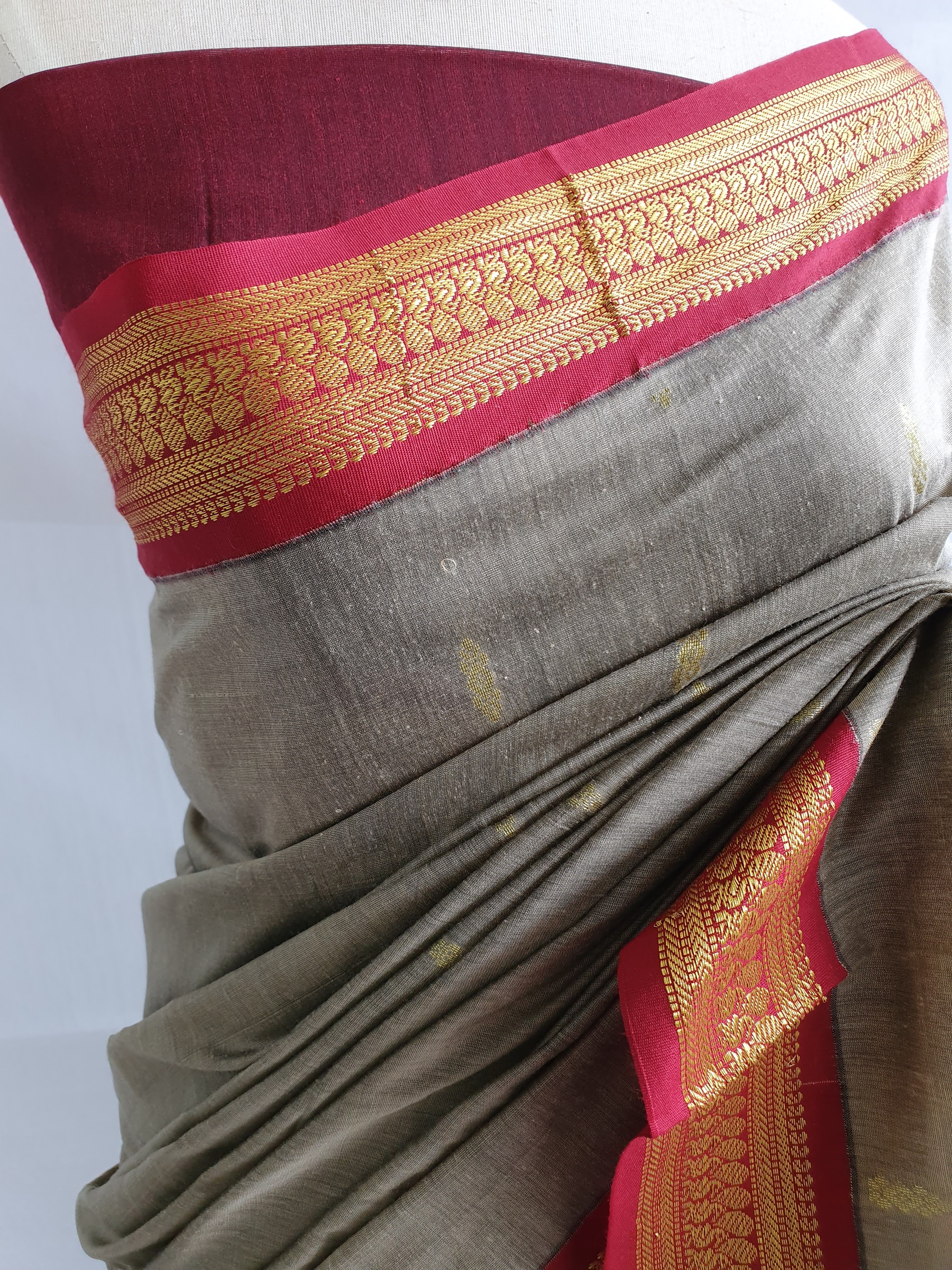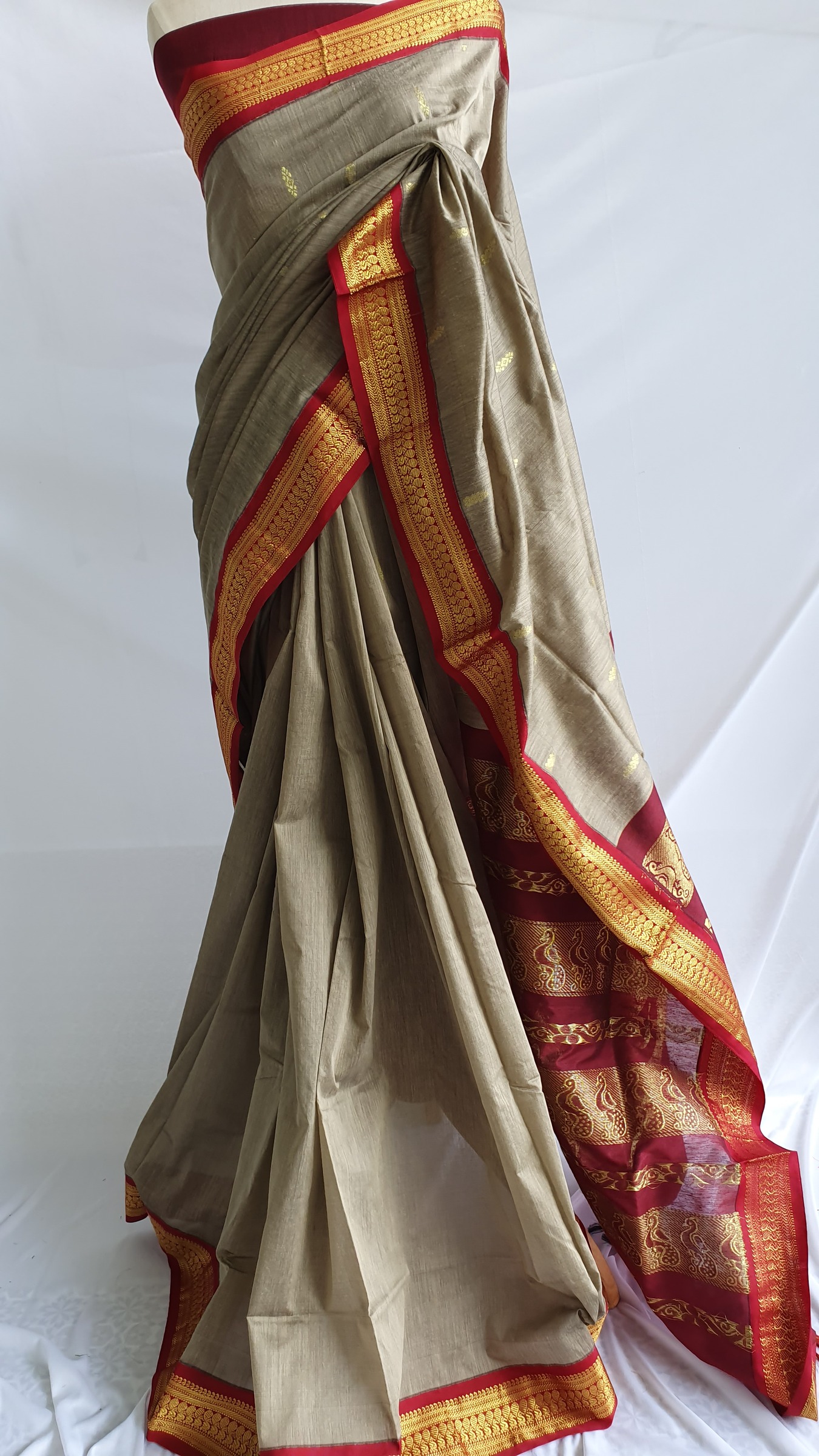 Traditional Kalyani Cotton Saree with buttas on body and contrast colour attached blouse, grand pallu and contrast colour zari border.