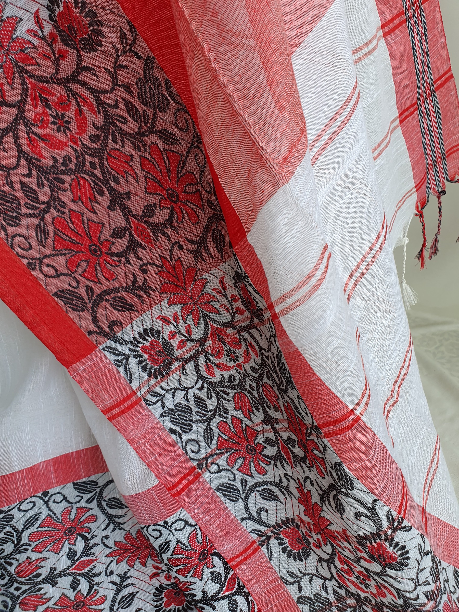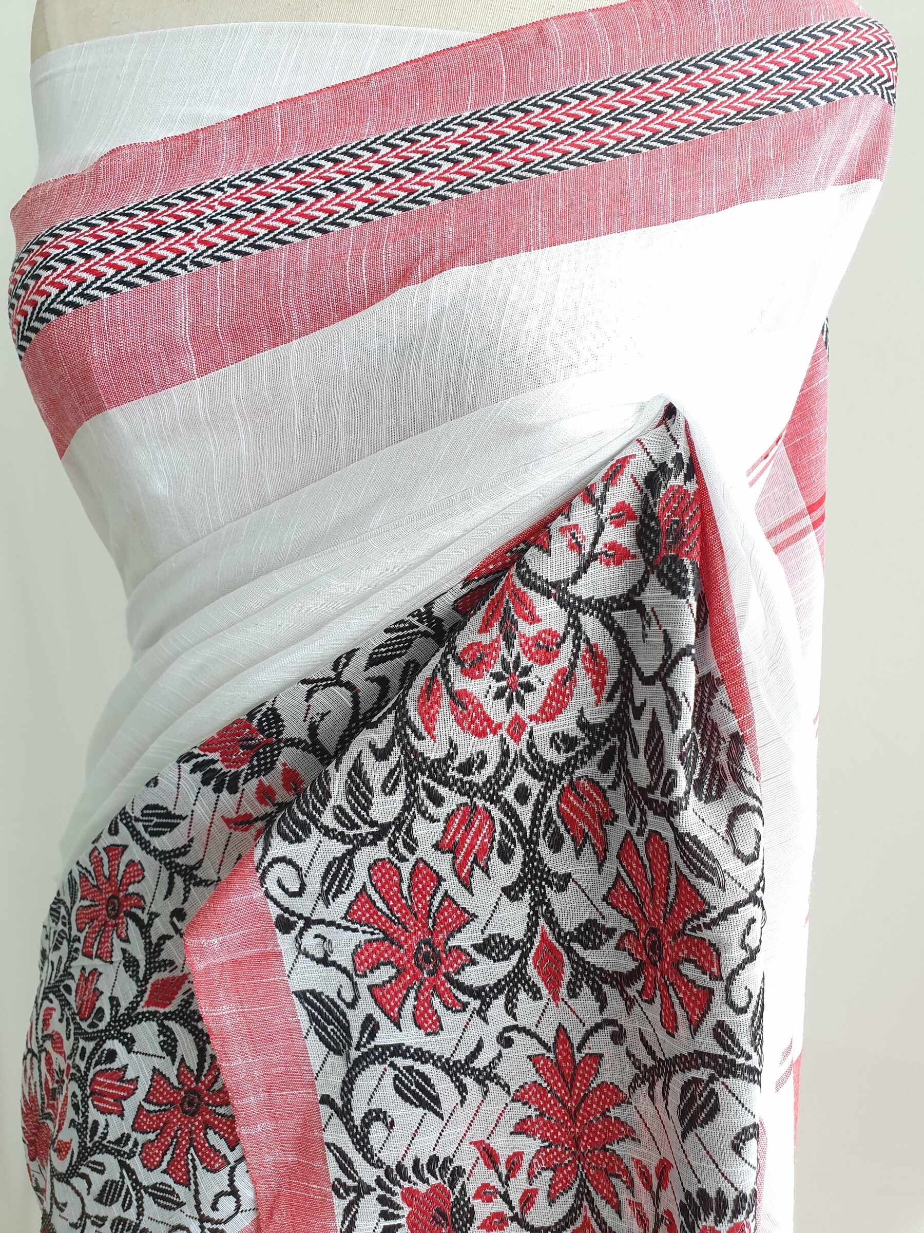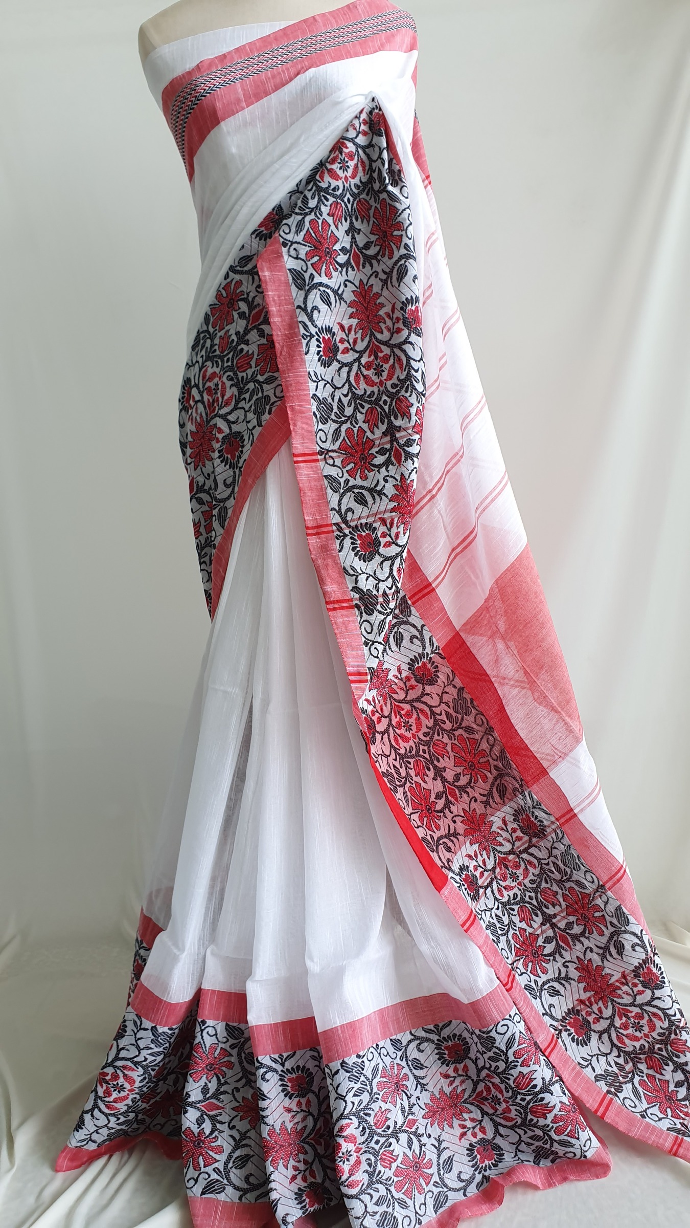 Cotton saree from Begumpur with grand thread woven floral design border and attached running colour blouse material.