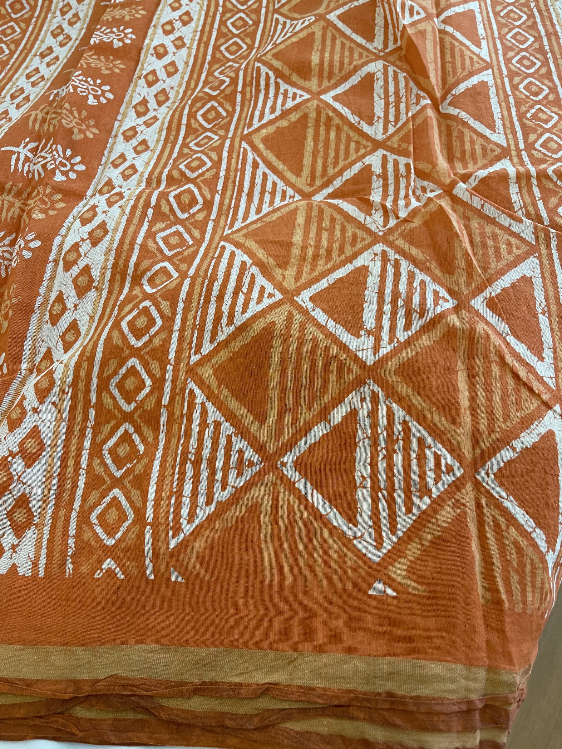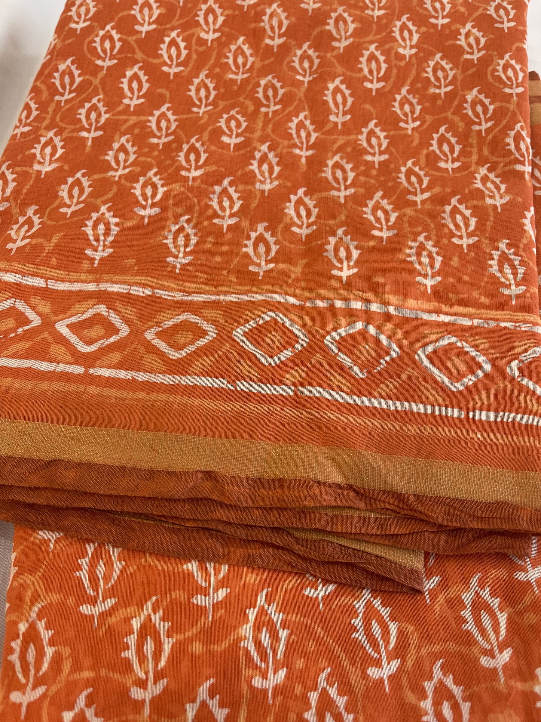 Lightweight block print cotton saree with thin gold border and comes with contrast design blouse material.