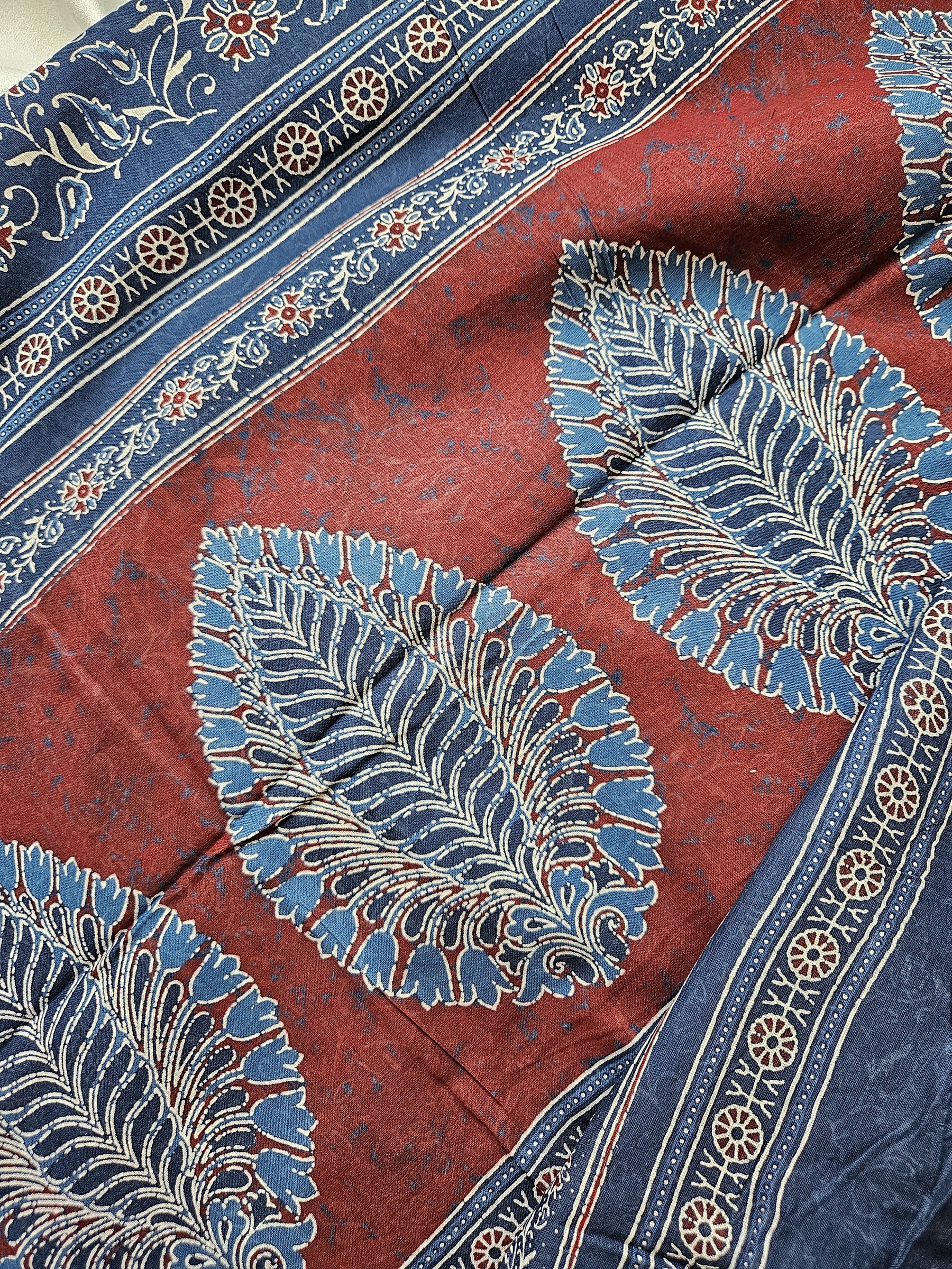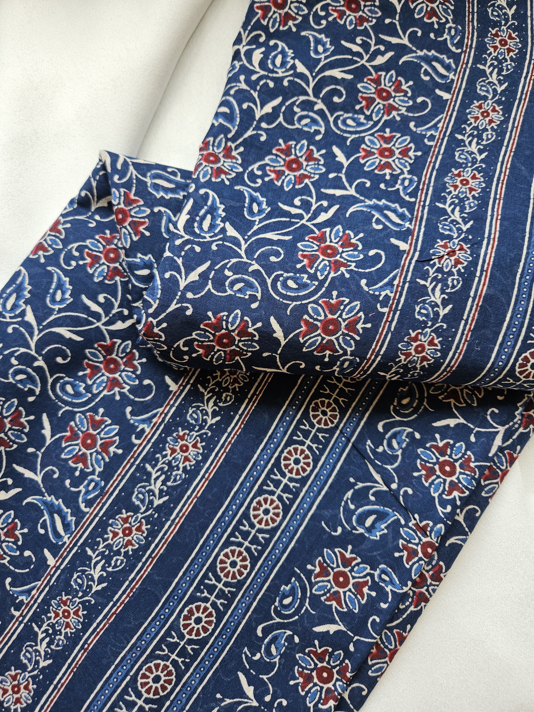 Lightweight block print Indigo cotton saree with thin gold border and comes with running plain colour blouse material.