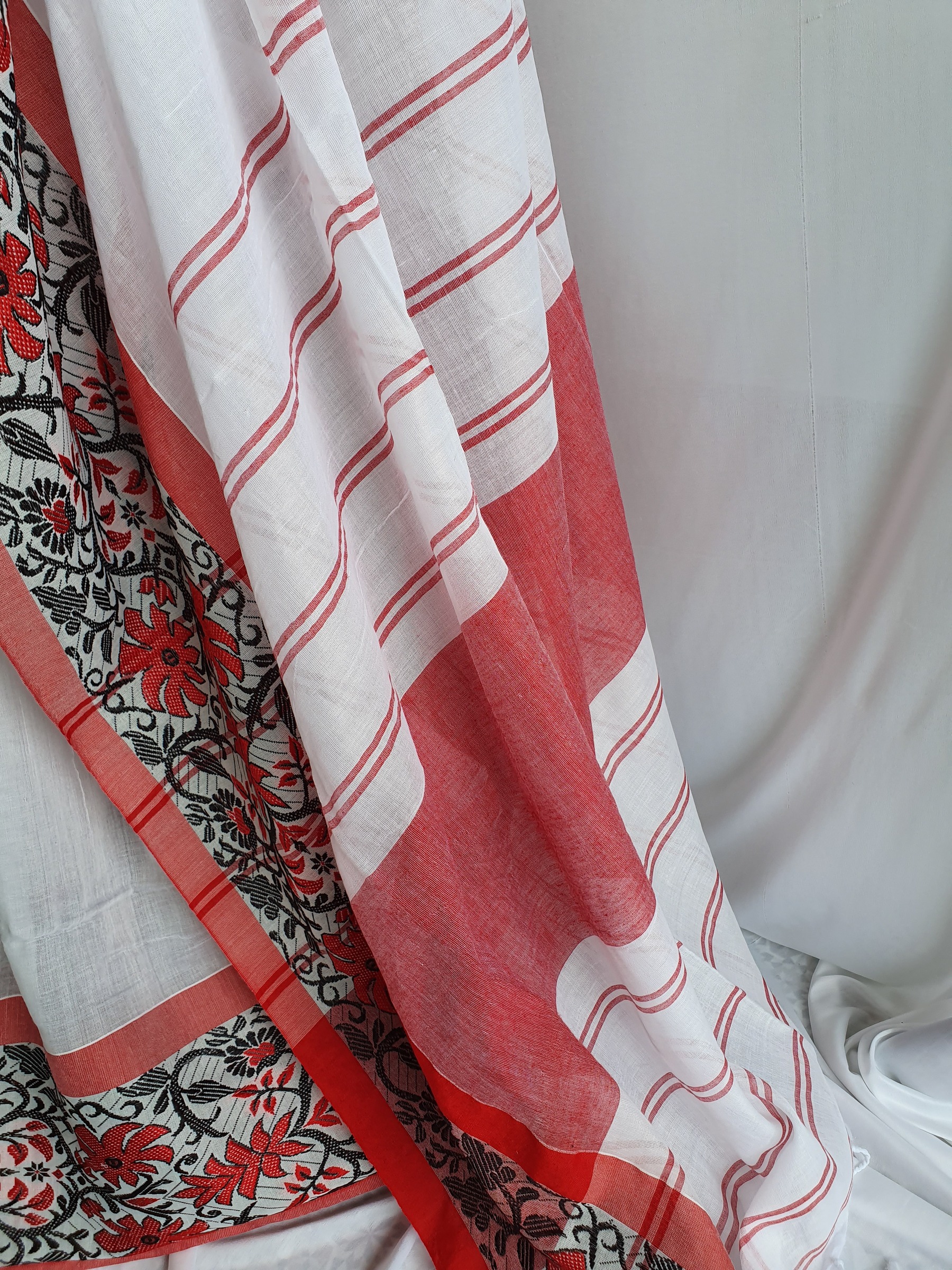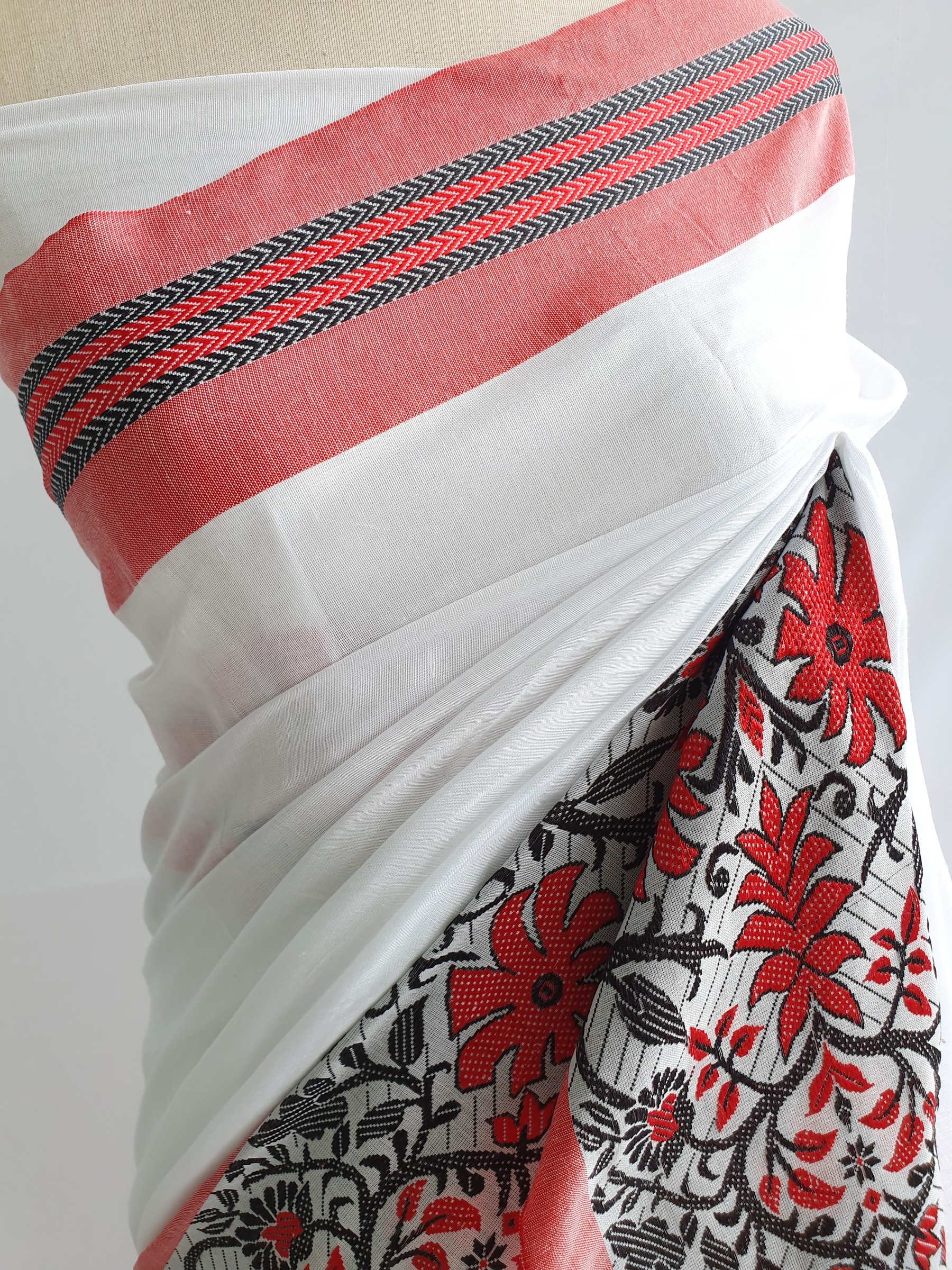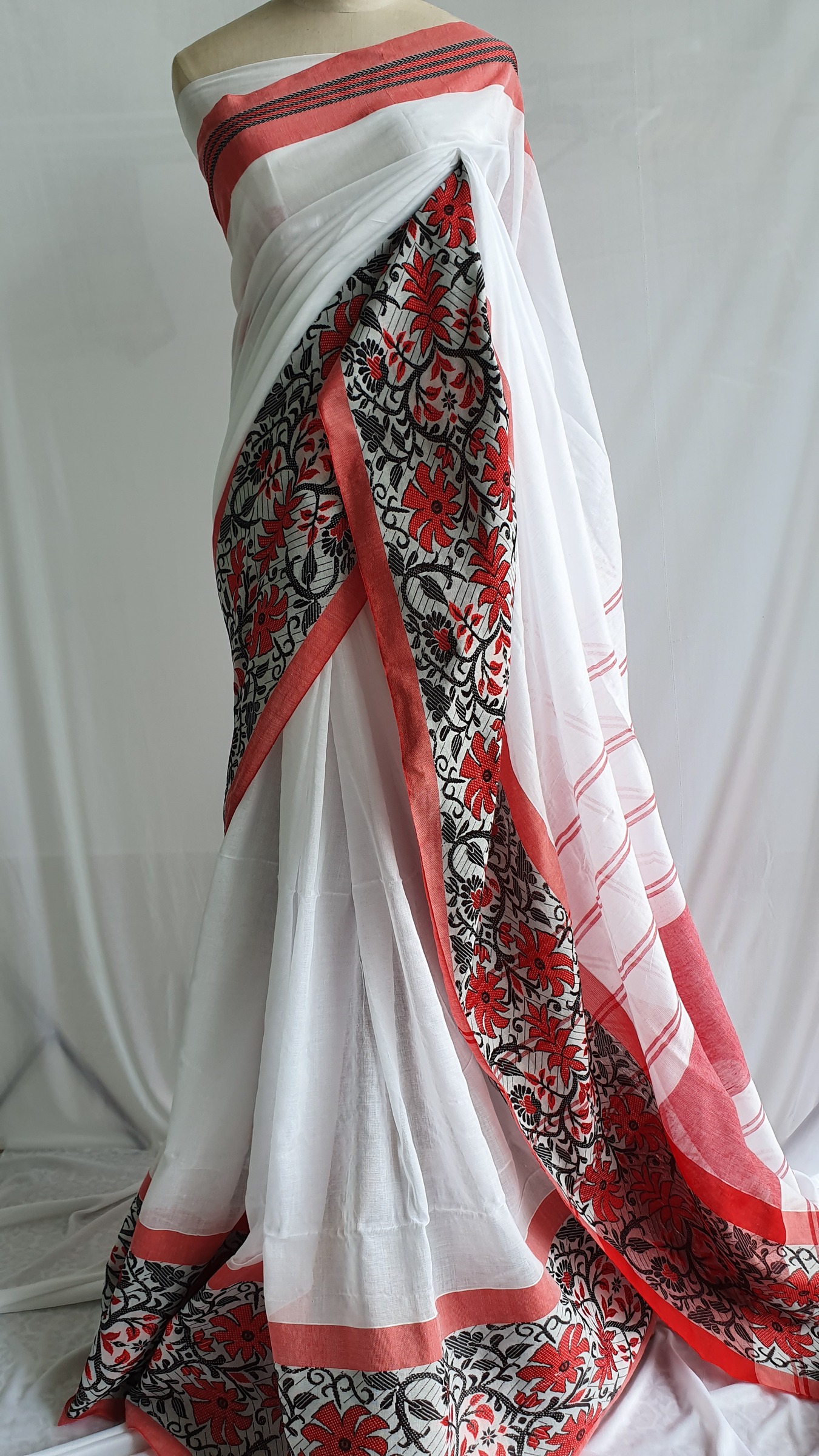 Soft cotton saree from Bengal with grand thread woven floral design border and attached running colour blouse material.