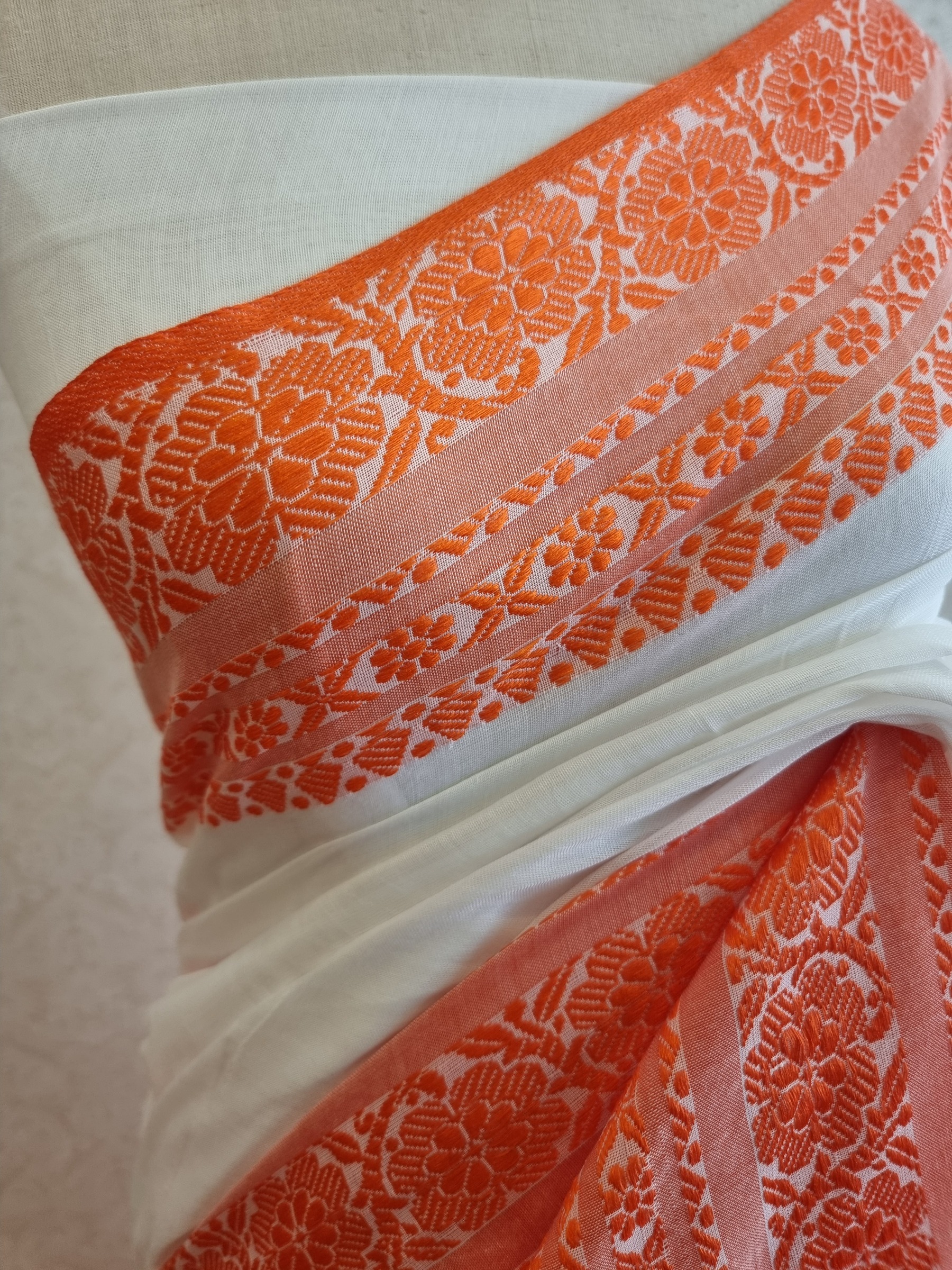 Soft cotton saree from Bengal with grand thread woven floral design border and attached running colour blouse material.
