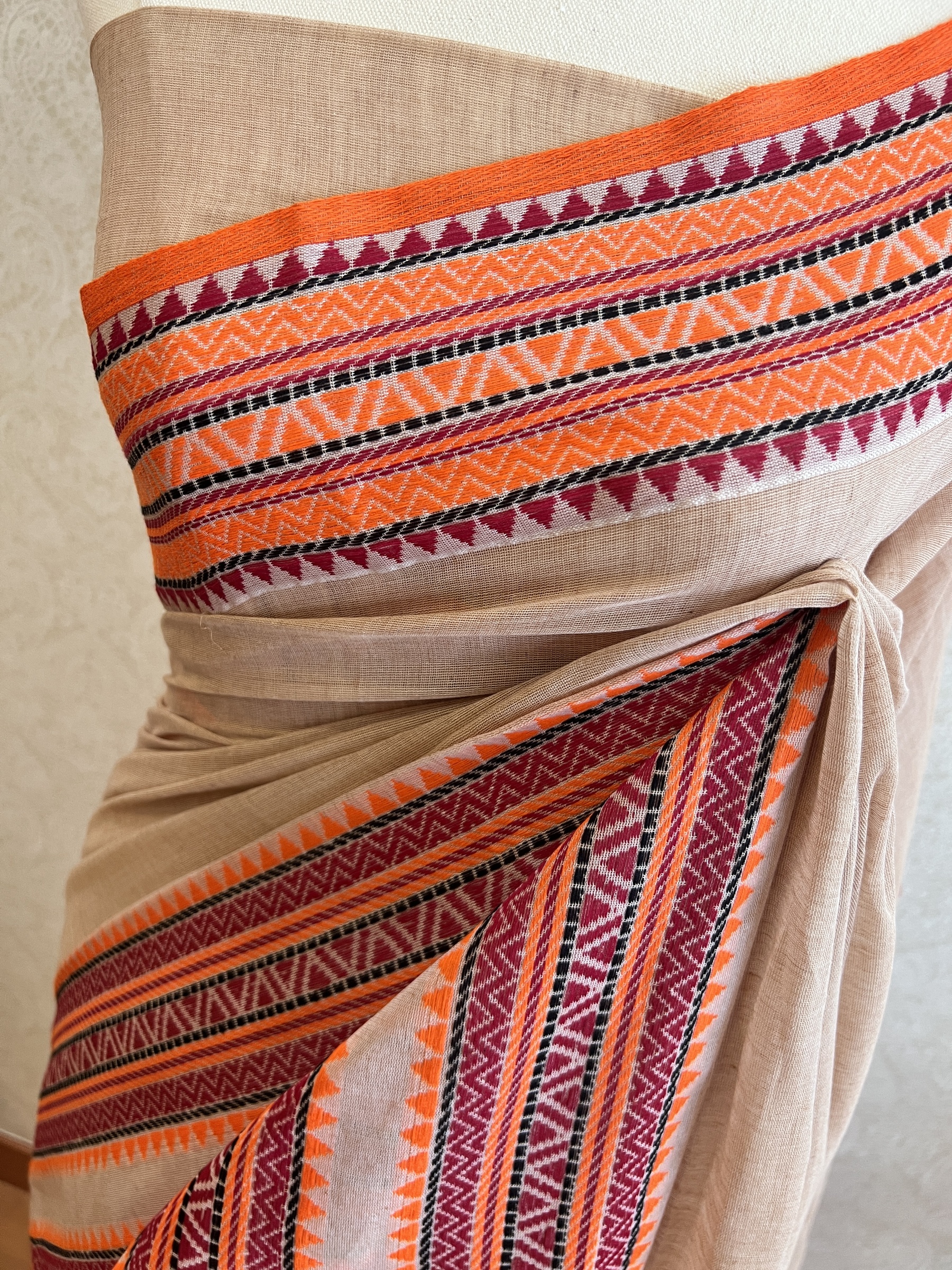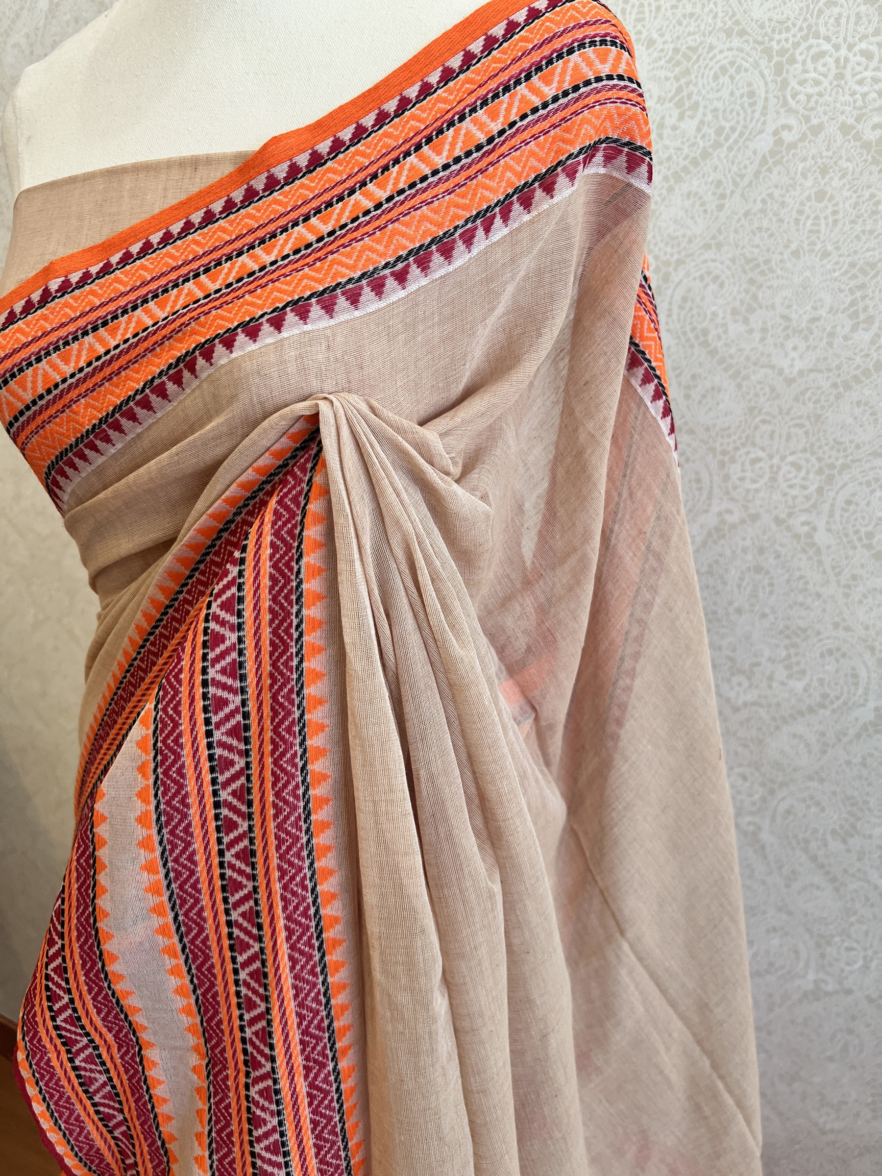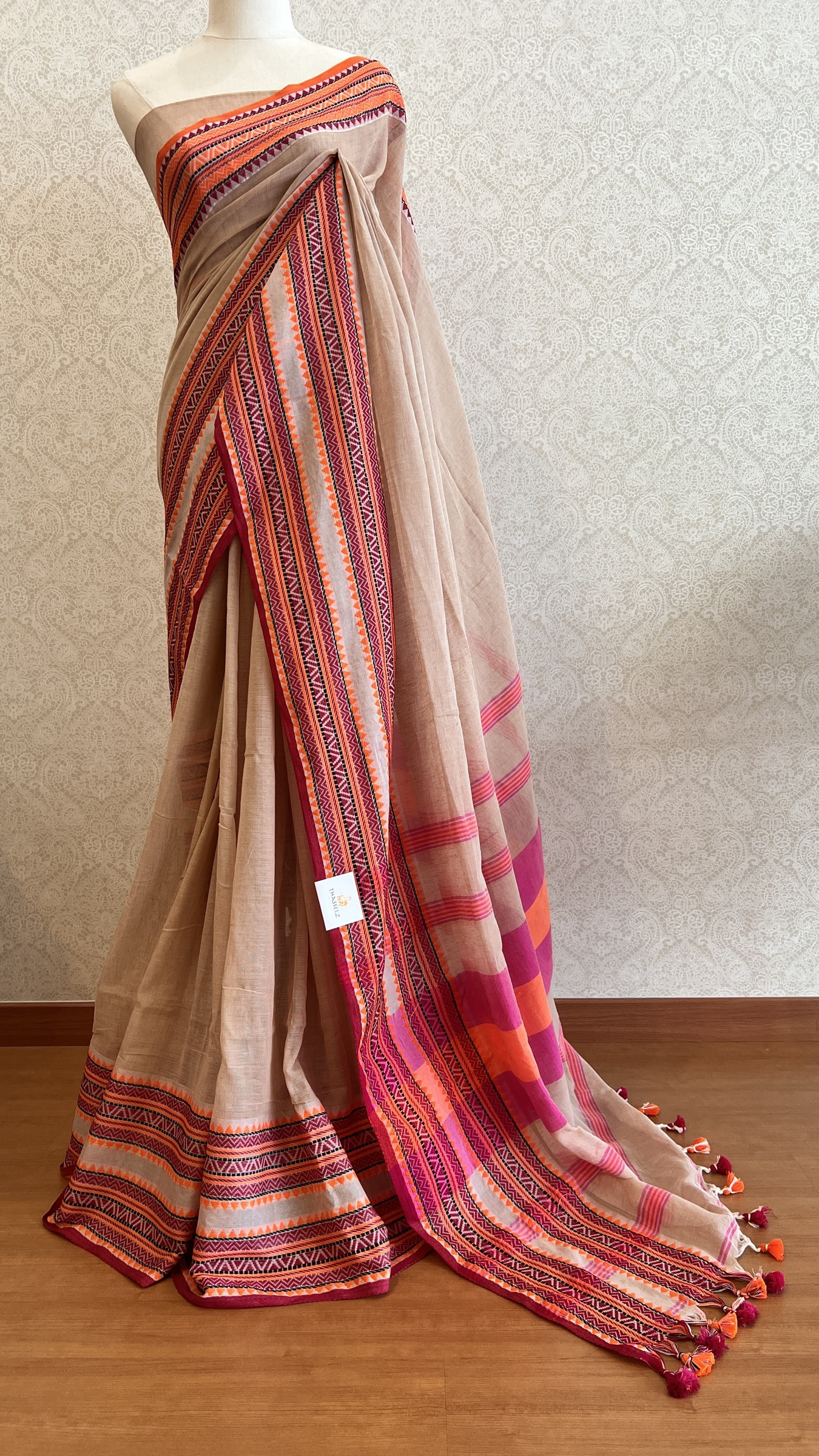 Soft cotton saree from Bengal with grand thread woven floral design border and attached running colour blouse material.