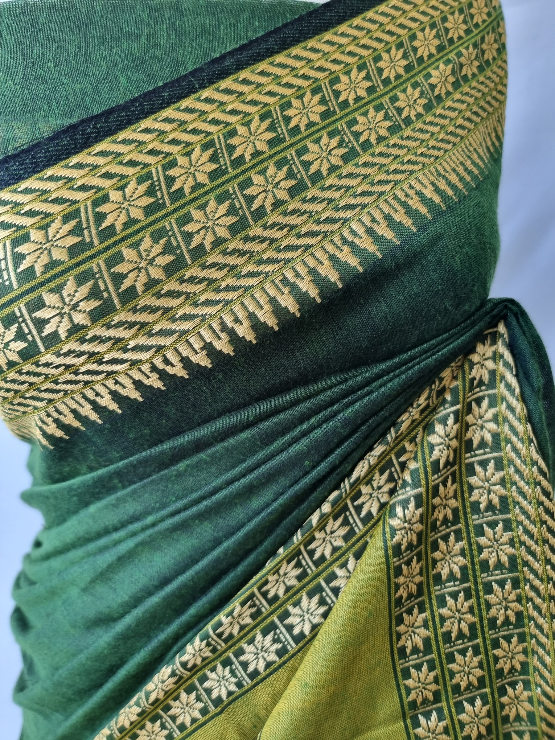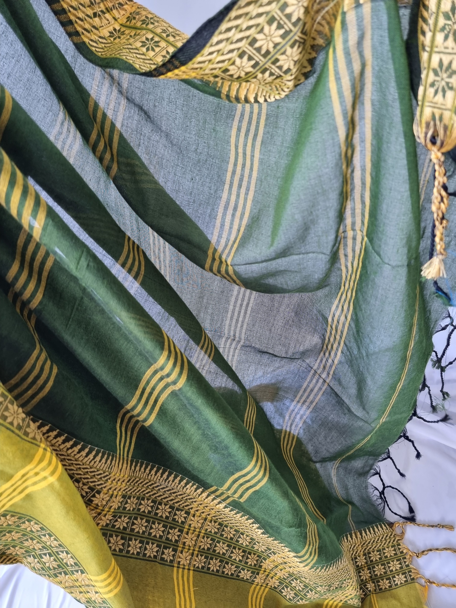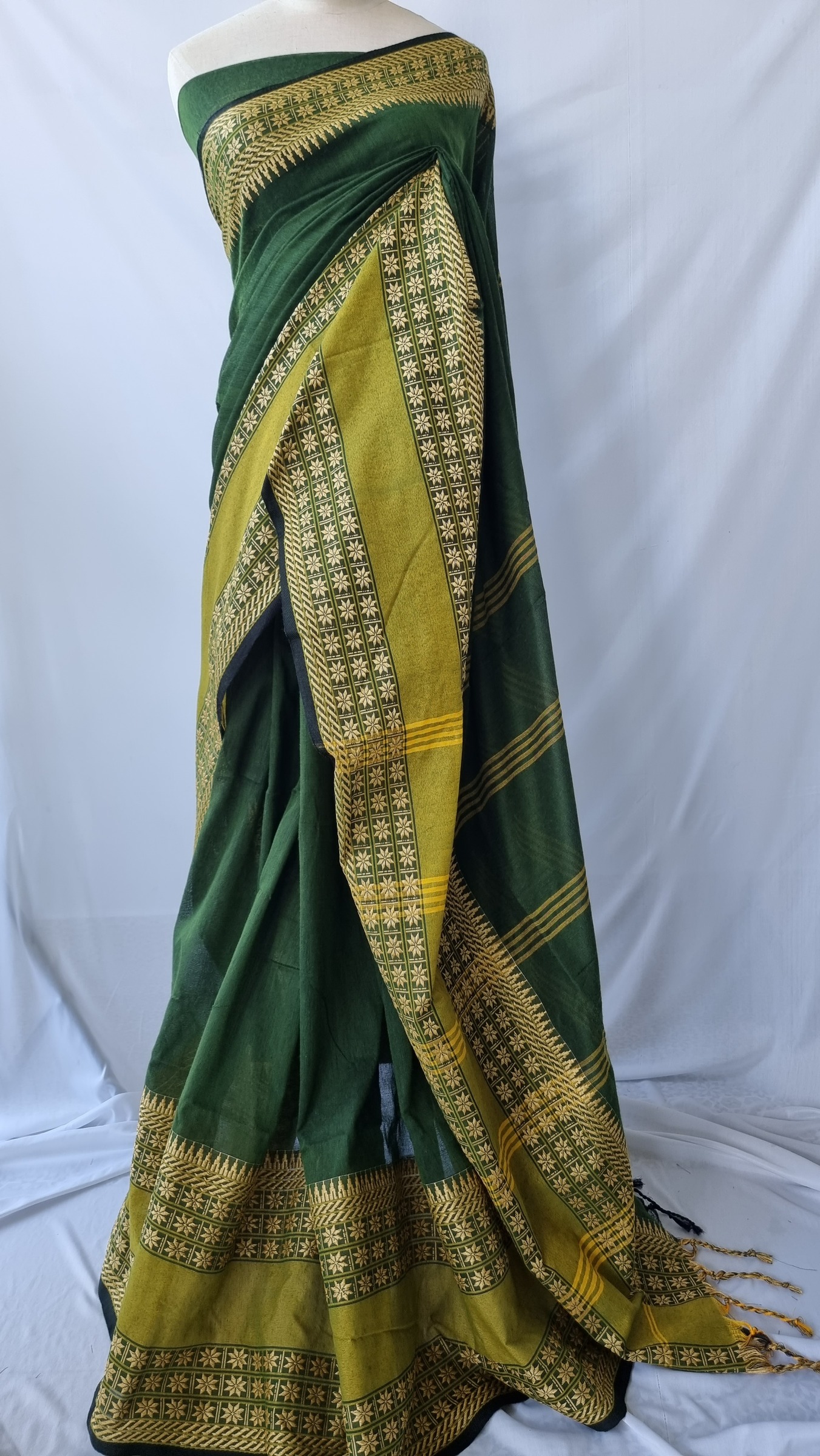 Soft cotton saree from Bengal with thread woven border and attached running colour blouse material.