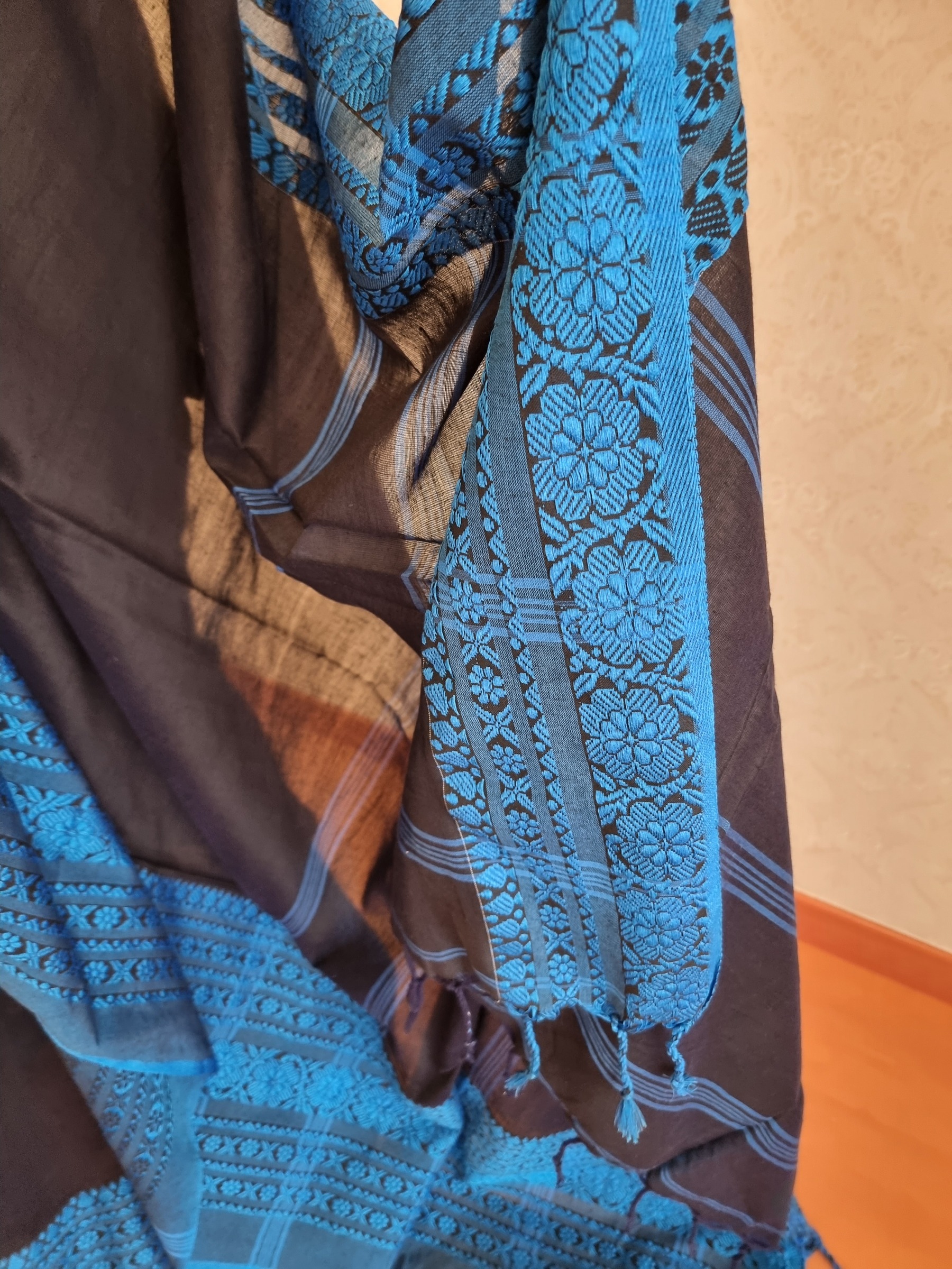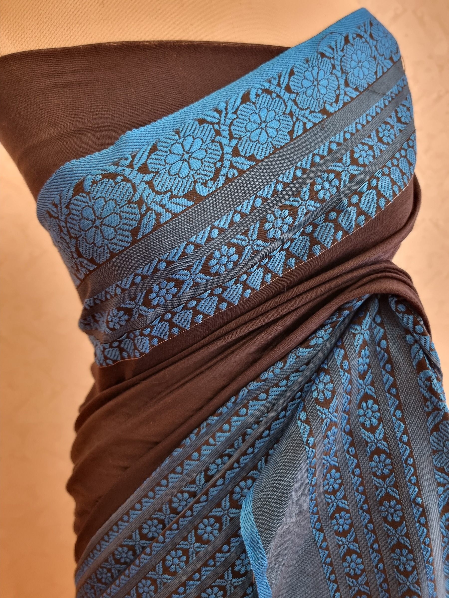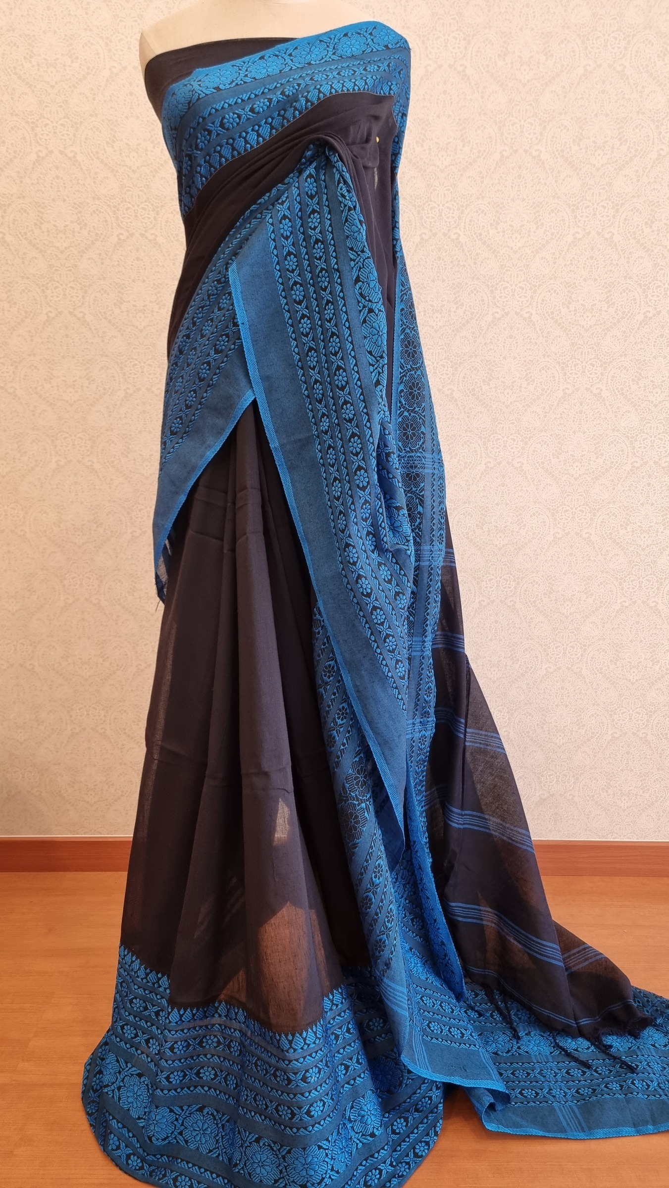 Dark navy blue Begumpuri cotton saree with broad and grand thread woven border and attached running colour blouse material.