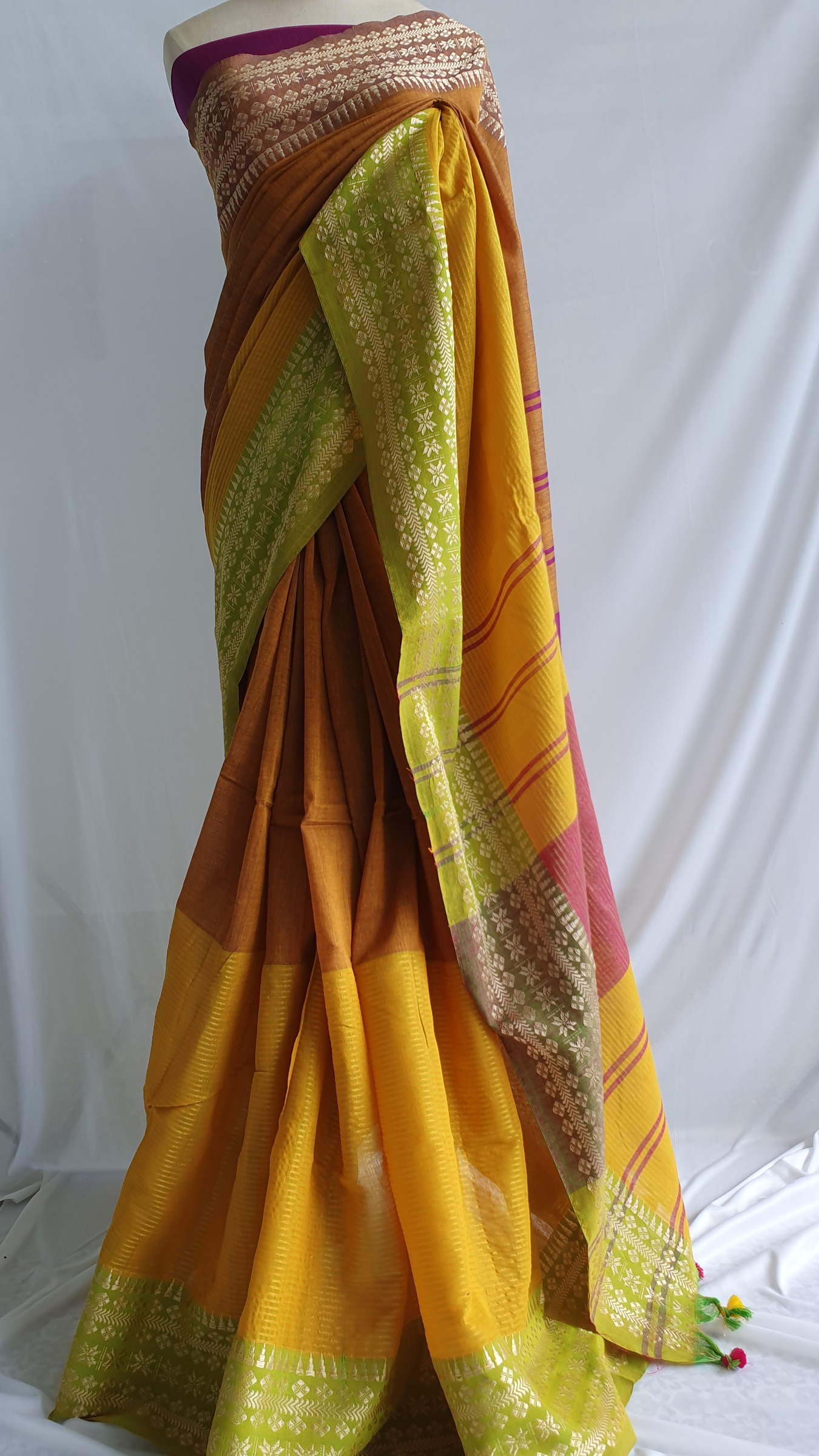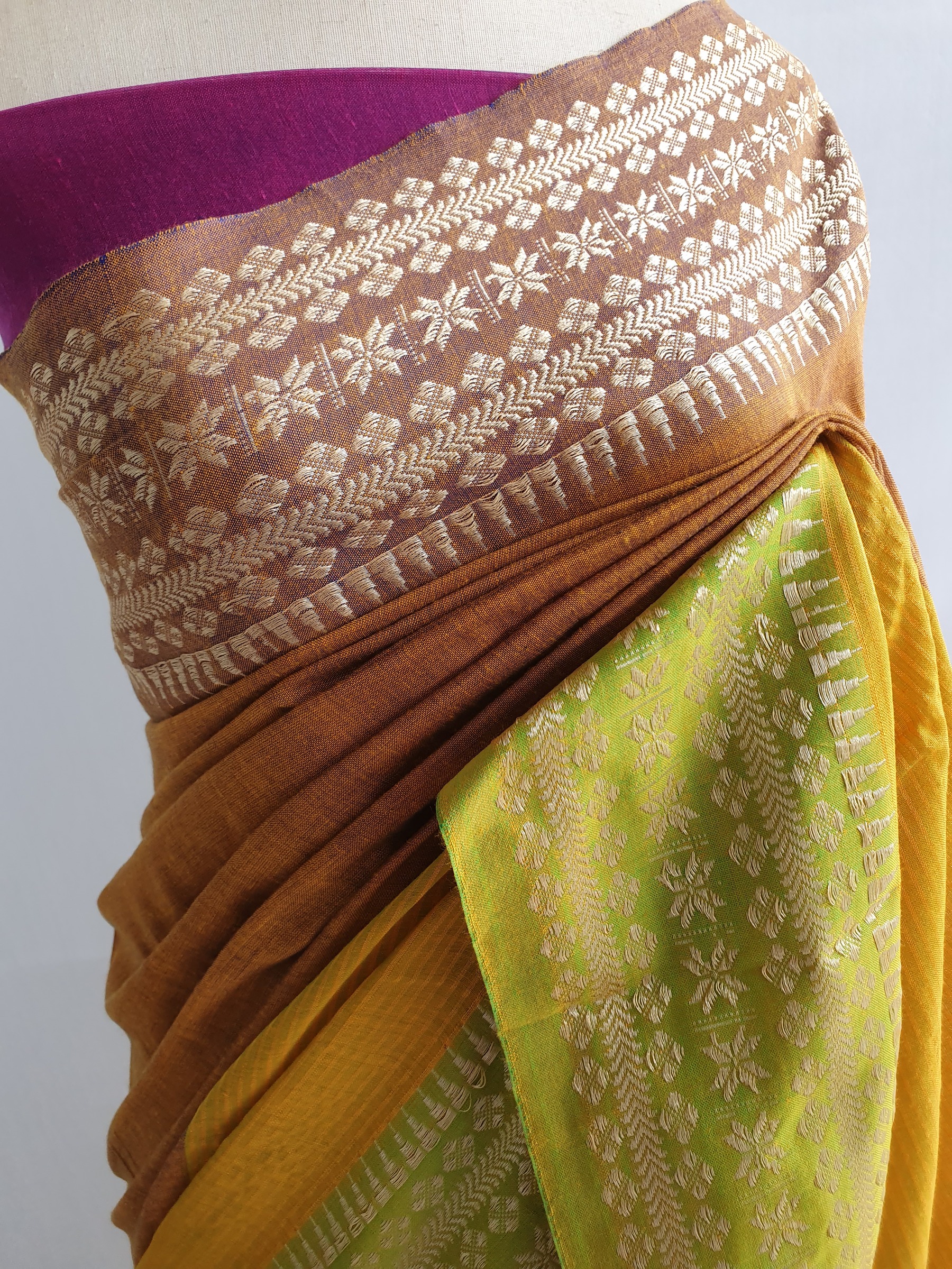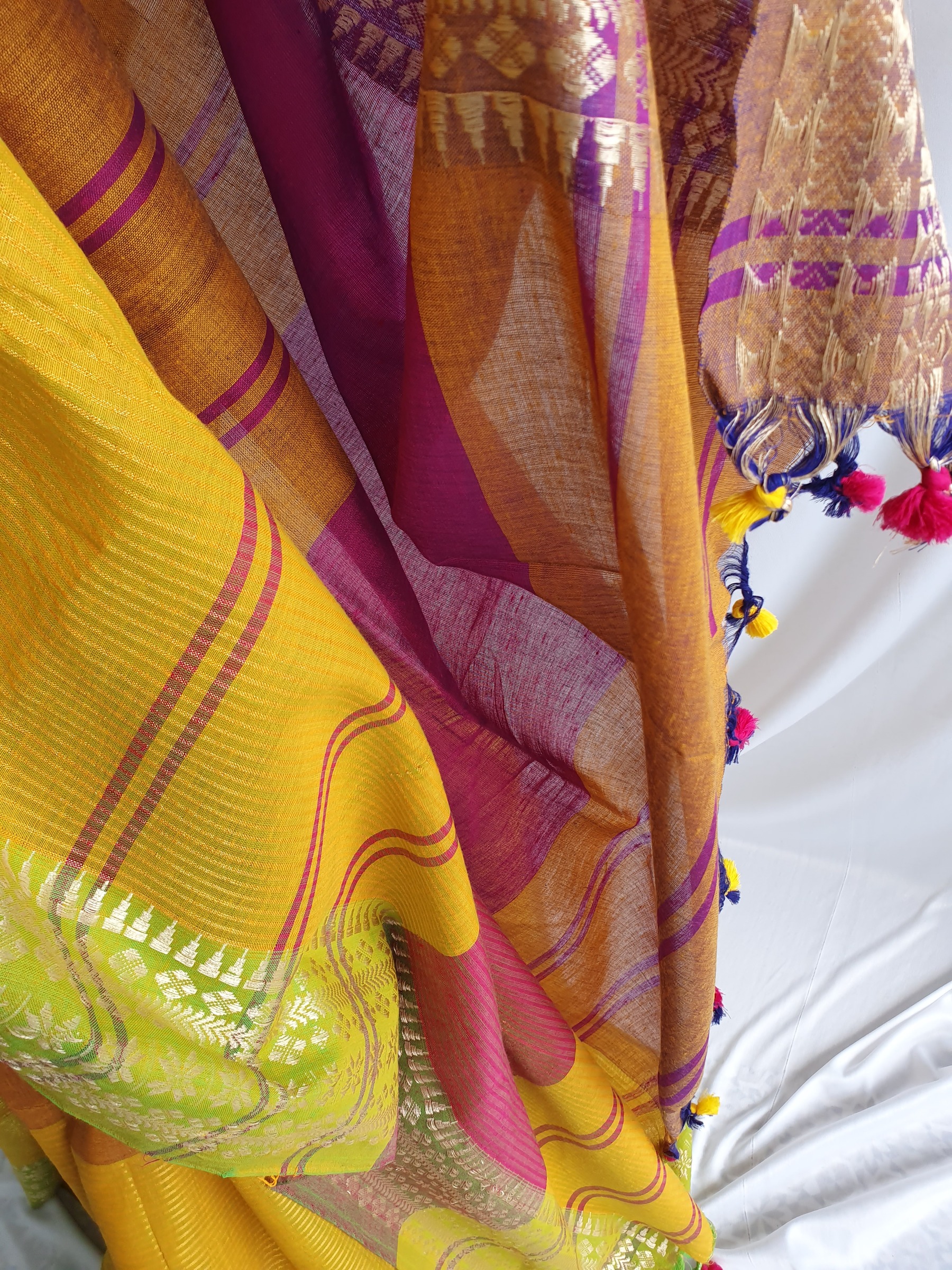 Dual shade soft cotton saree from Begumpur with double colour thread woven border,attached contrast colour blouse material and pompoms on pallu.