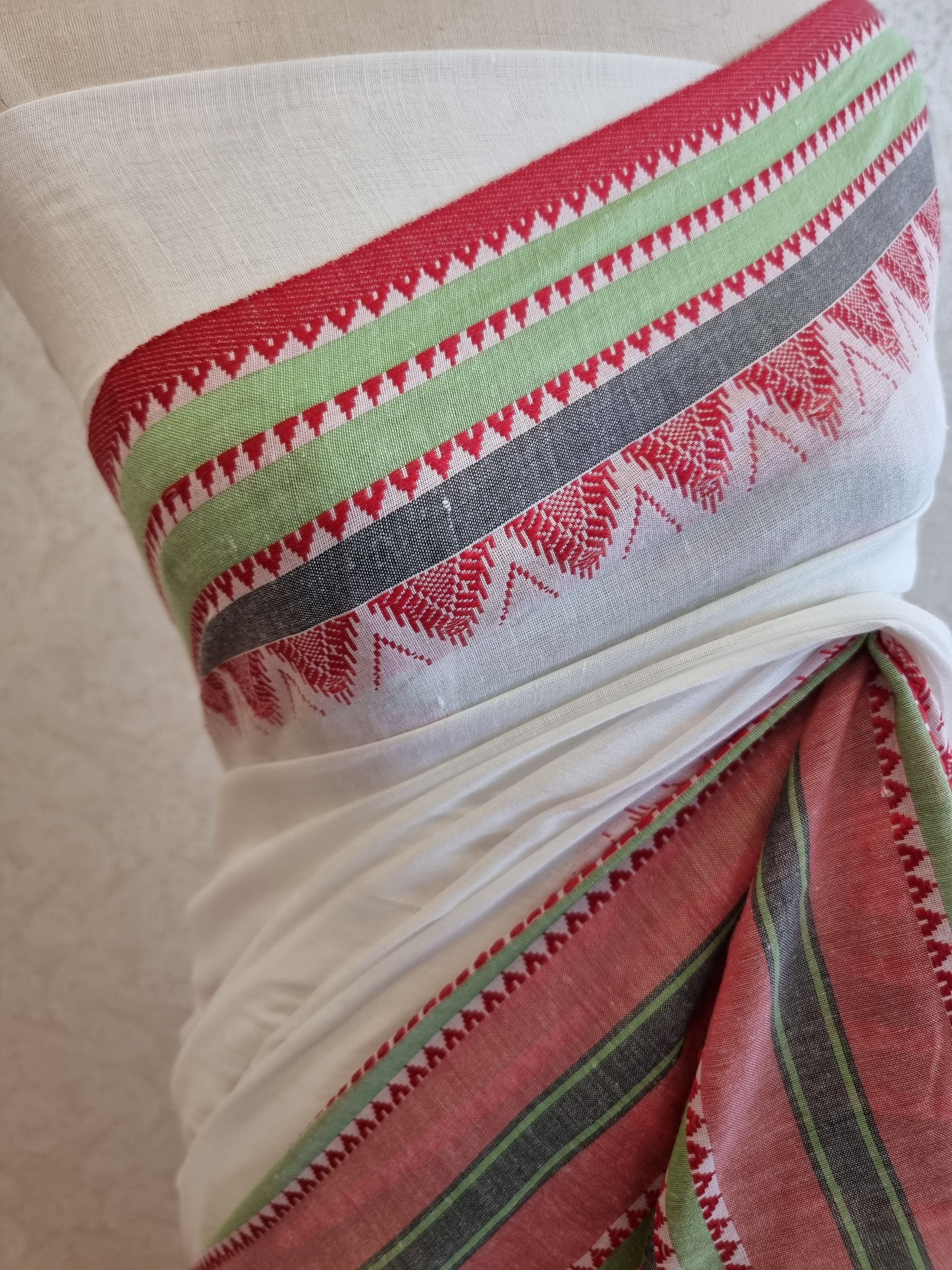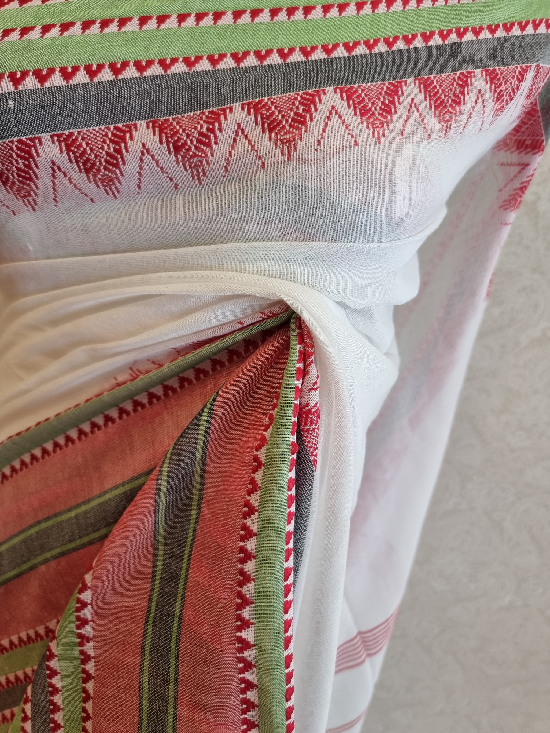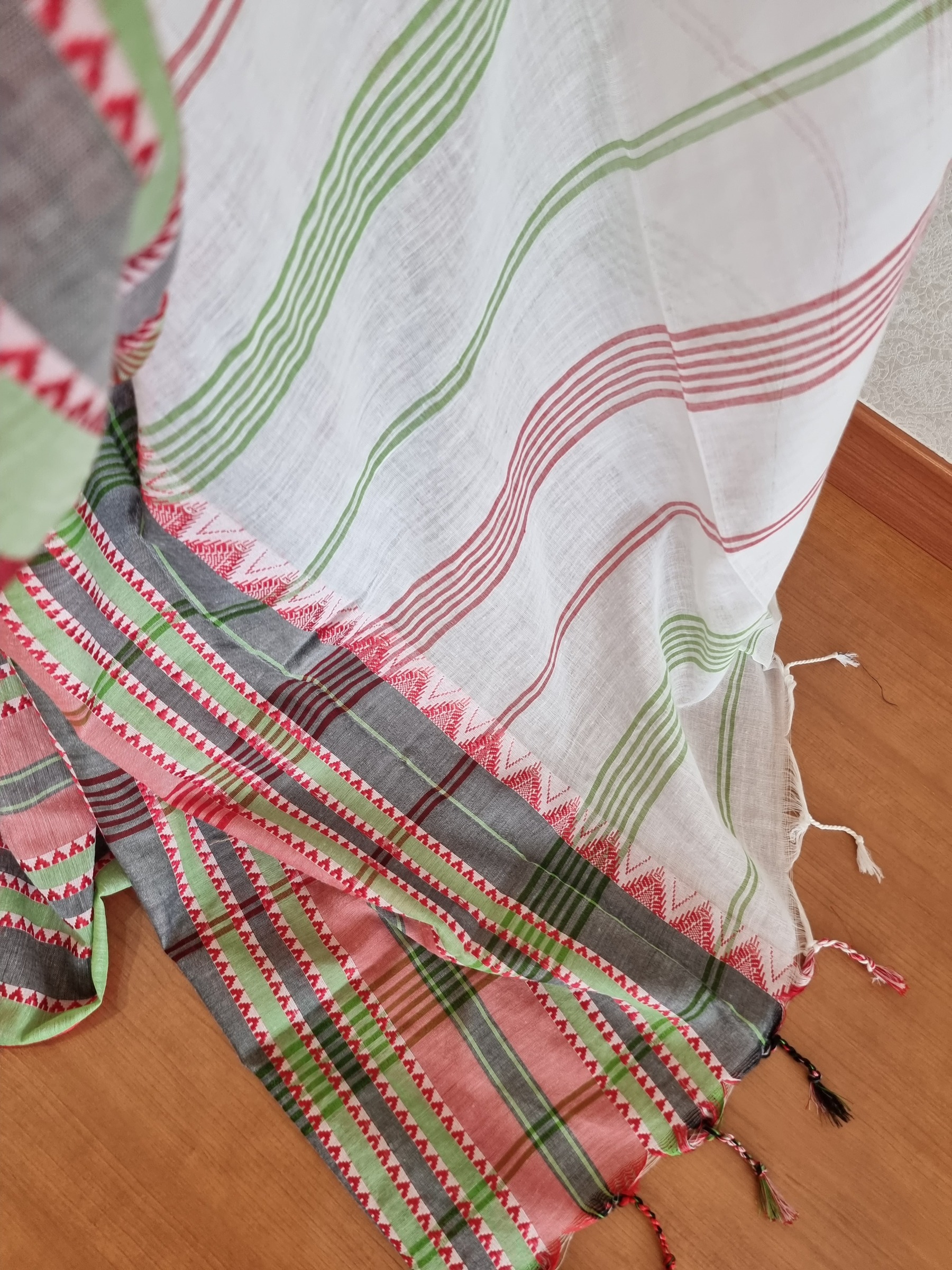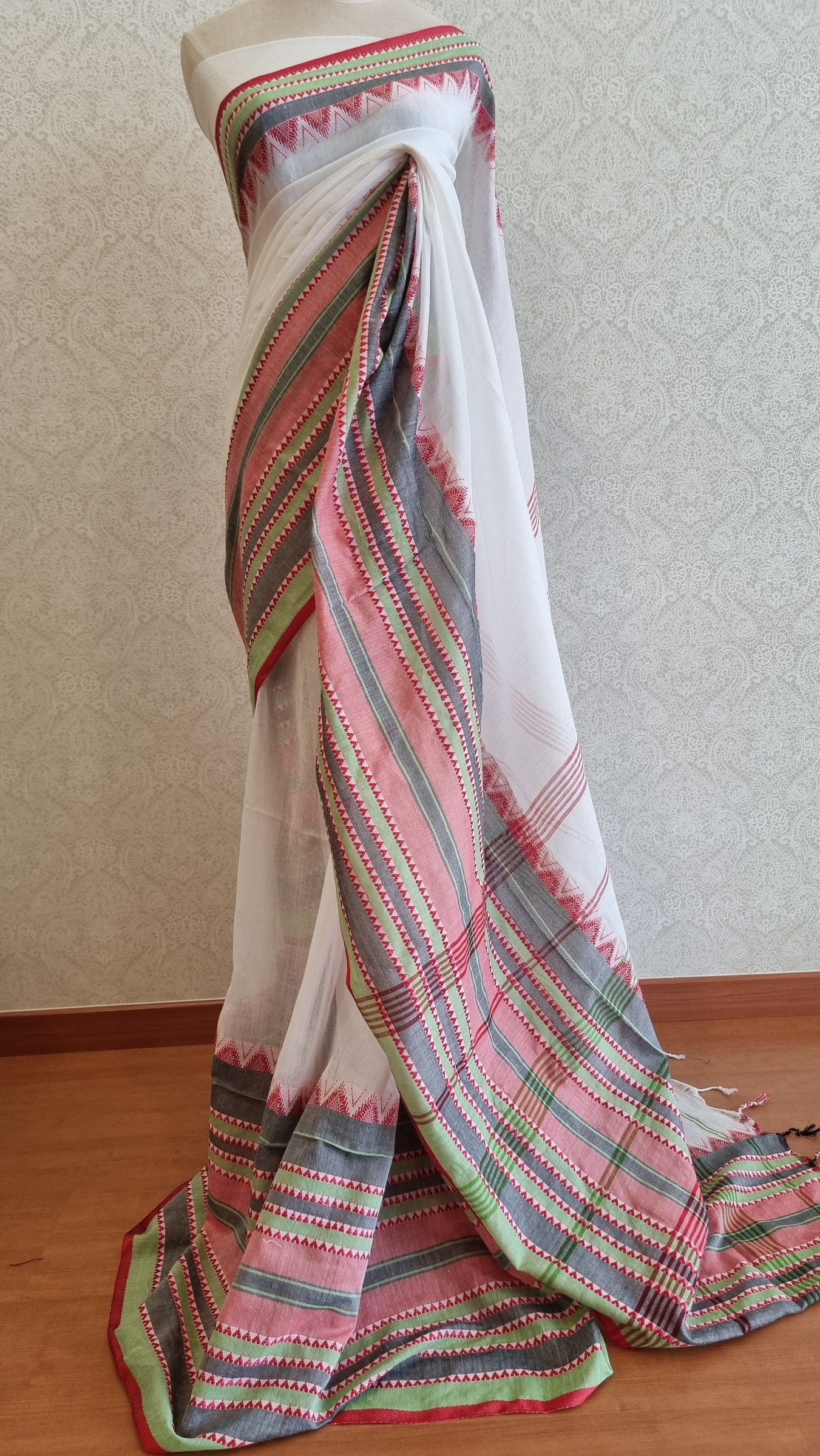 Begumpuri cotton saree with grand thread woven border and attached running colour blouse material.