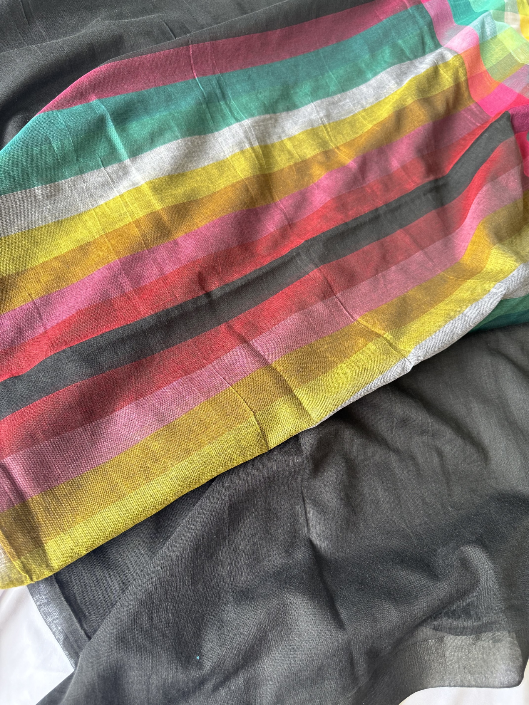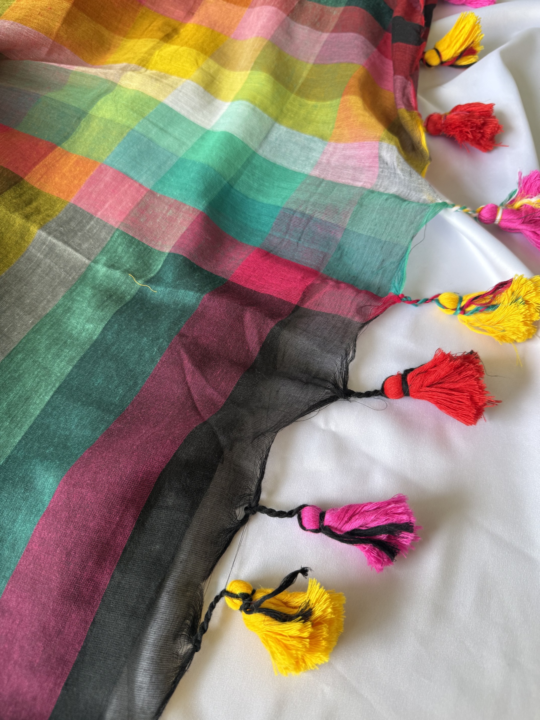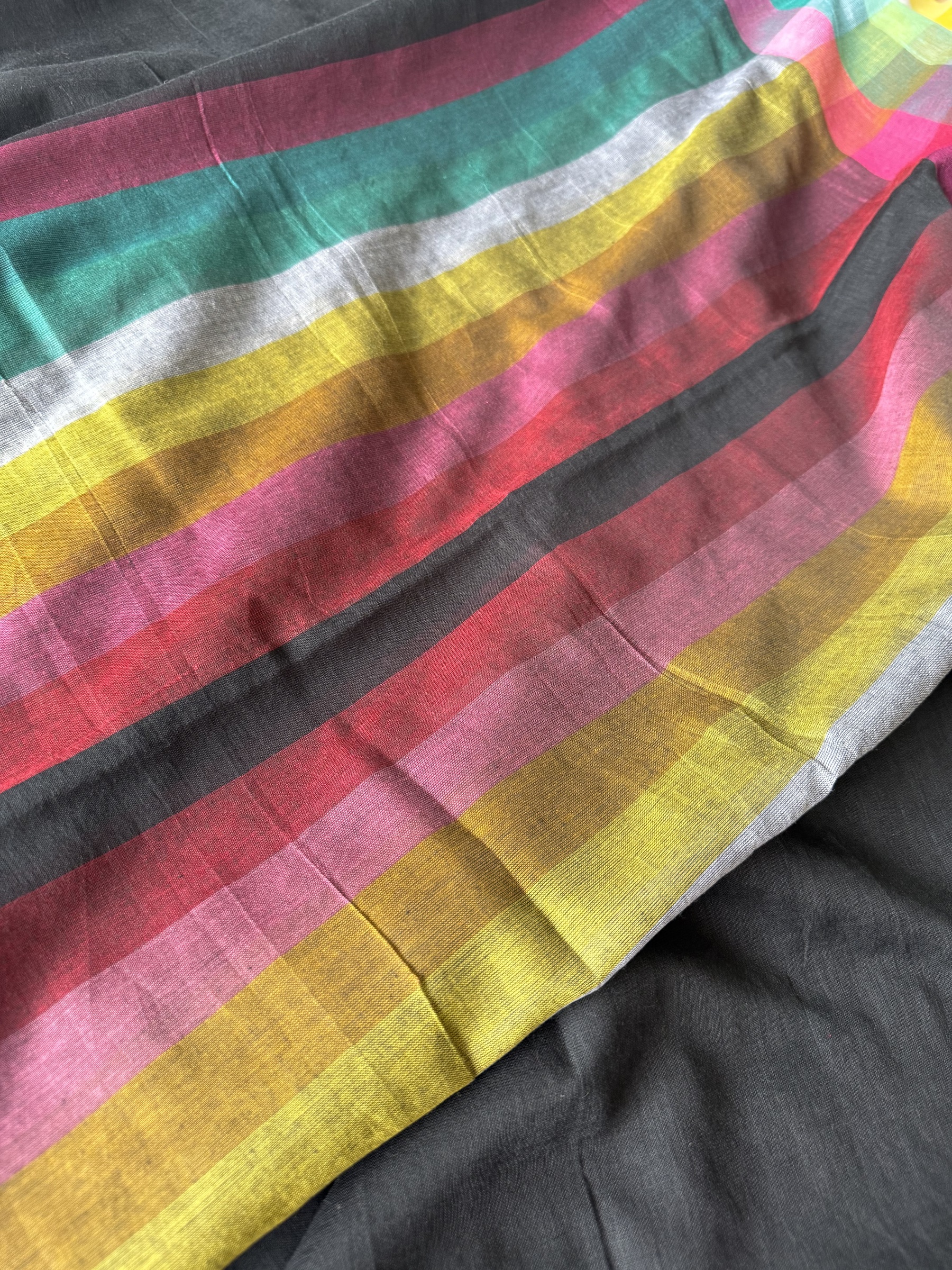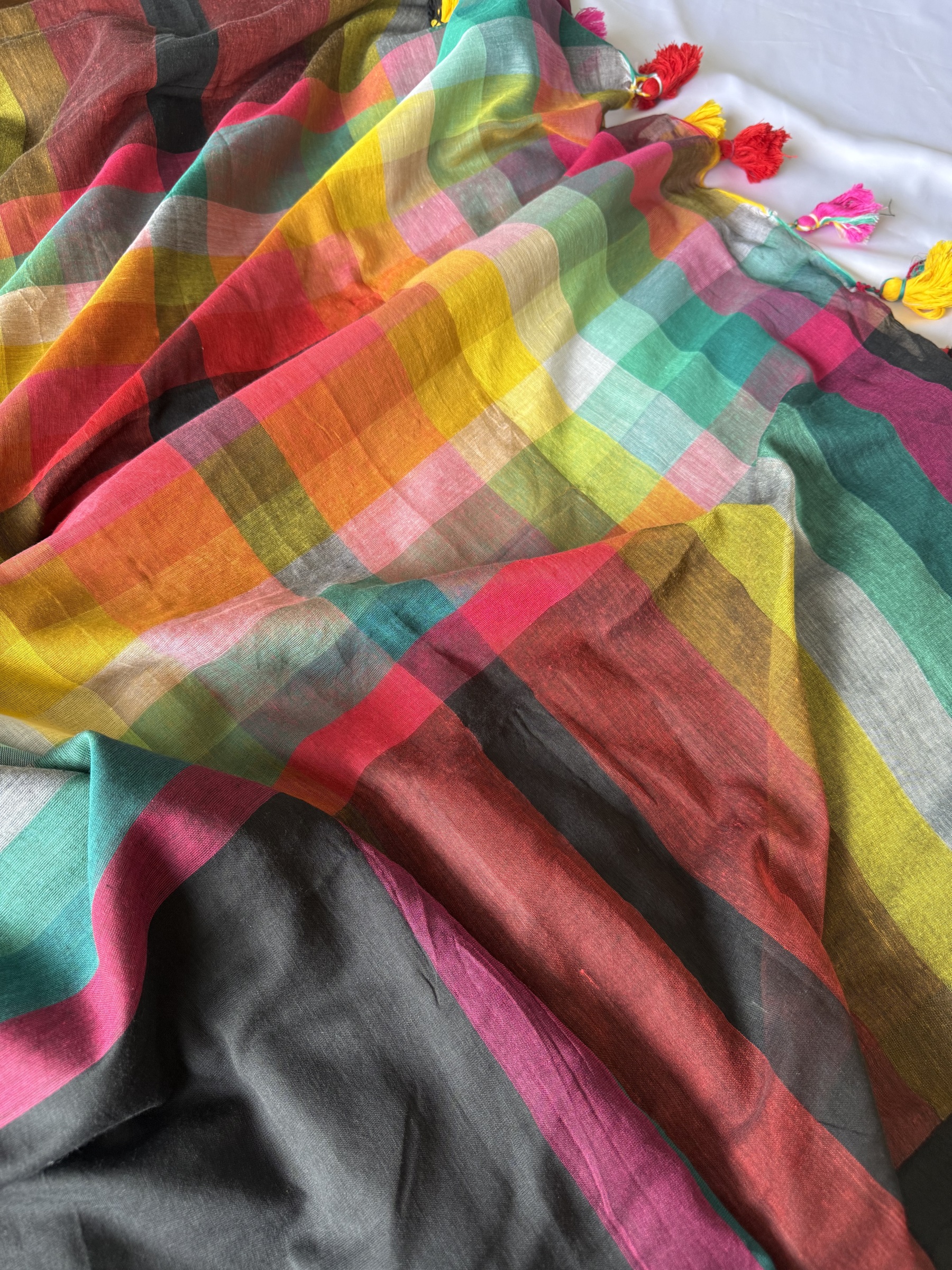 Soft and lightweight pure Mulmul cotton saree with multicolour horizontal stripes design on body and checks design on pallu and comes with colourful pompoms on pallu.