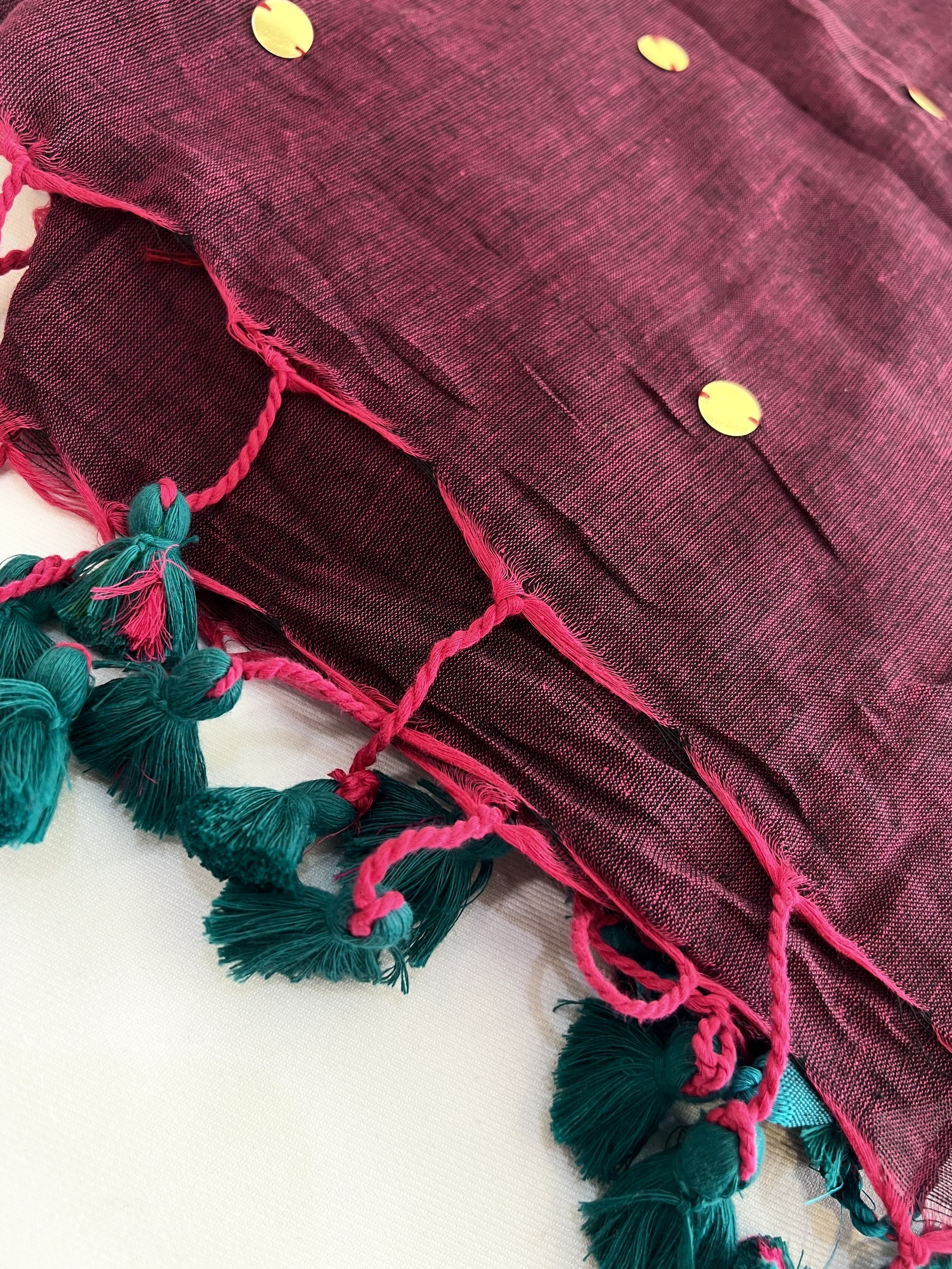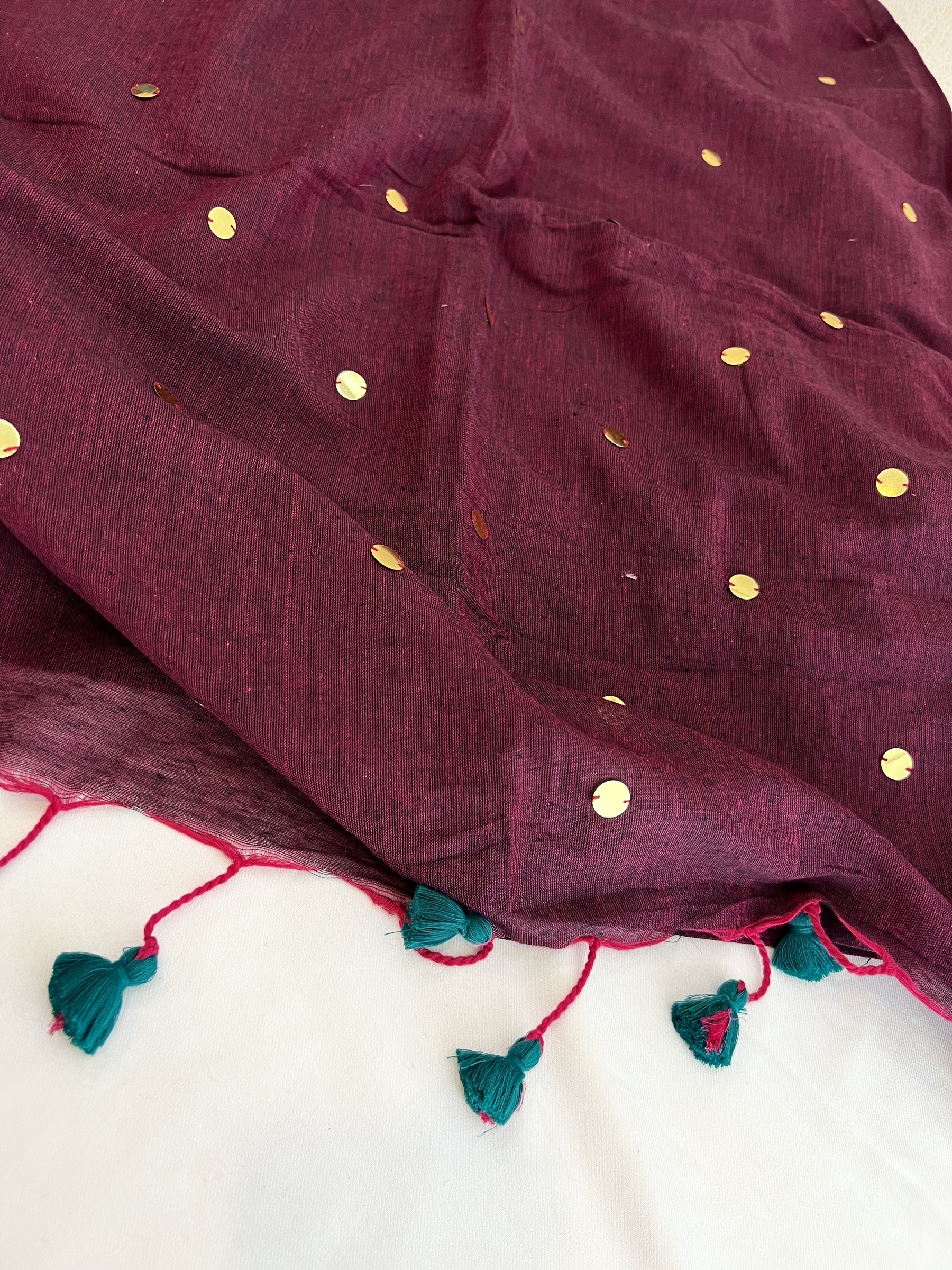 Mulmul cotton saree with sequins on body and comes with running colour blouse material & contrast colour pompoms.