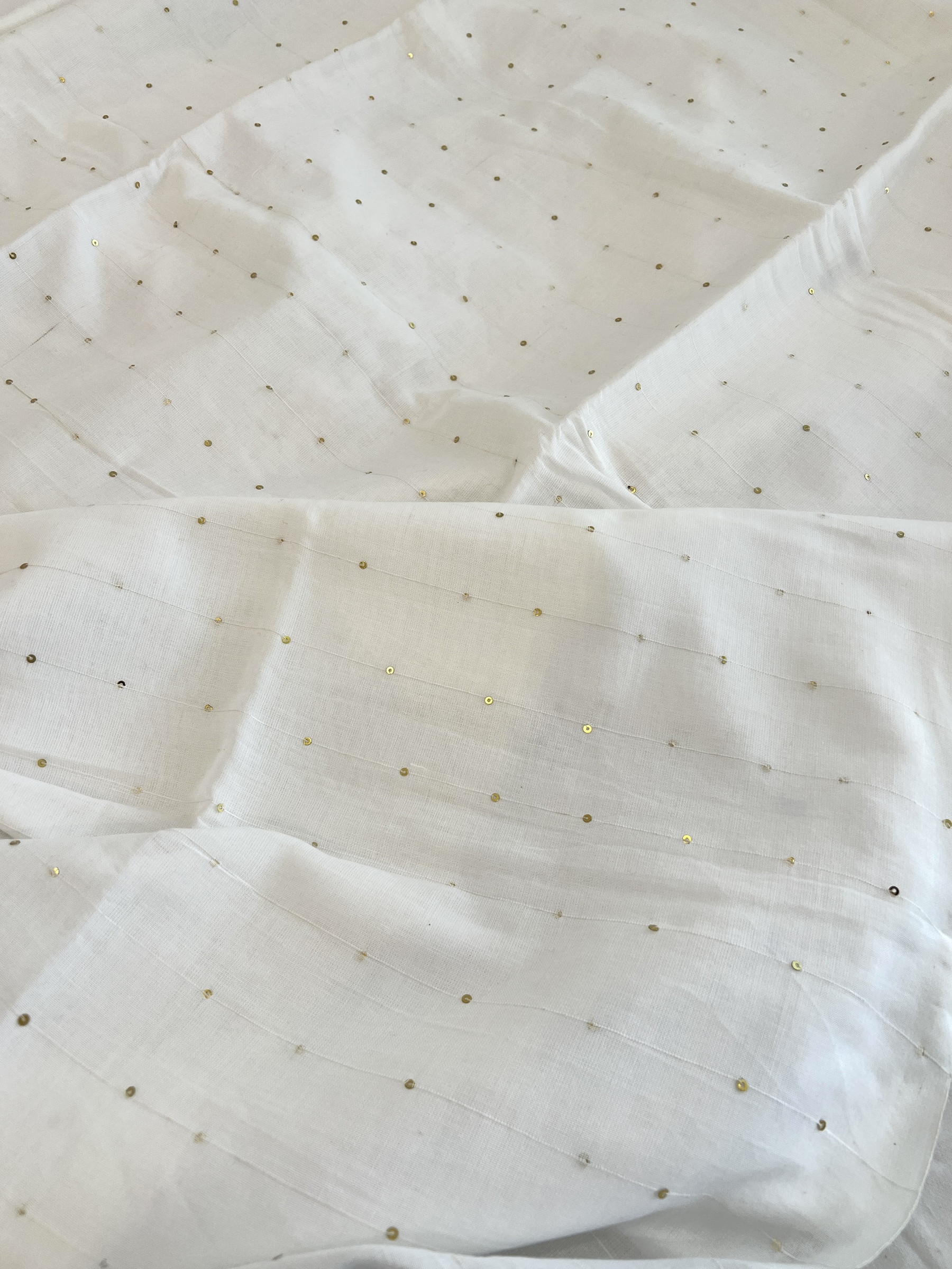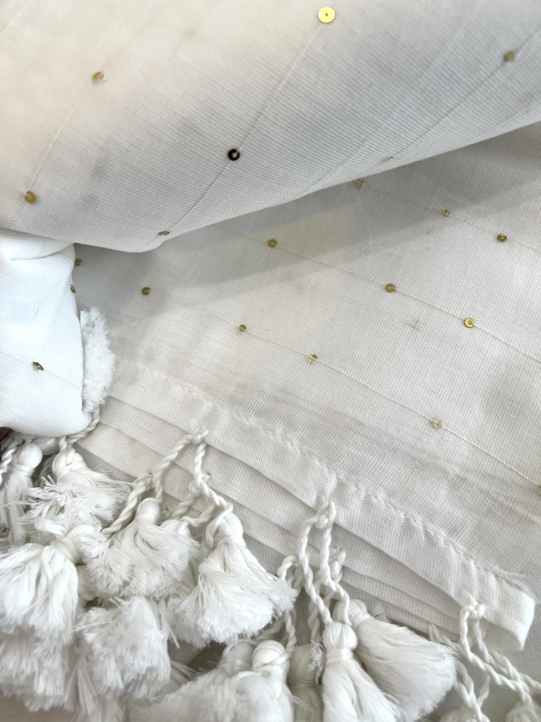 Mulmul cotton saree with tiny sequins on full body and comes with running colour blouse material & pompoms.