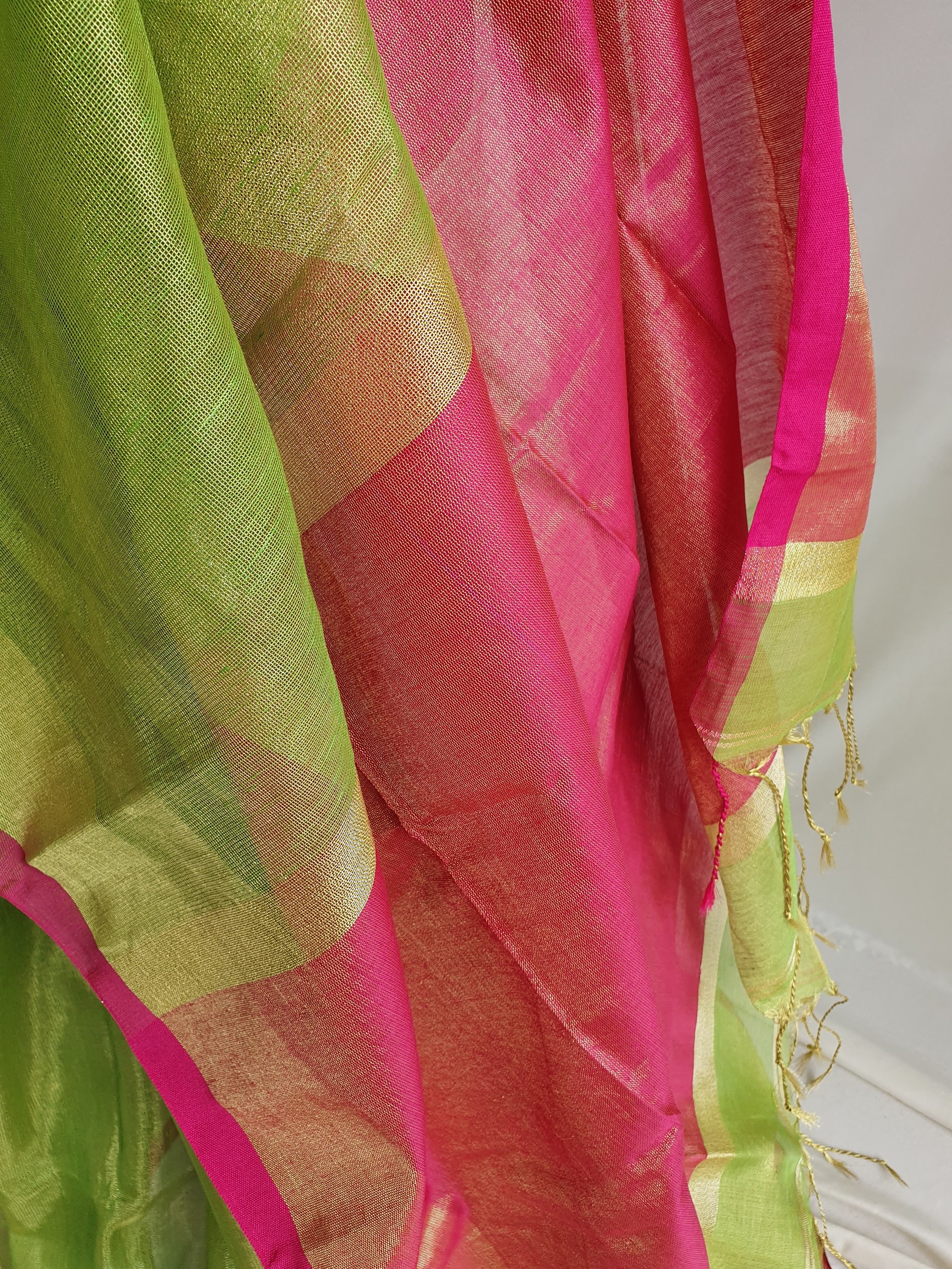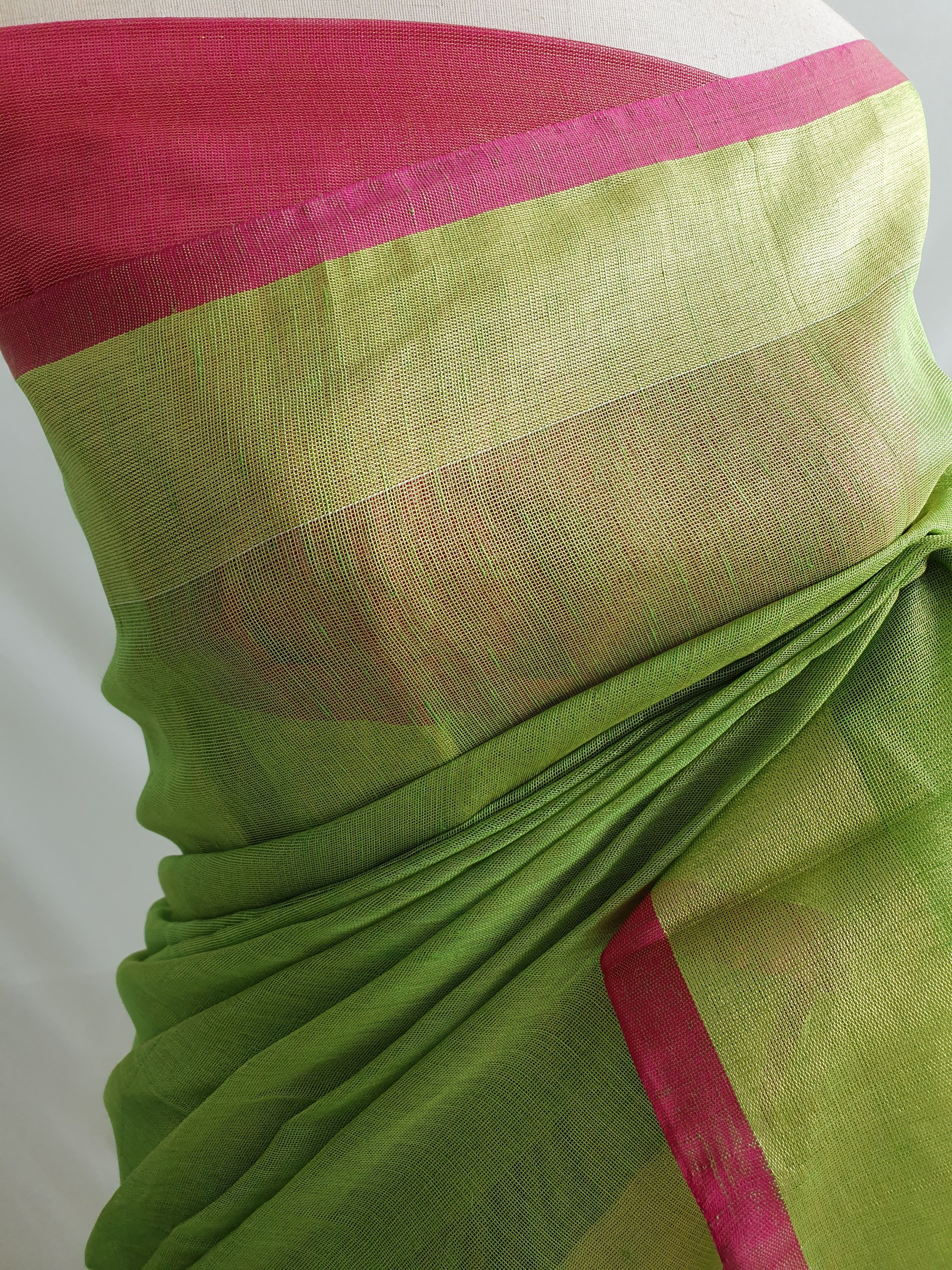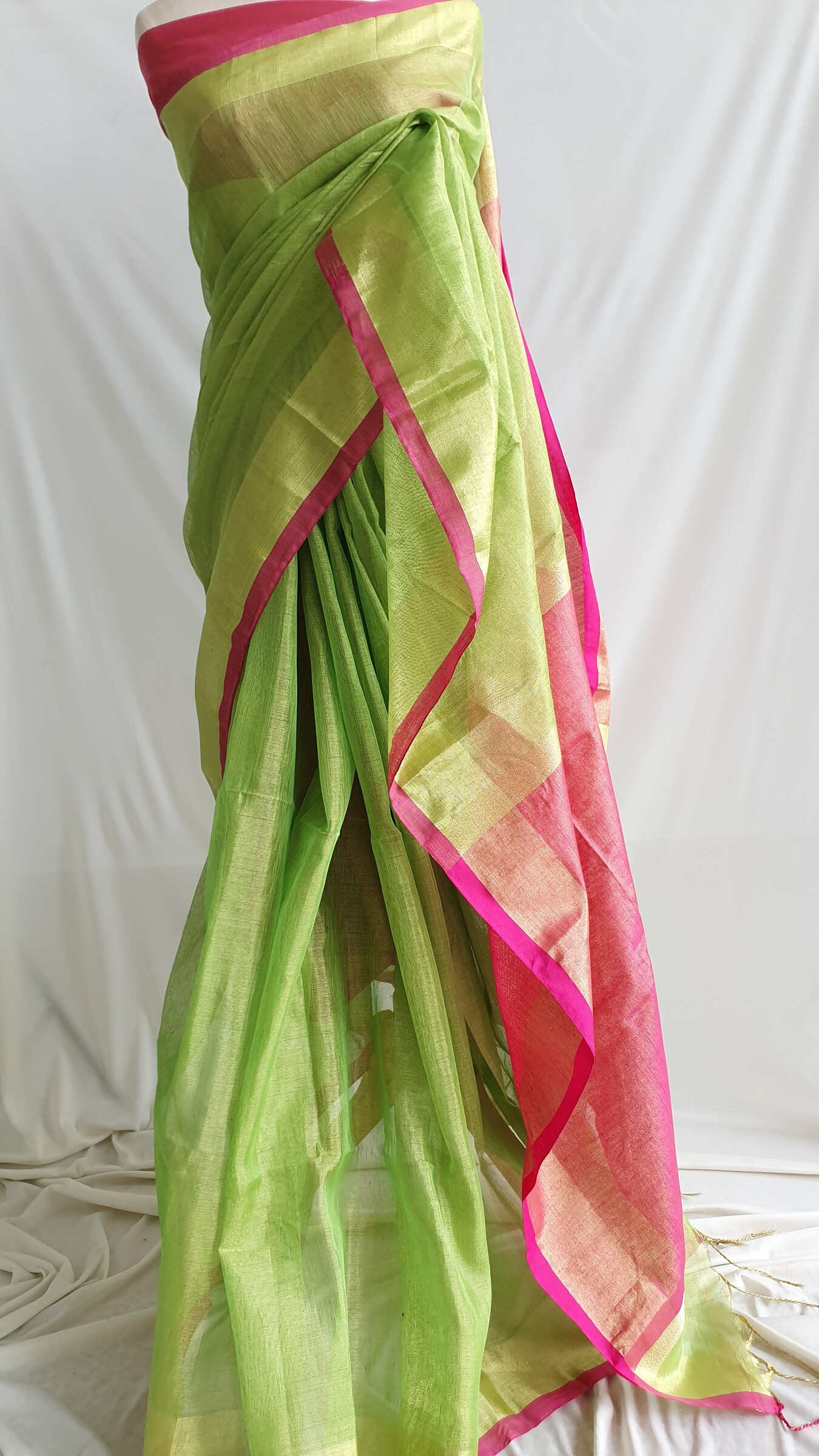 Shimmery apple green tissue linen mix cotton with contrast colour blouse material and pompoms on pallu.