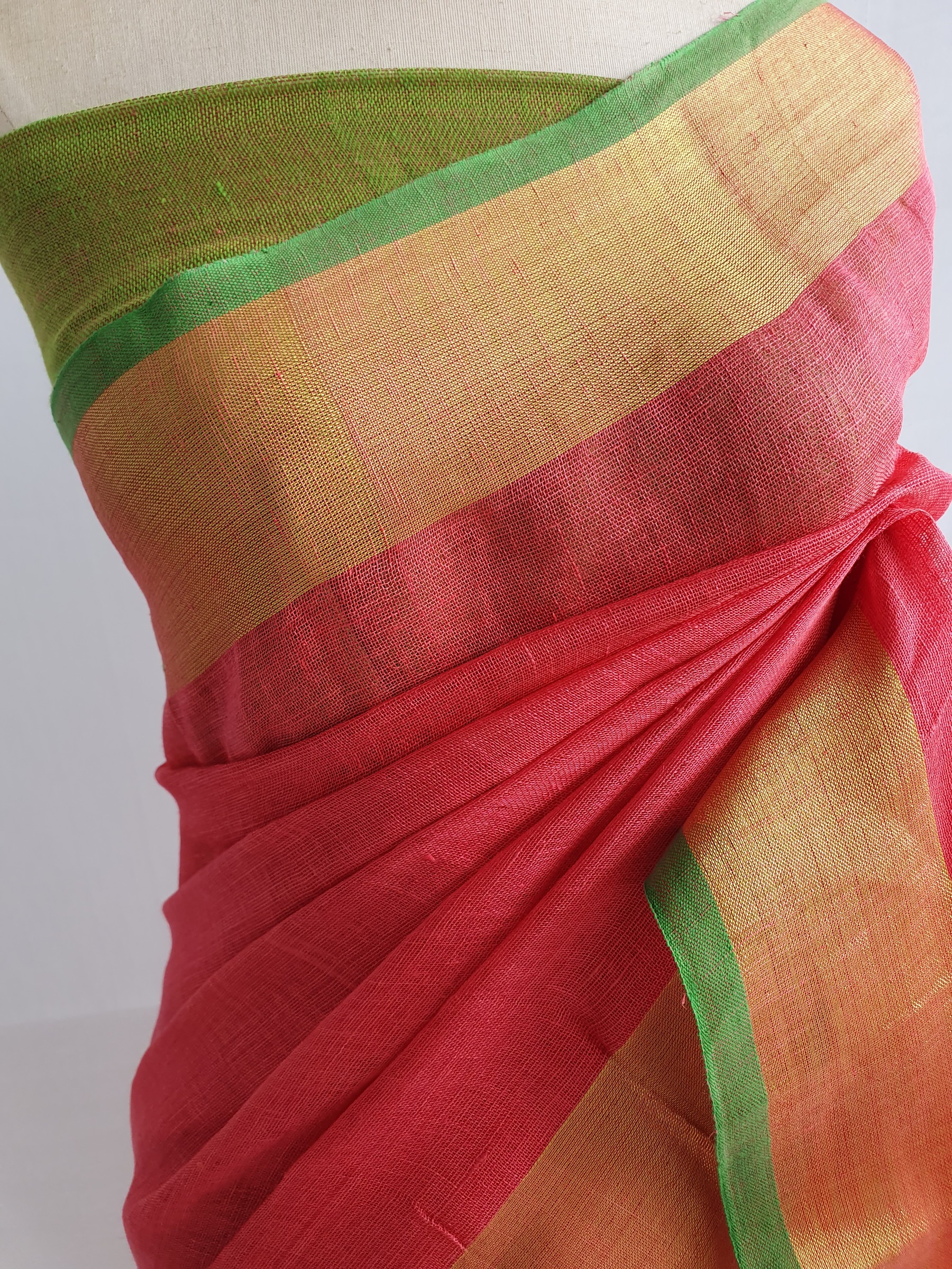 Linen cotton mix saree with gold border and contrast colour blouse material and pompoms on pallu.