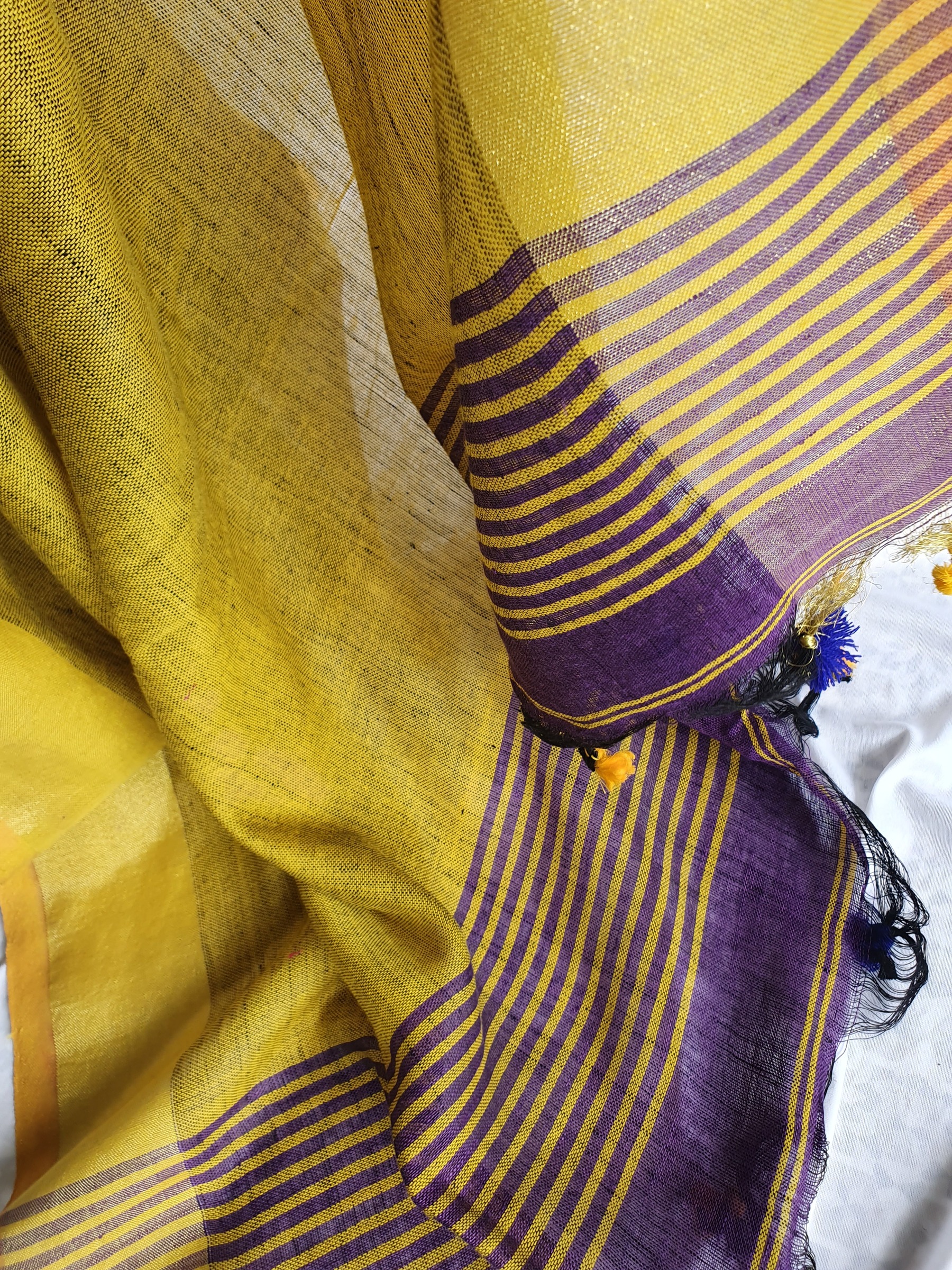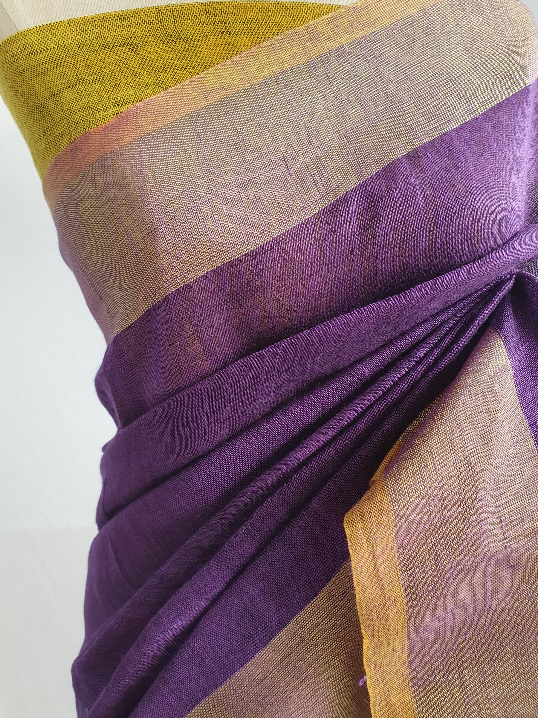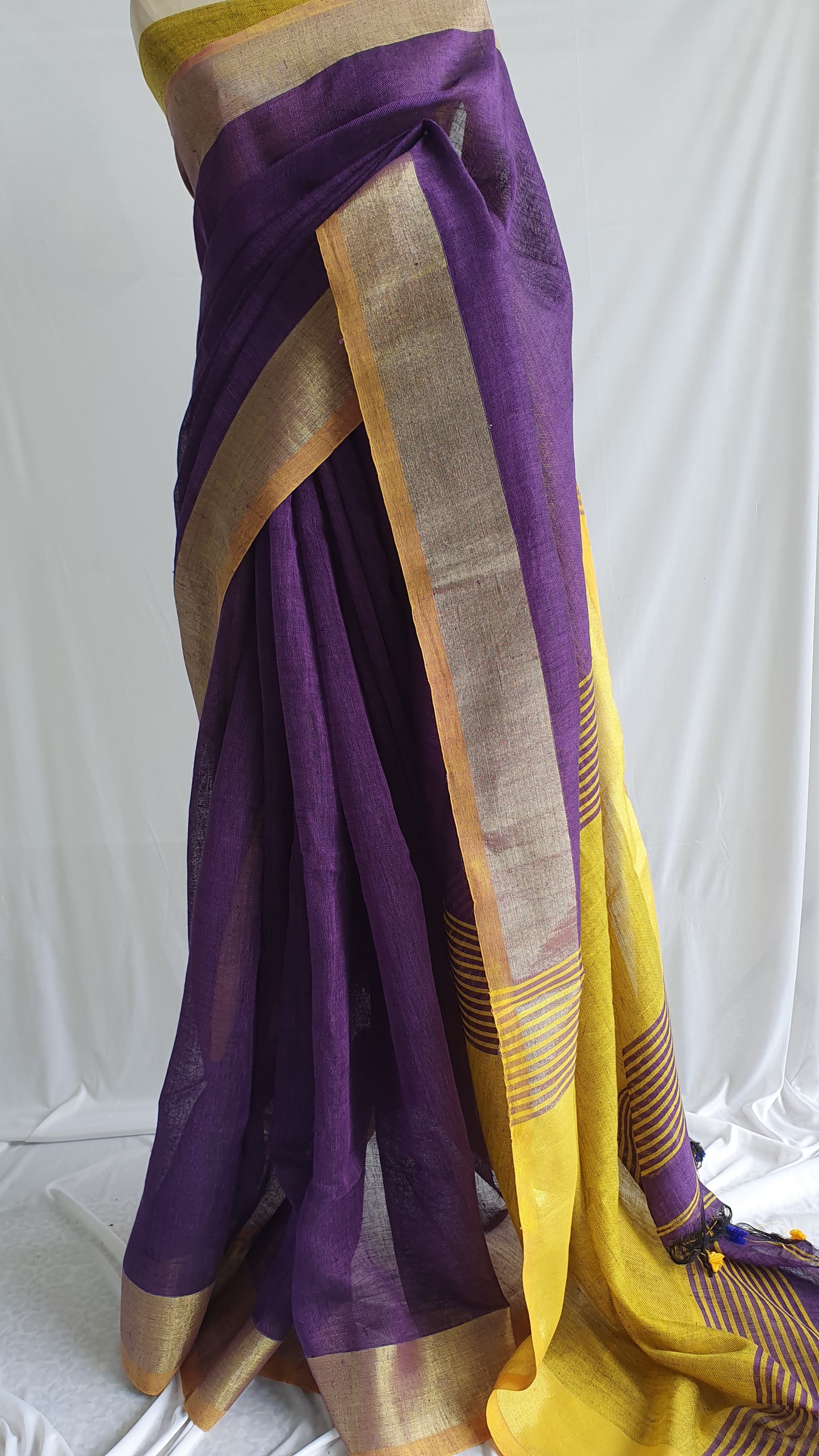 Linen cotton mix saree with gold border and running colour blouse material and pompoms on pallu.